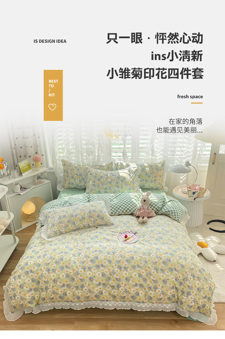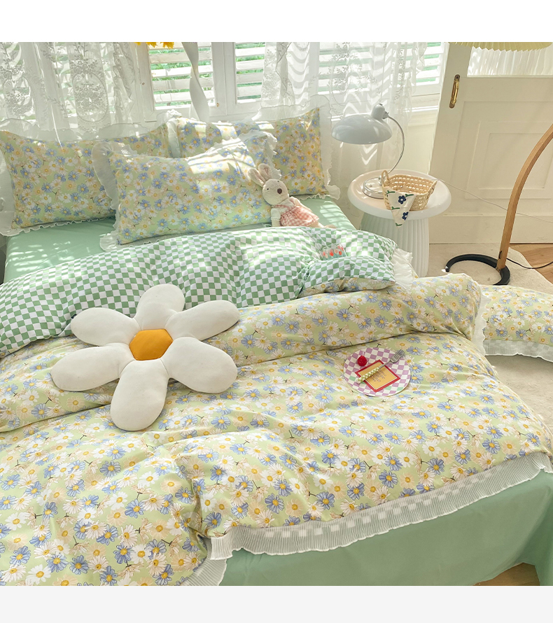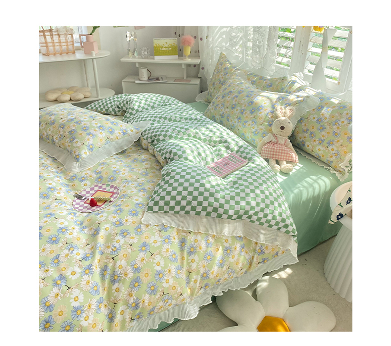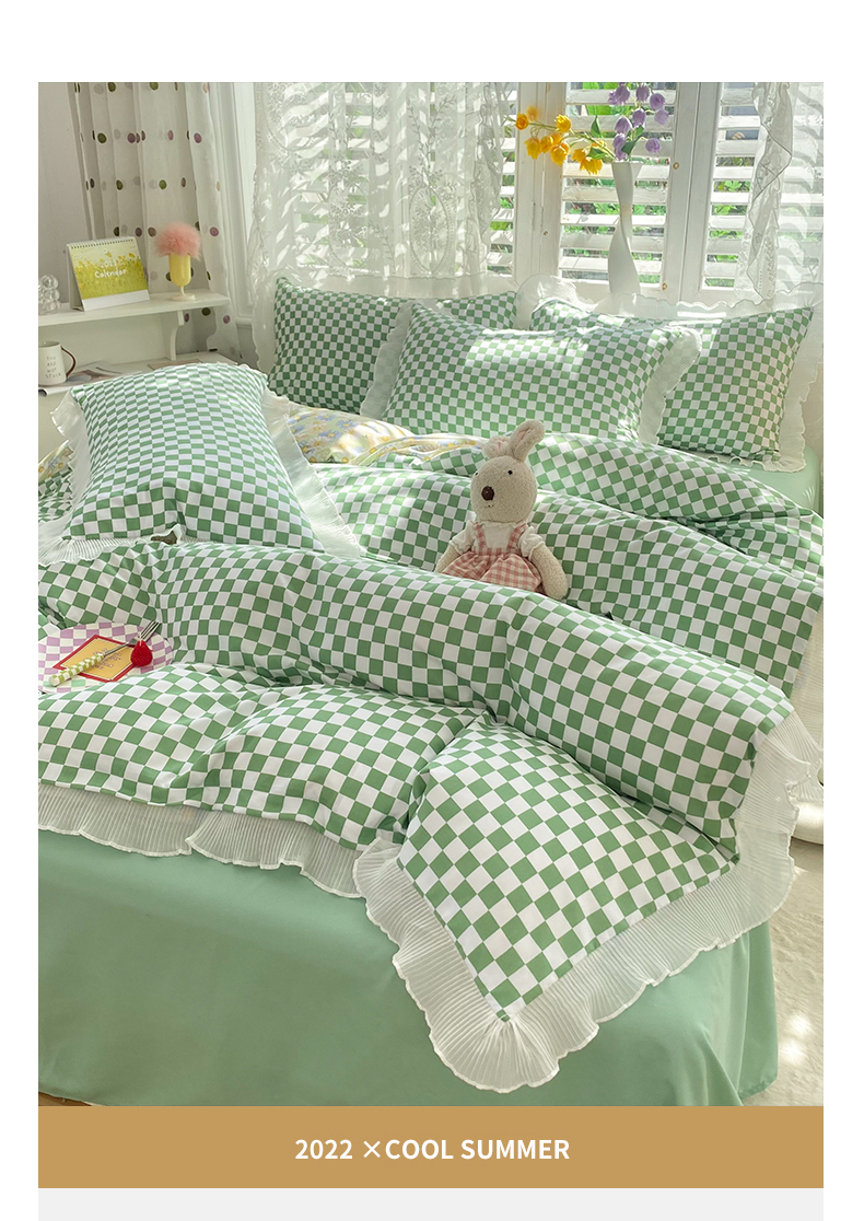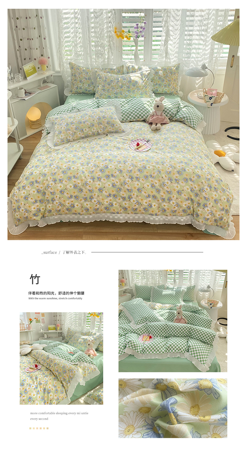 大米家居2024韩版公主风小雏菊棋盘格雪纺花边海岛棉四件套 竹(绿色)