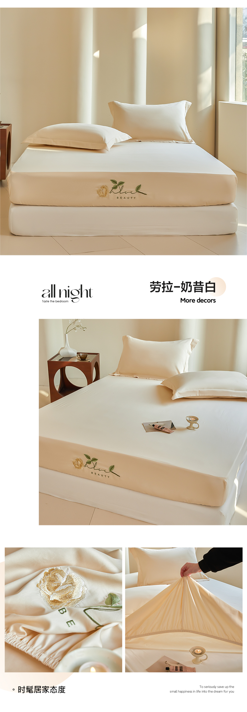 秀色家纺 2025新款A类50支贡缎长绒棉刺绣床笠 唤醒系列-劳拉 劳拉-奶昔白