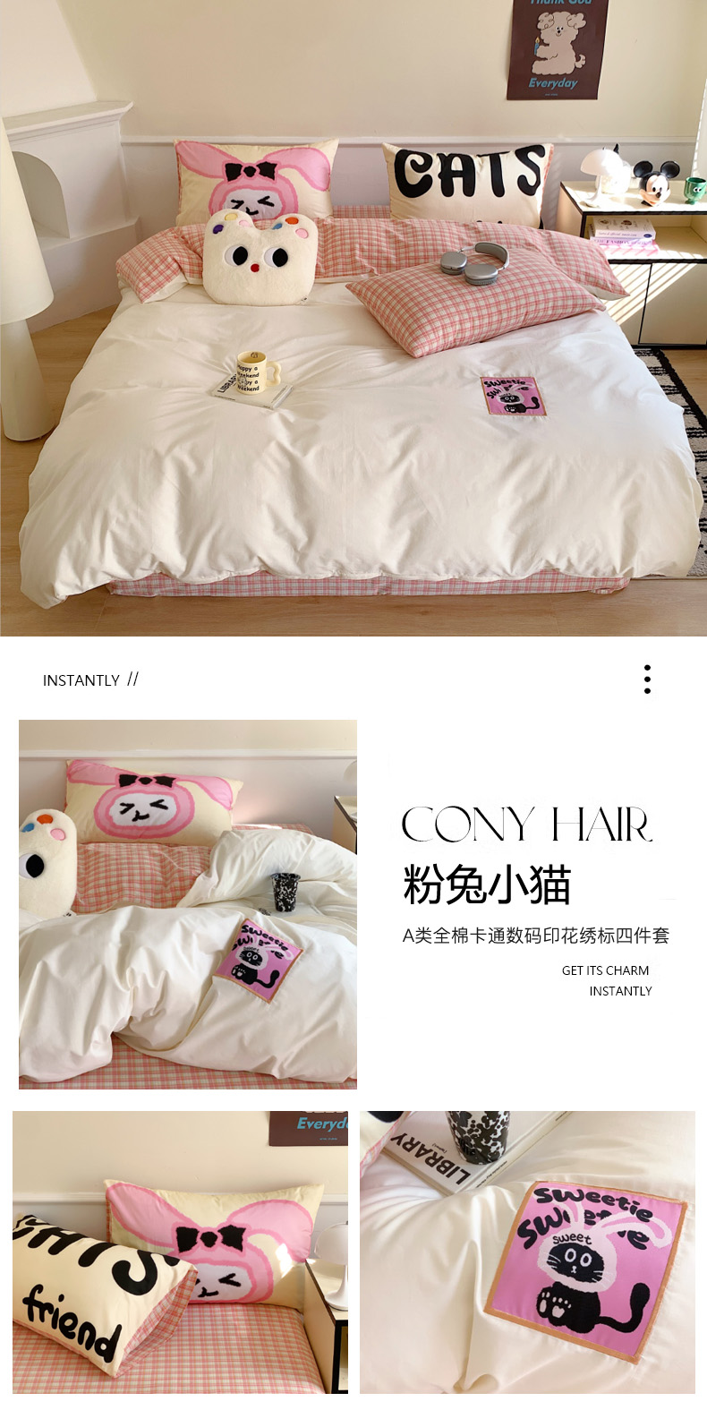 当前位置: 91家纺网 > 商品网购 > 床品套件 > 四件套 > 全棉普通四件套 > 柠馨 2024新款全棉卡通数码印花绣标系列四件套 粉兔小猫