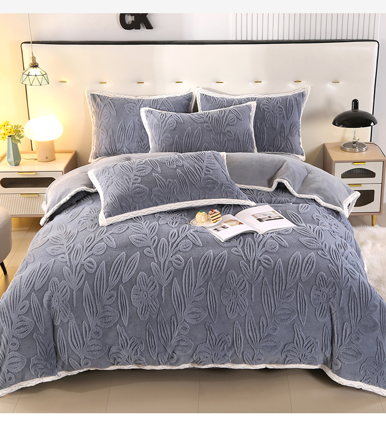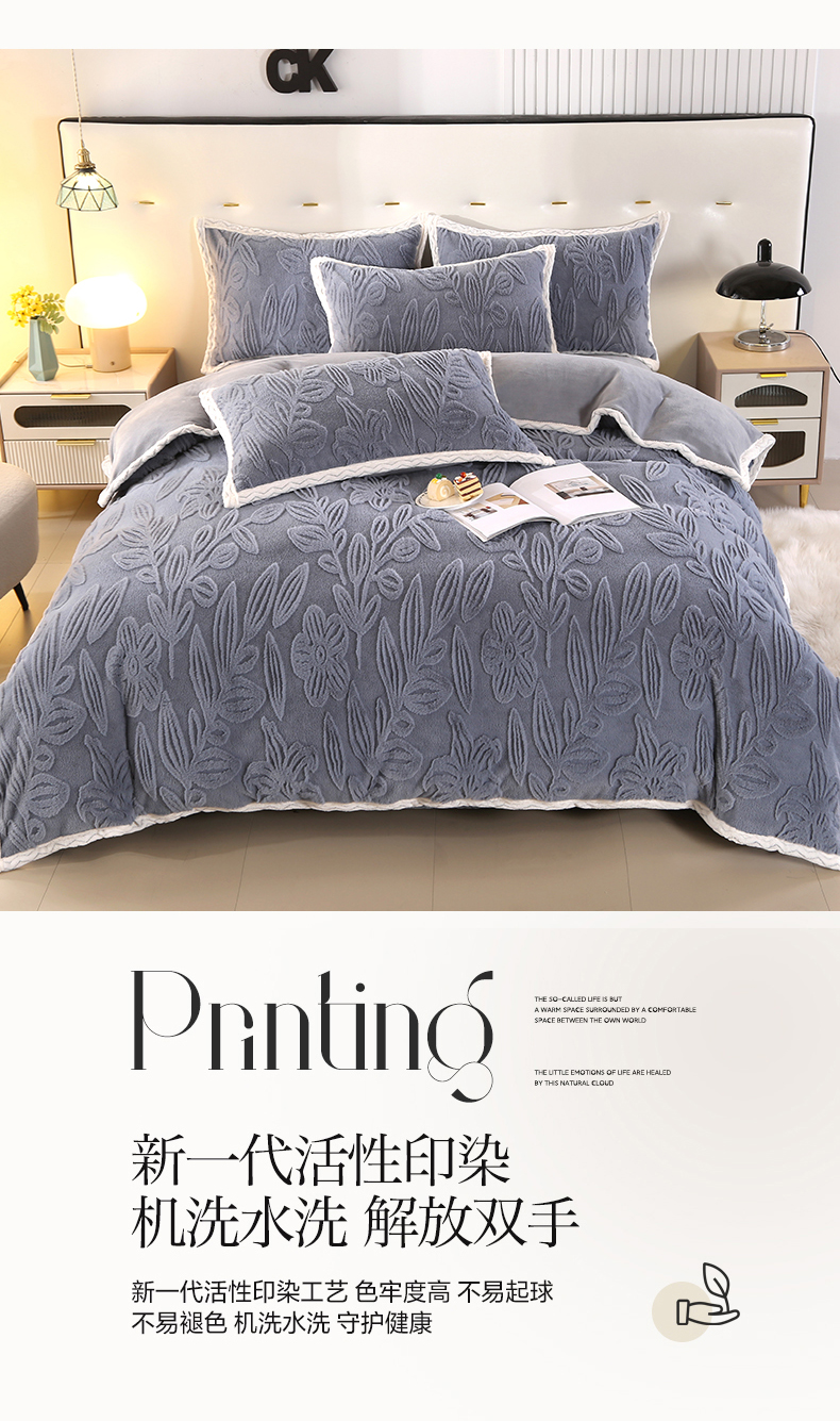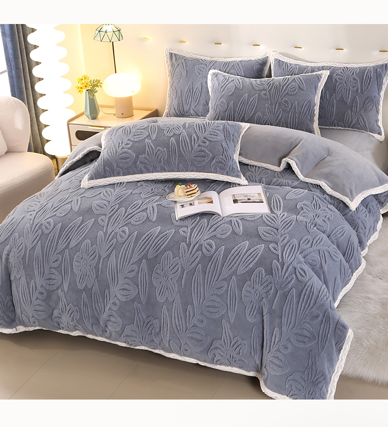 芸锦豪2024新款花团雕花兔毛绒兔兔绒四件套 蓝灰