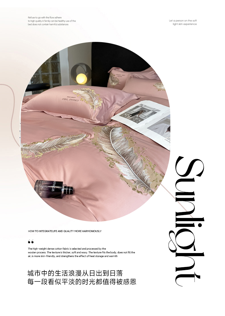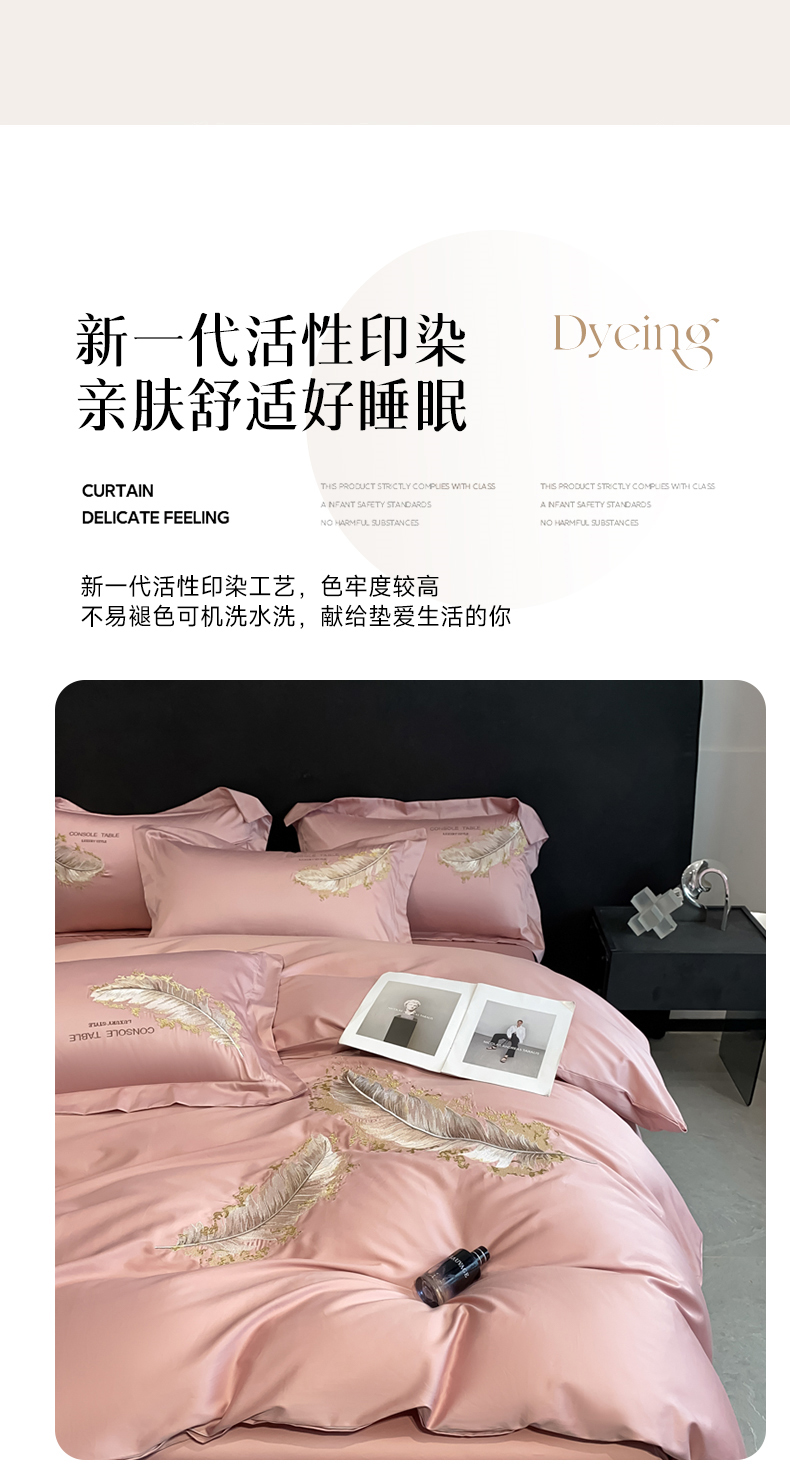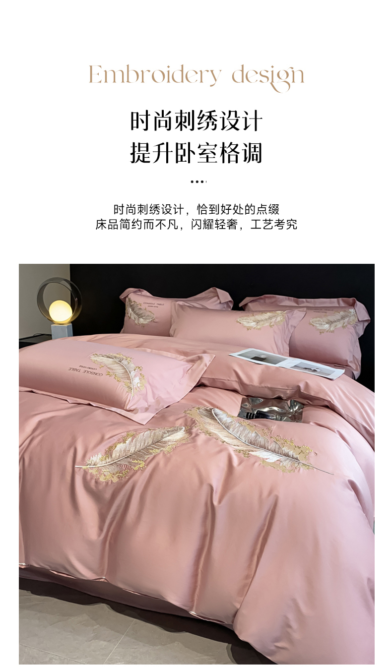 首尔家纺 2024新款全棉刺绣四件套 凤羽-粉豆沙