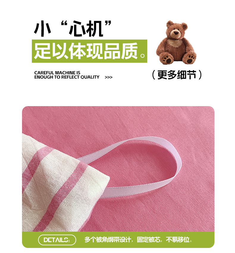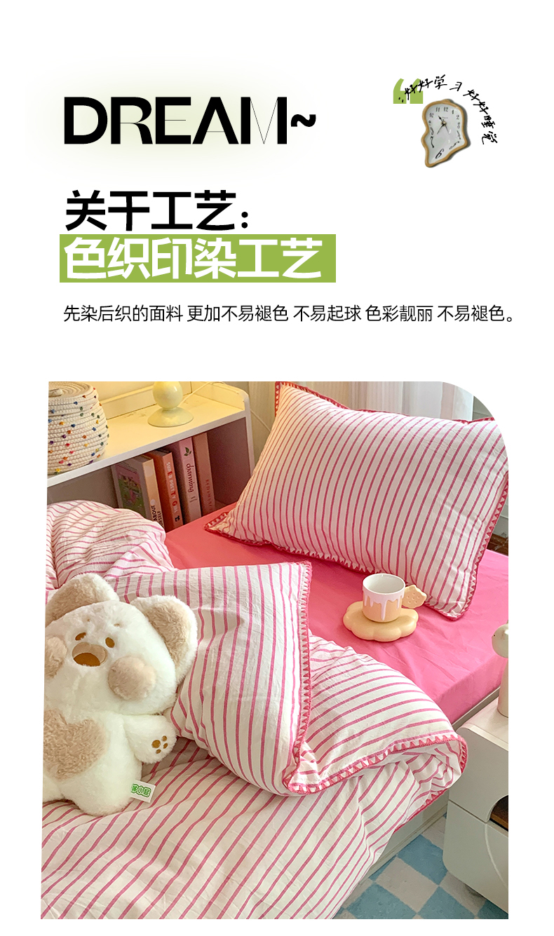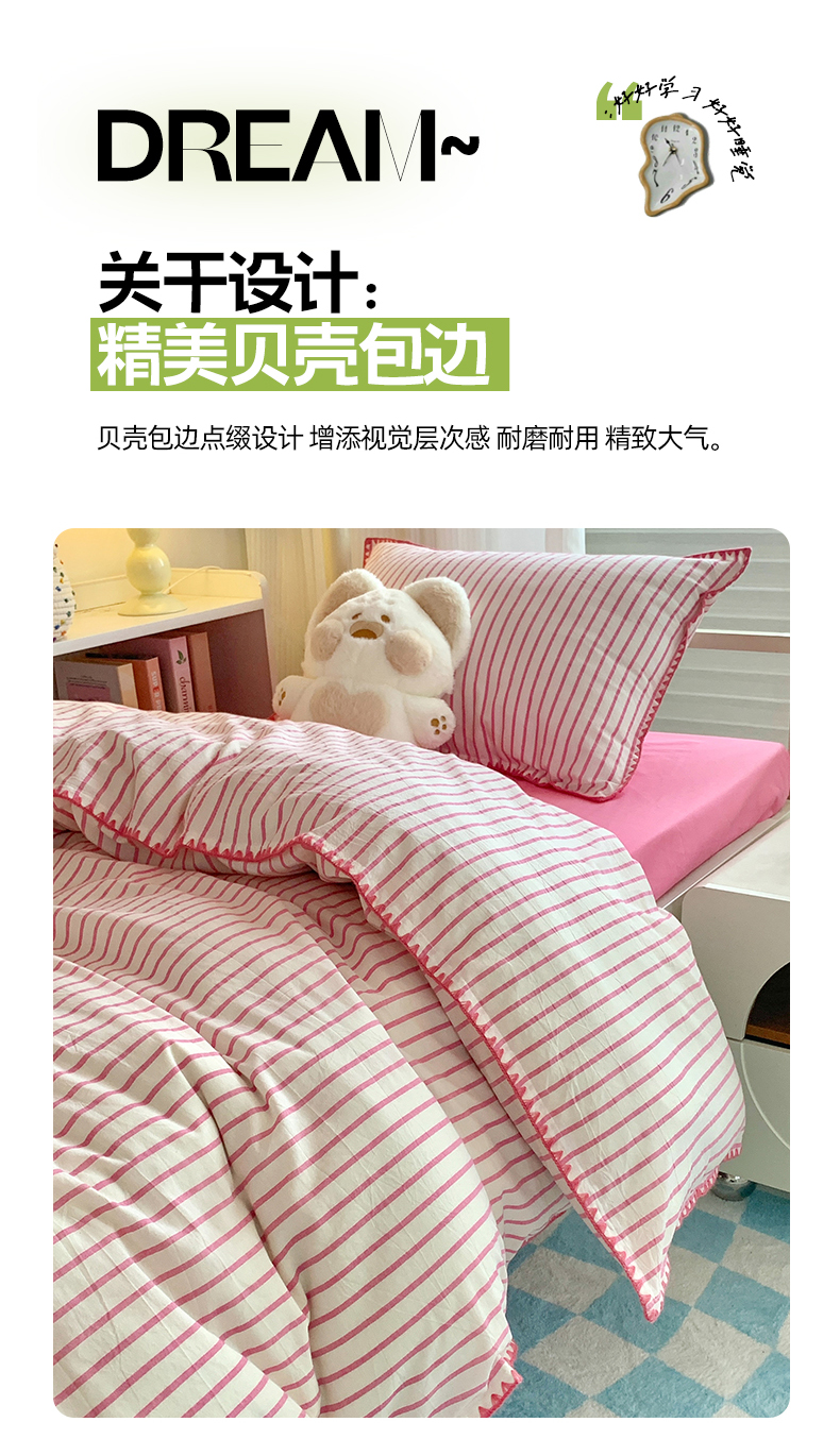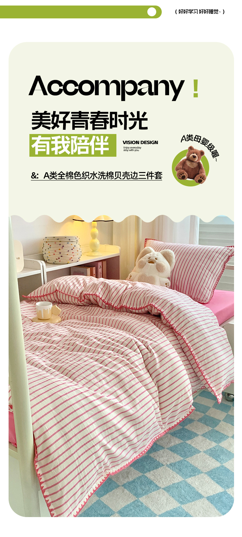 商品名称:莱茵家居 2024新款A类全棉色织水洗棉贝壳边三件套 蜜桃粉细条