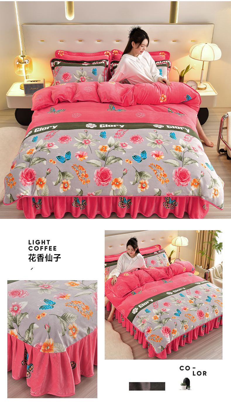 馨梦缘 2025直播爆款8.5斤牛奶绒四件套加厚保暖床裙金貂绒 静若繁花 粉,静若繁花 粉