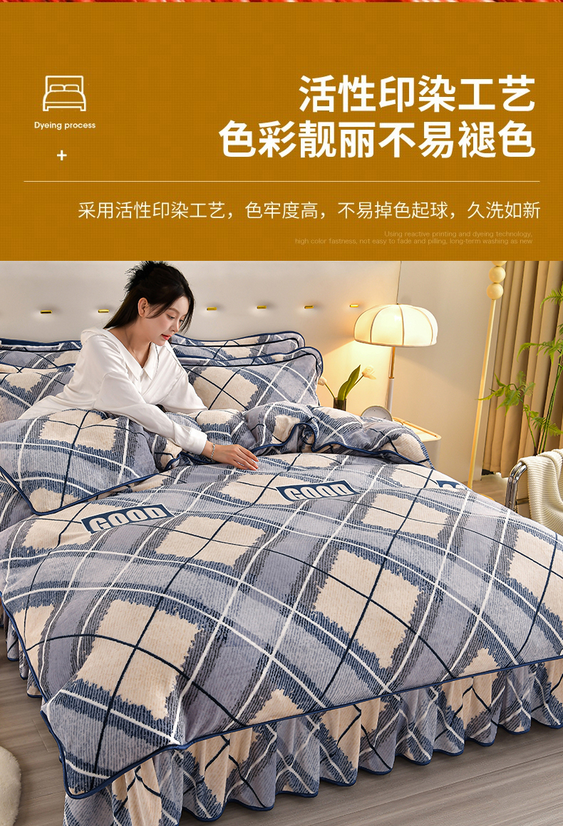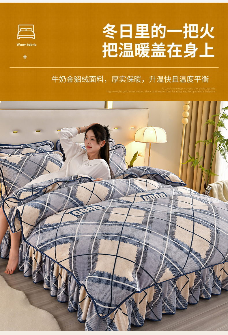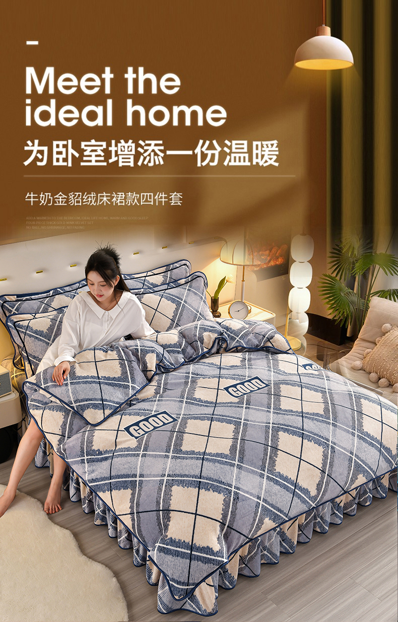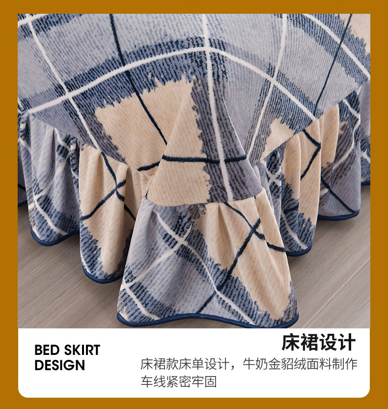 商品名称:馨梦缘 2025新款小包边款牛奶绒8.5斤高克重牛奶绒金雕绒床裙款四件套 英伦时尚