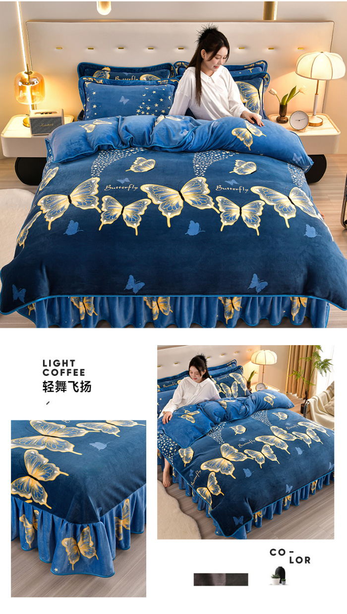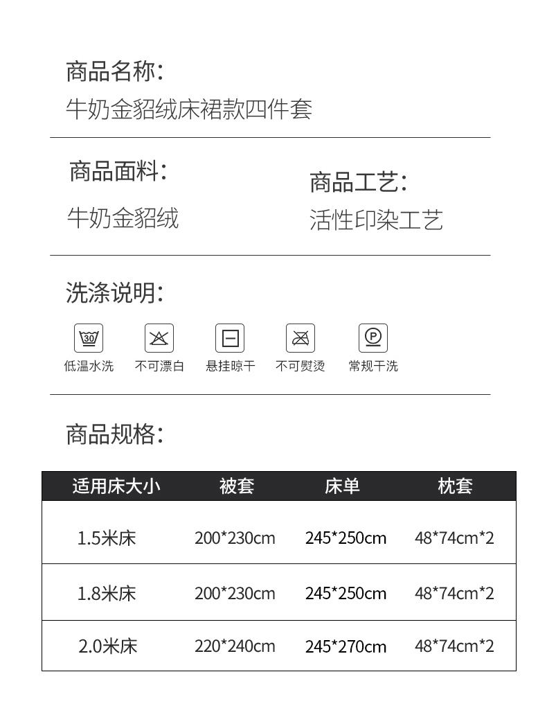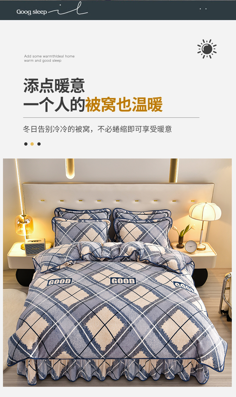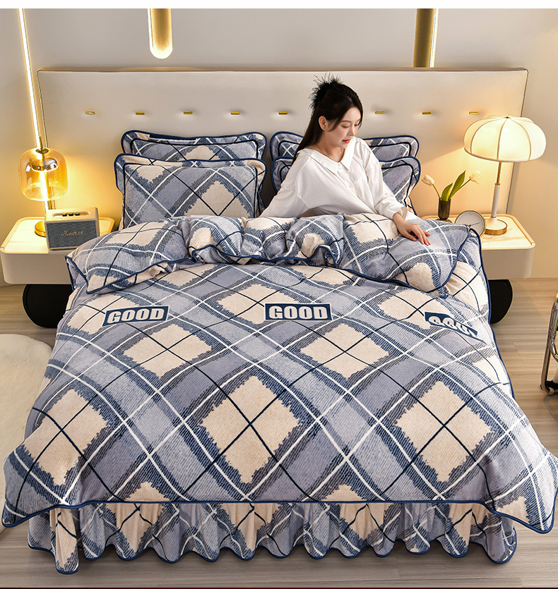 商品名称:馨梦缘 2025新款小包边款牛奶绒8.5斤高克重牛奶绒金雕绒床裙款四件套 英伦时尚