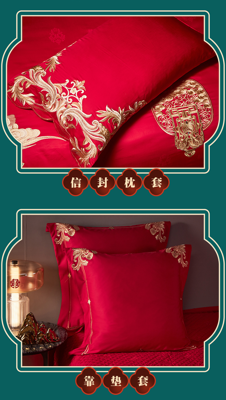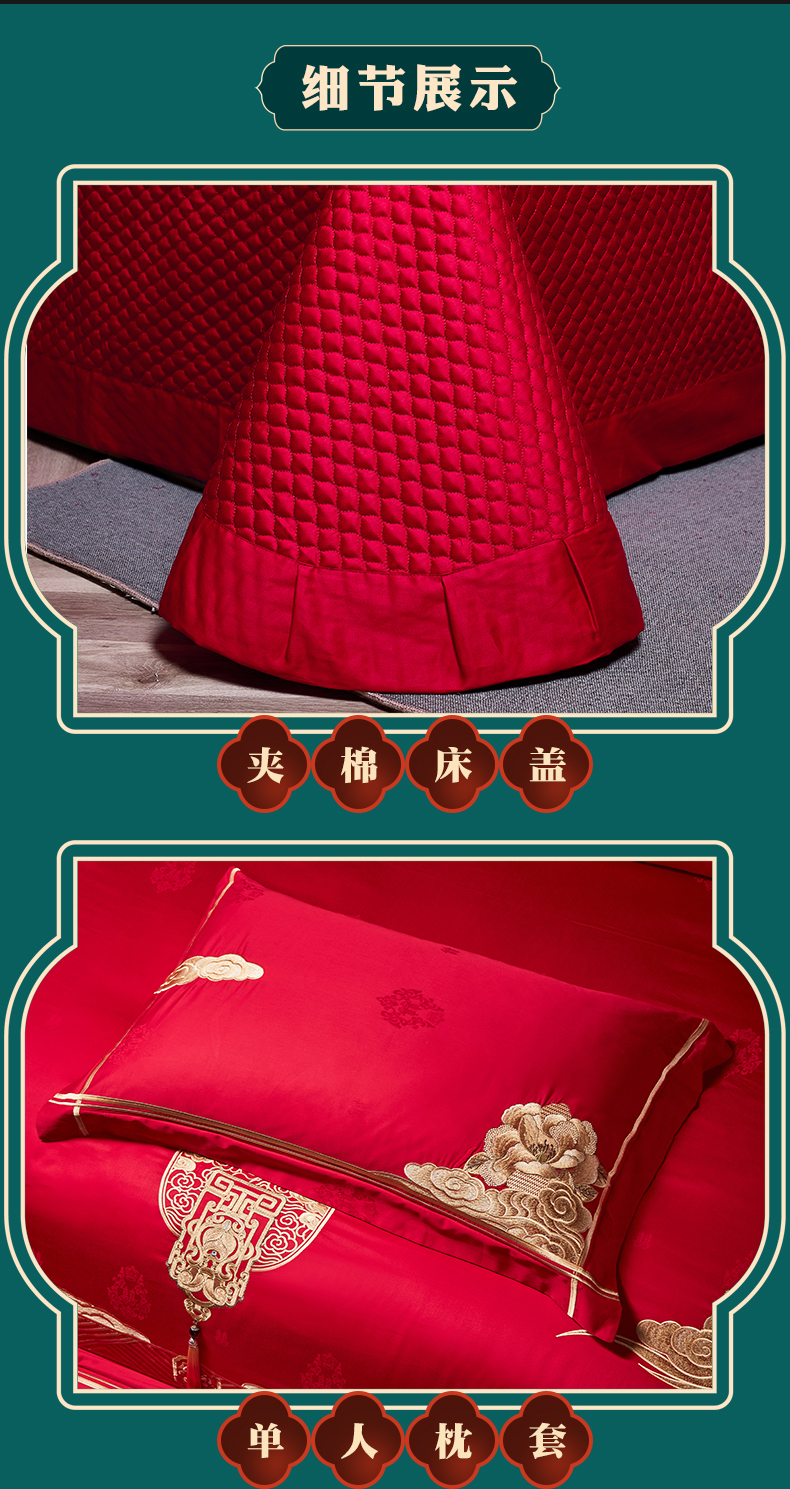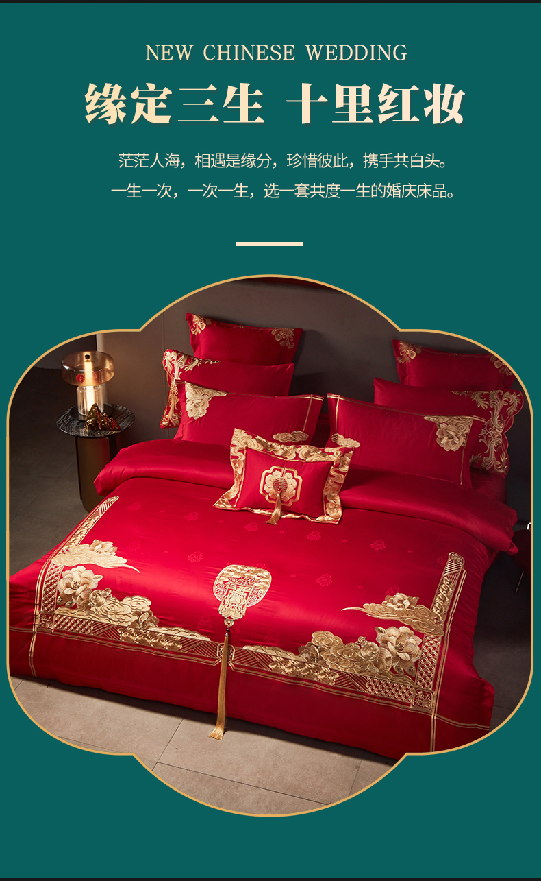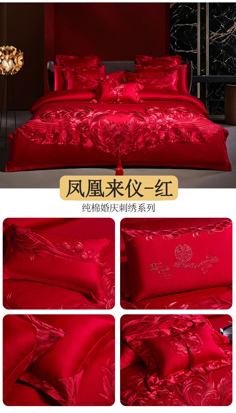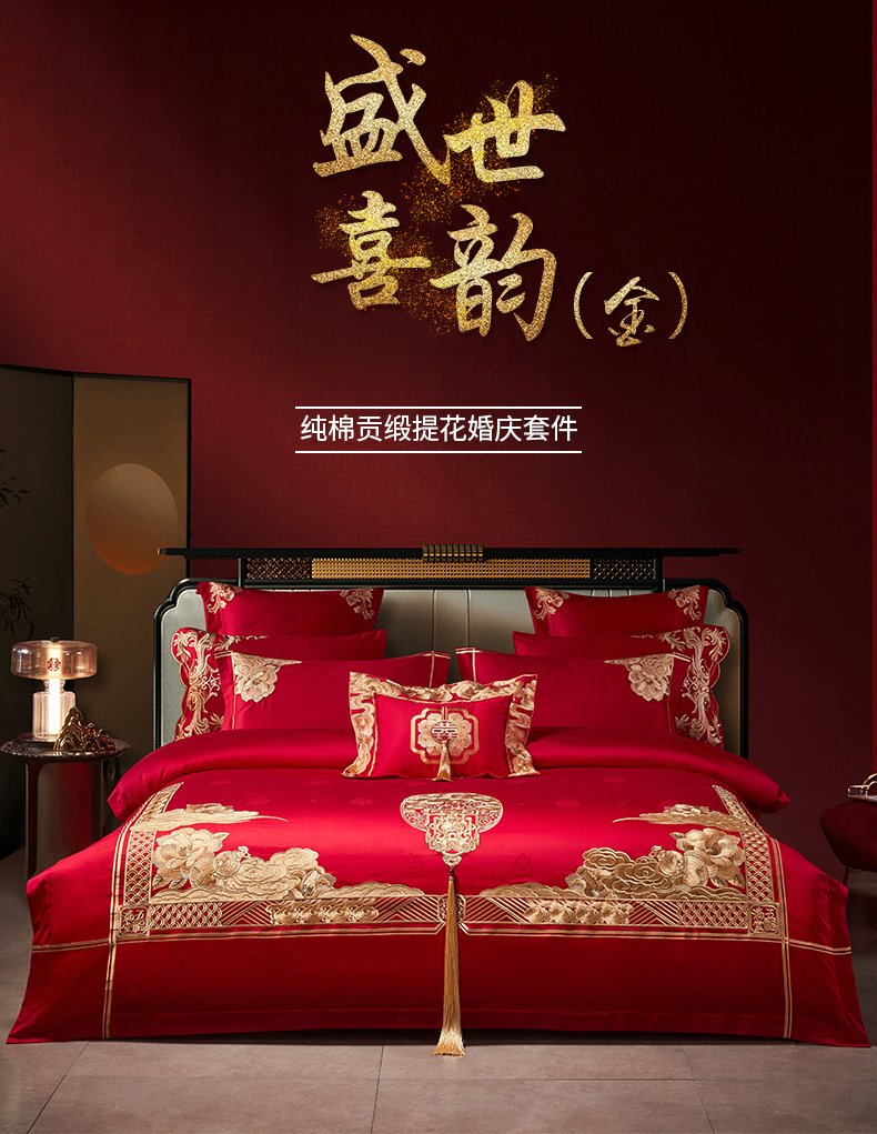 当前位置: 91家纺网 > 商品网购 > 床品套件 > 四件套 > 婚庆四件套 > 宏羽纺家纺 2024新款高支高密纯棉提花婚庆套件系列(控价680) 盛世喜韵