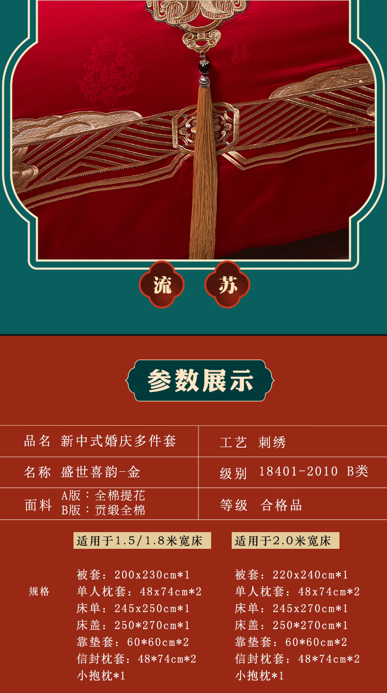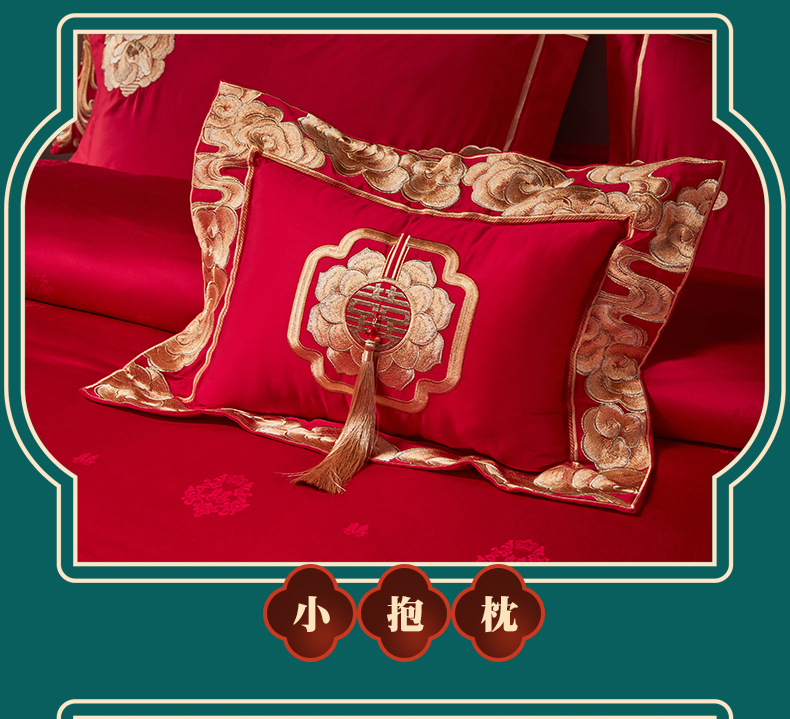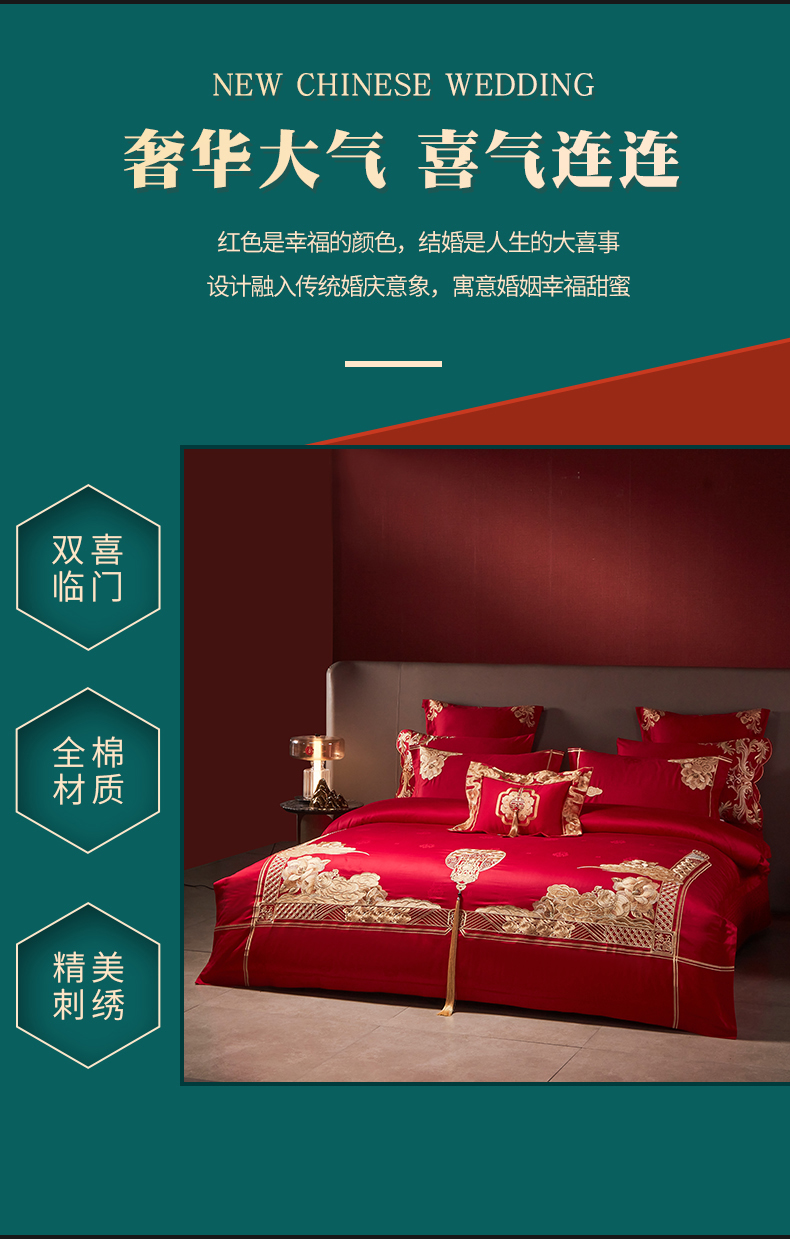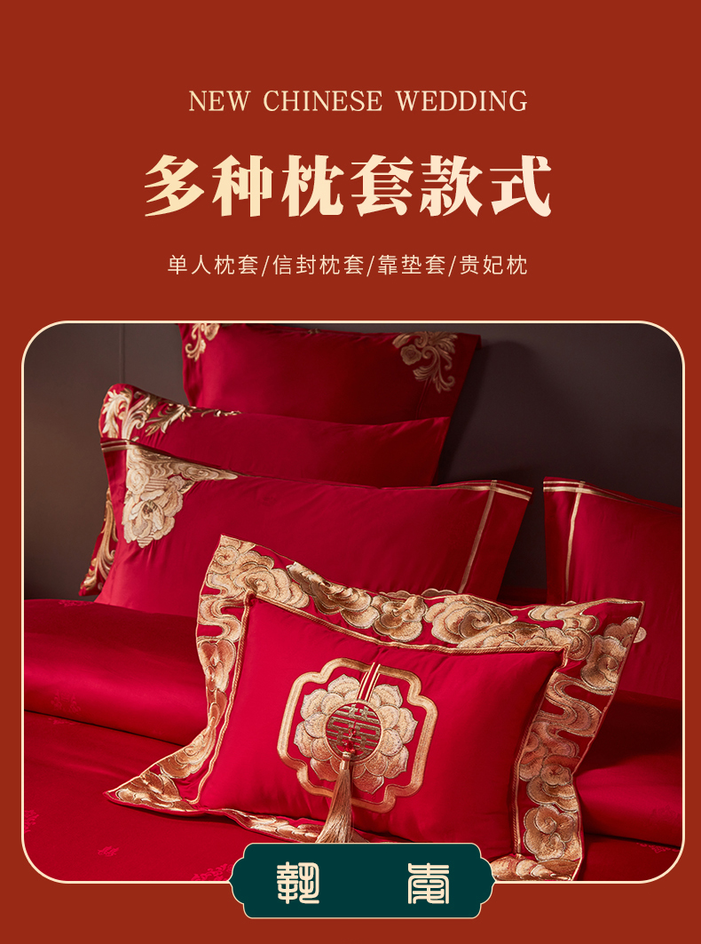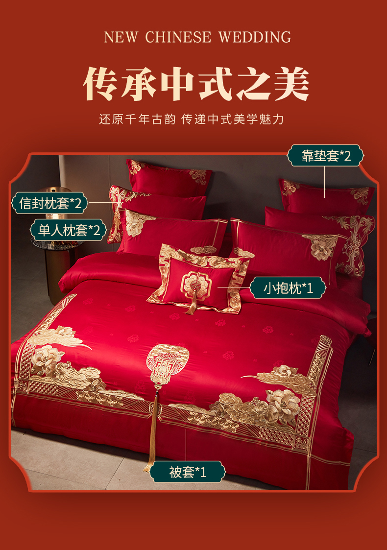 当前位置: 91家纺网 > 商品网购 > 床品套件 > 四件套 > 婚庆四件套 > 宏羽纺家纺 2024新款高支高密纯棉提花婚庆套件系列(控价680) 盛世喜韵