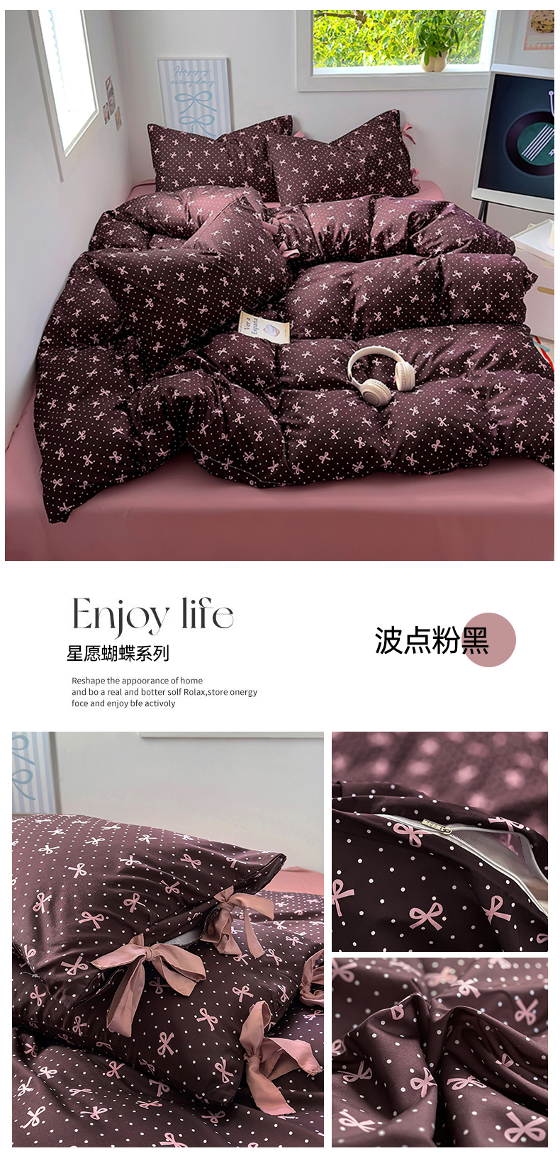 商品名称:春光里 2024新款亲肤棉磨毛印花星愿蝴蝶系列四件套 星愿蝴蝶-波点粉黑
