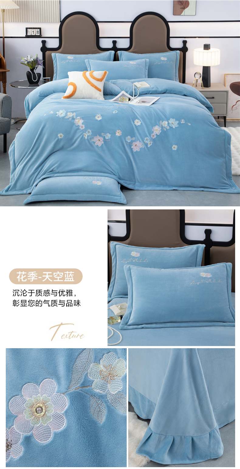 商品名称:优姿家纺 2025新款全消光10斤牛奶绒宽边绣花保暖四件套 花季-天空蓝
