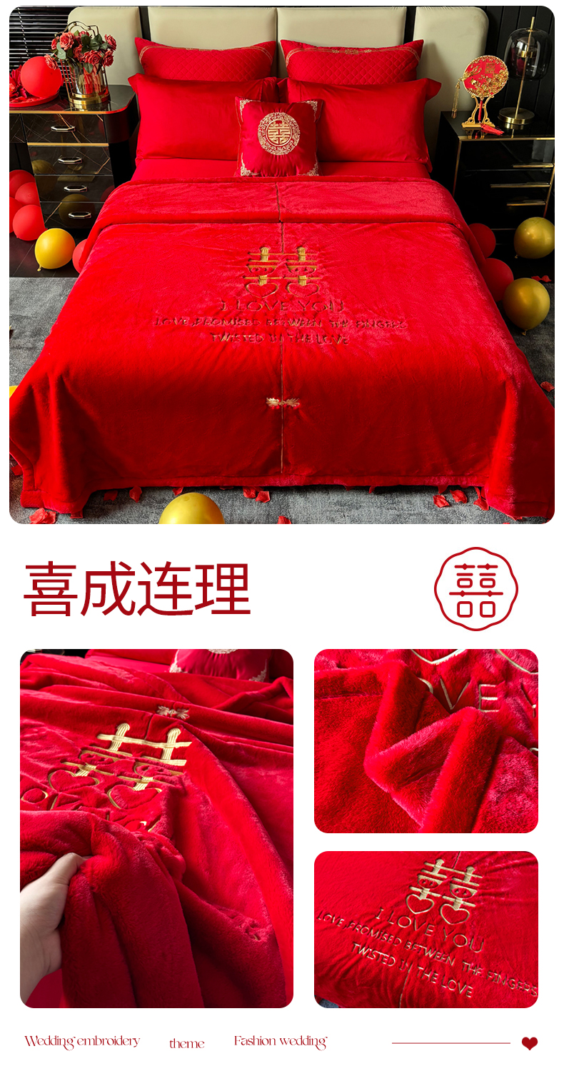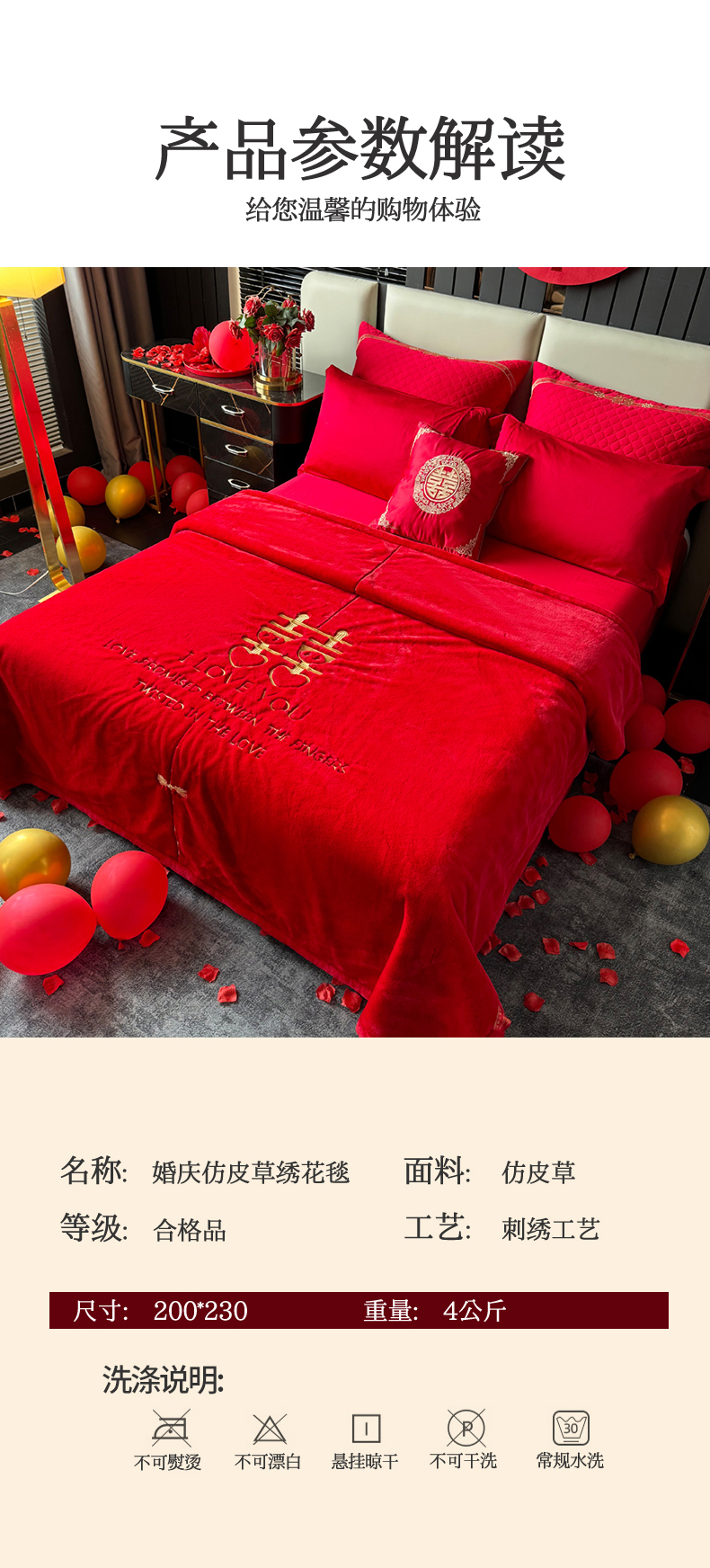 2024新款仿皮草兔绒精品绣花毛毯毯子 喜成连理