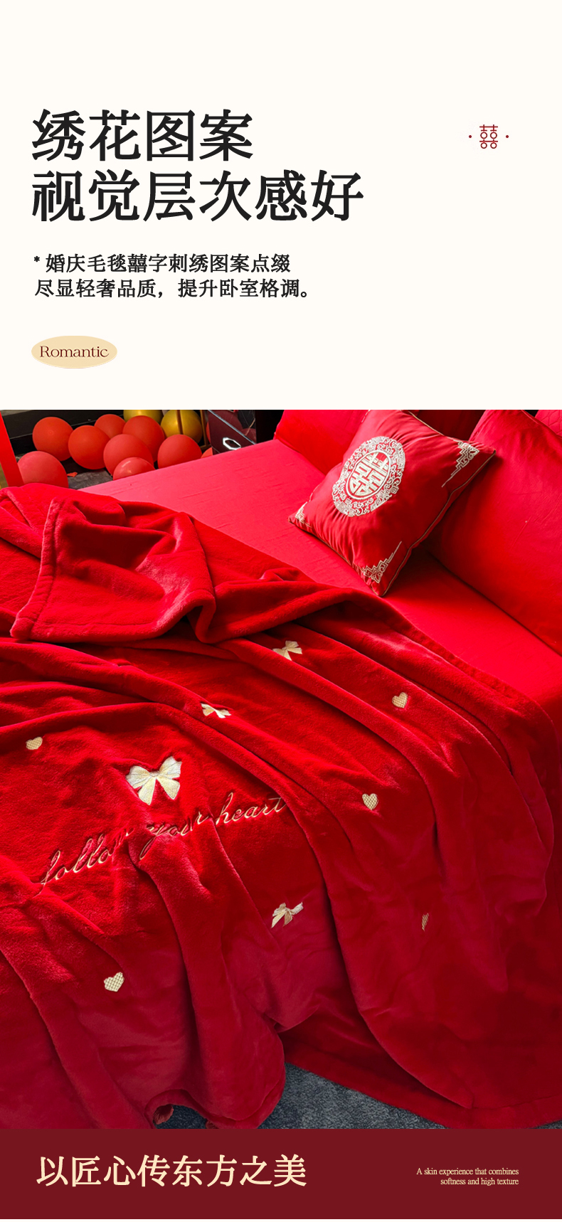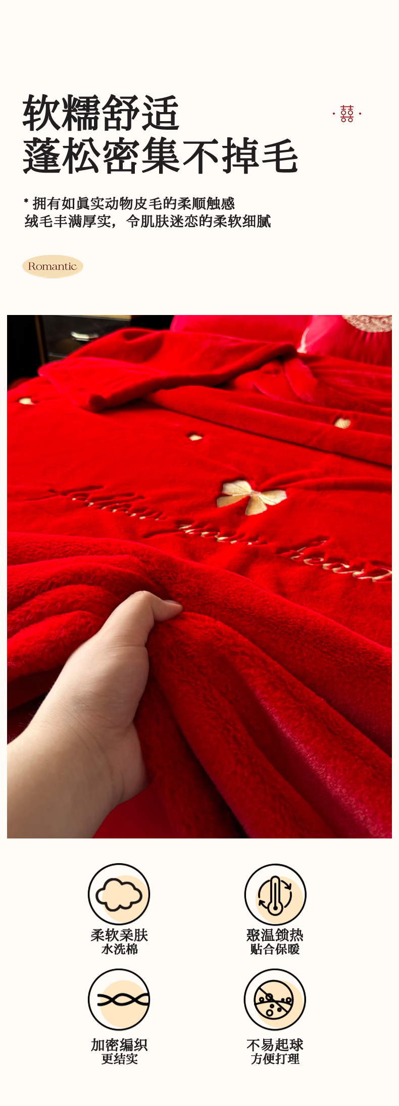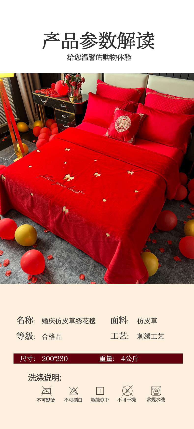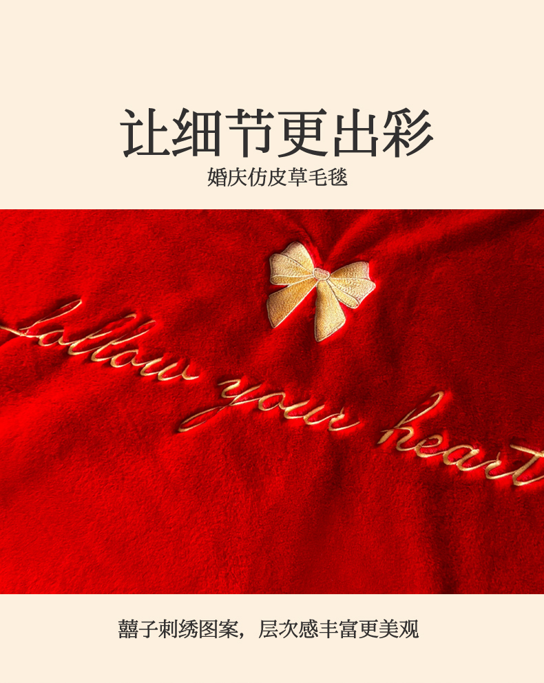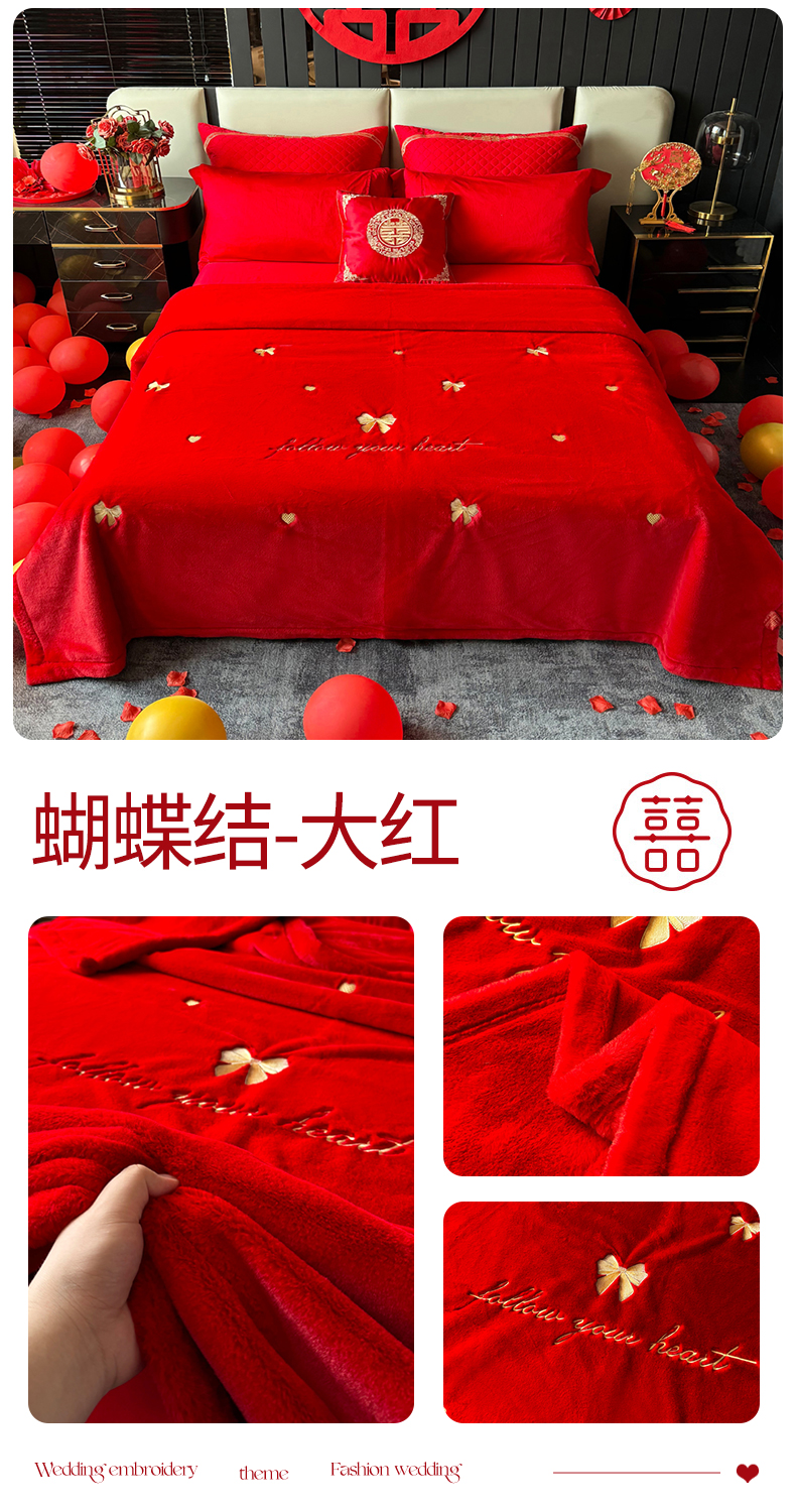 商品名称:2024新款仿皮草兔绒精品绣花毛毯毯子 蝴蝶结-大红