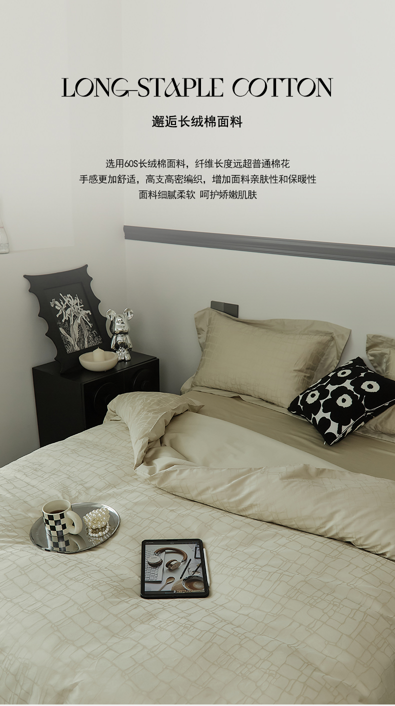 当前位置: 91家纺网 > 商品网购 > 床品套件 > 四件套 > 长绒棉四件套 > 2024新款60支长绒棉提花四件套--漫时光系列(常规版) 漫时光-卡其