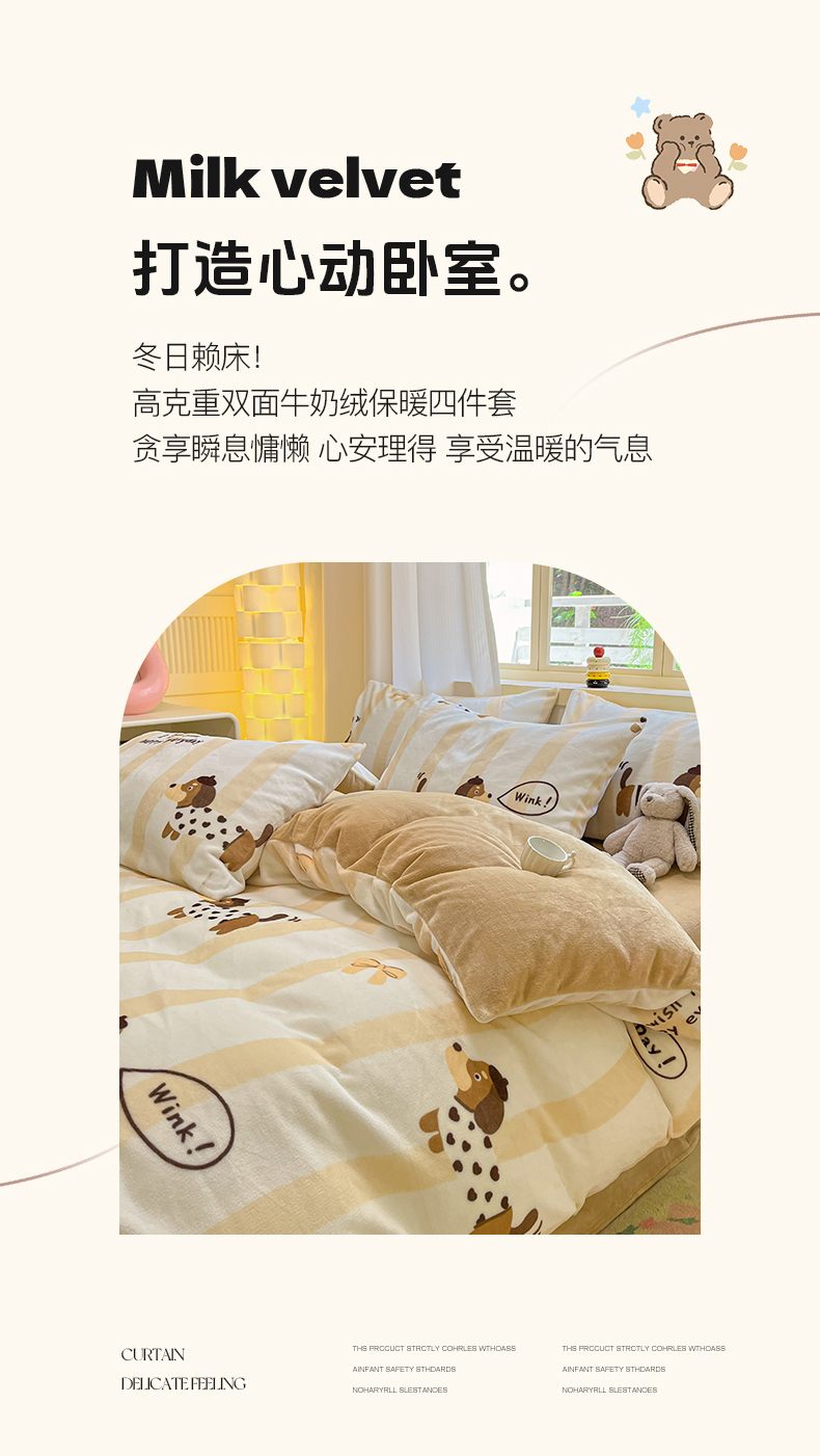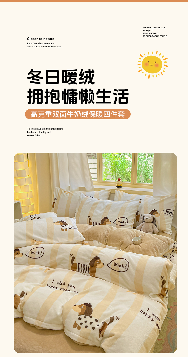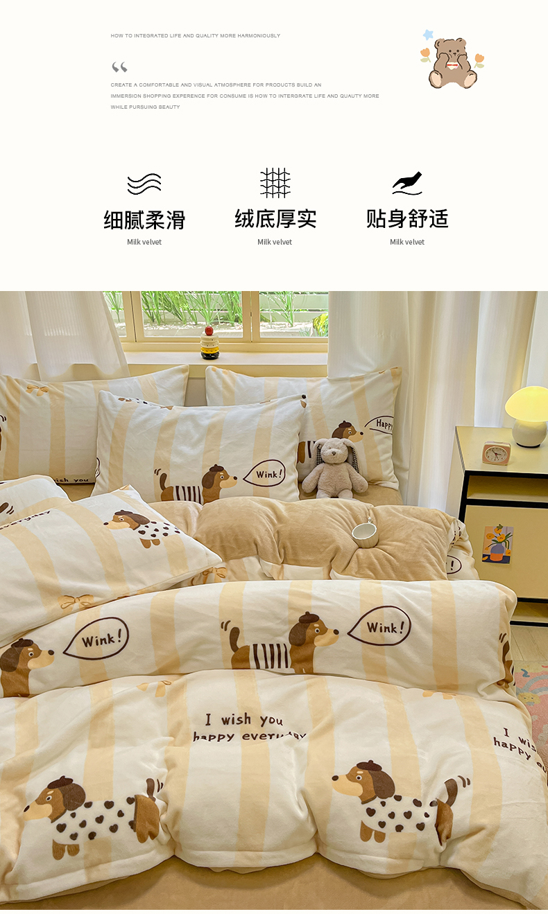 商品名称:铭宣家居 2024新款7斤小清新高克重牛奶绒印花四件套床单床笠款 腊肠狗