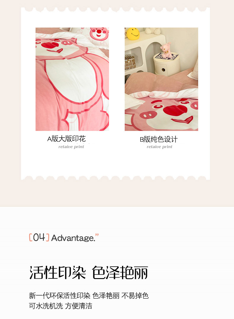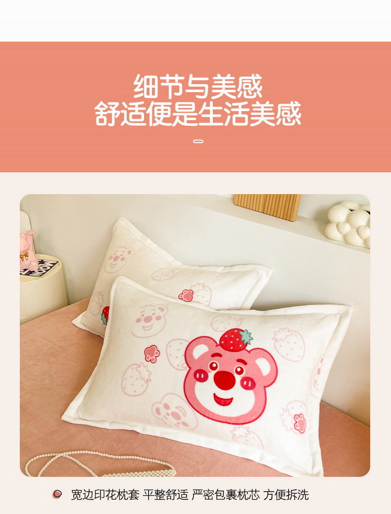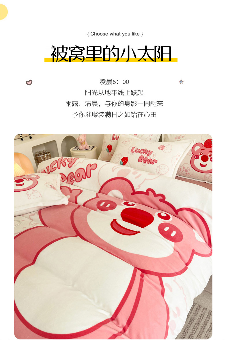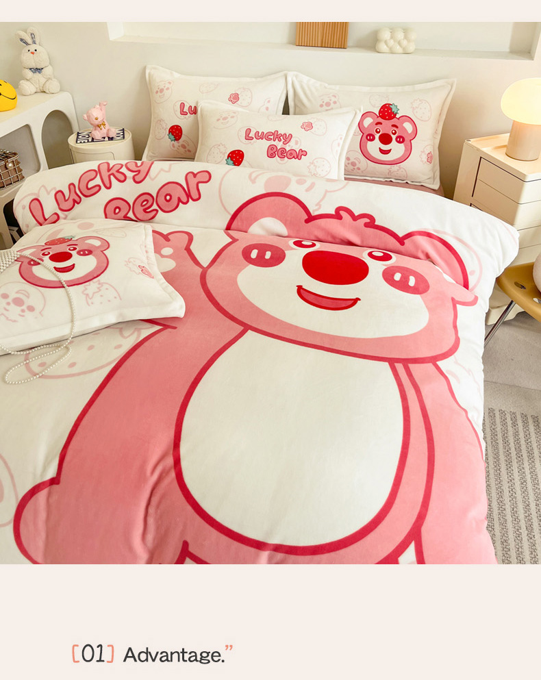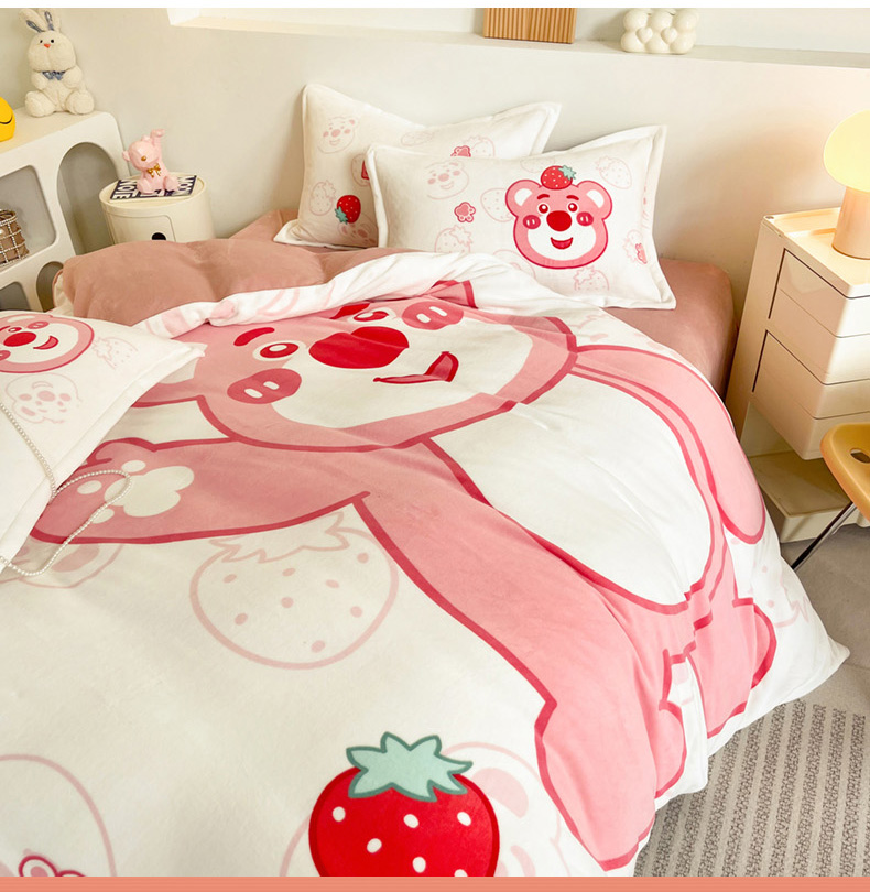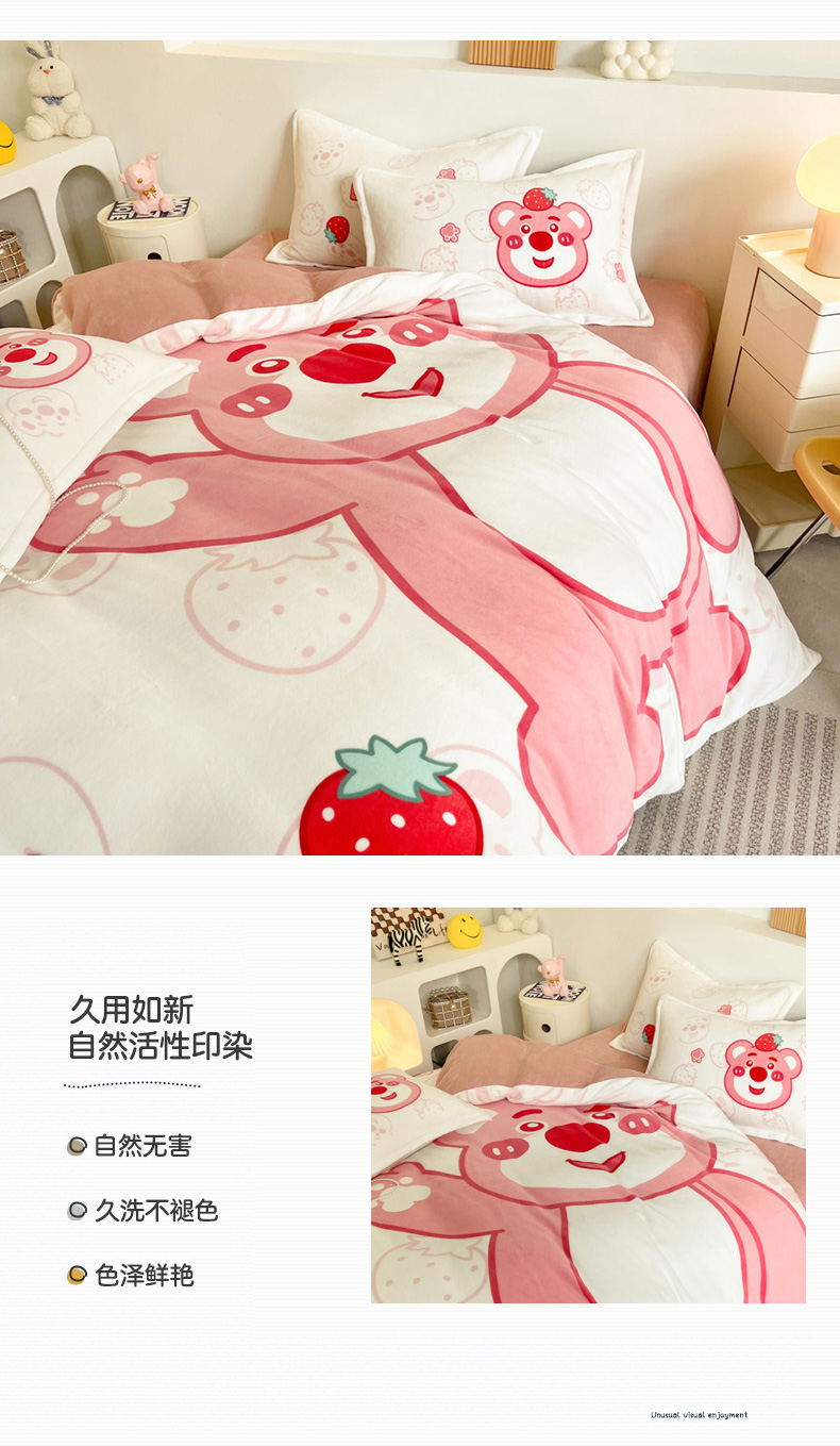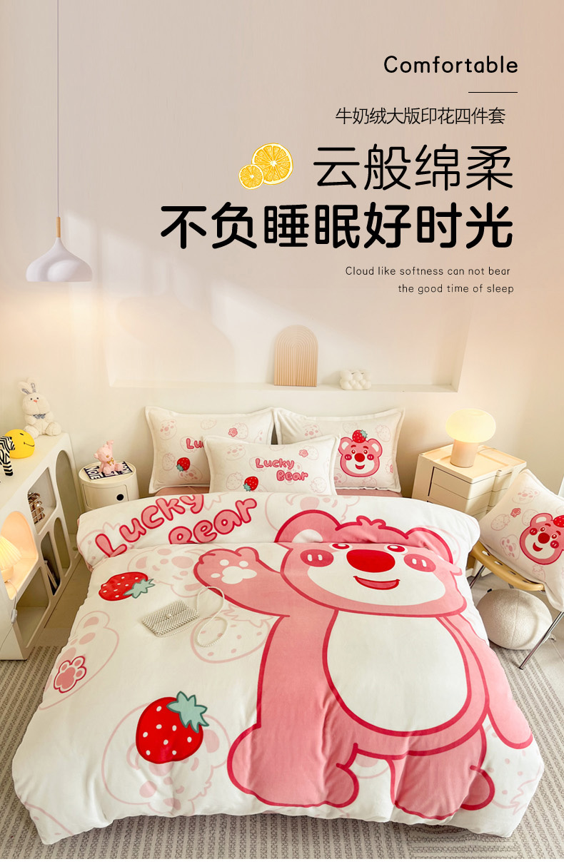 2024新款A类高克重牛奶绒大版印花保暖四件套 幸运草莓熊