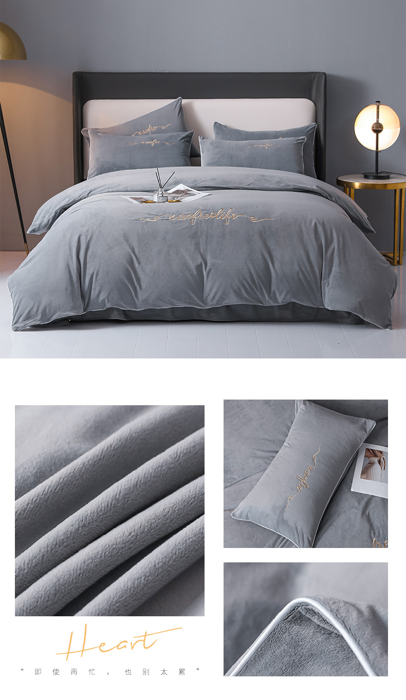 禧澜庭 2024新款A类婴儿绒纯色刺绣牛奶法莱绒四件套暖阳系列 烟灰