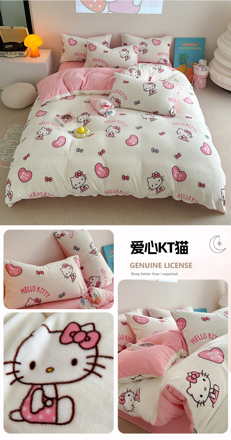 2024新款三丽鸥高克重牛奶绒四件套 爱心KT猫