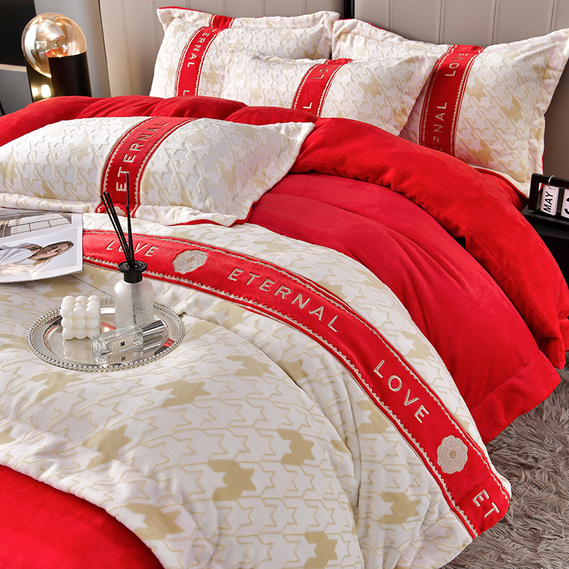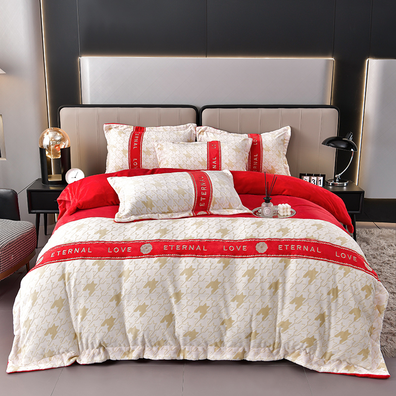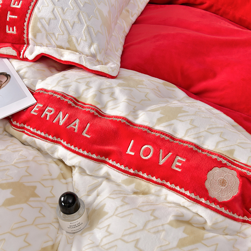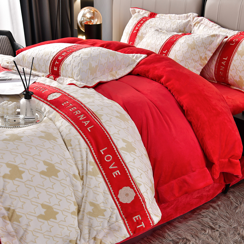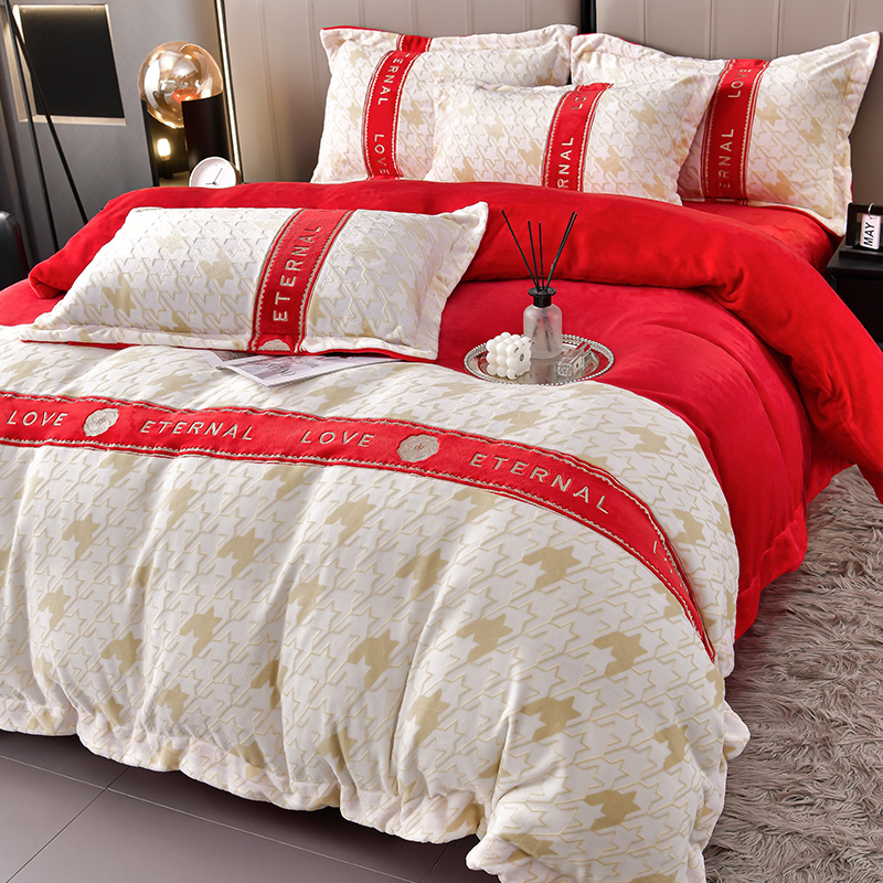 商品名称:妮恒美 2024新款牛奶绒四件套雕花刺绣千鸟格法莱绒四件套 千鸟格-魅力红