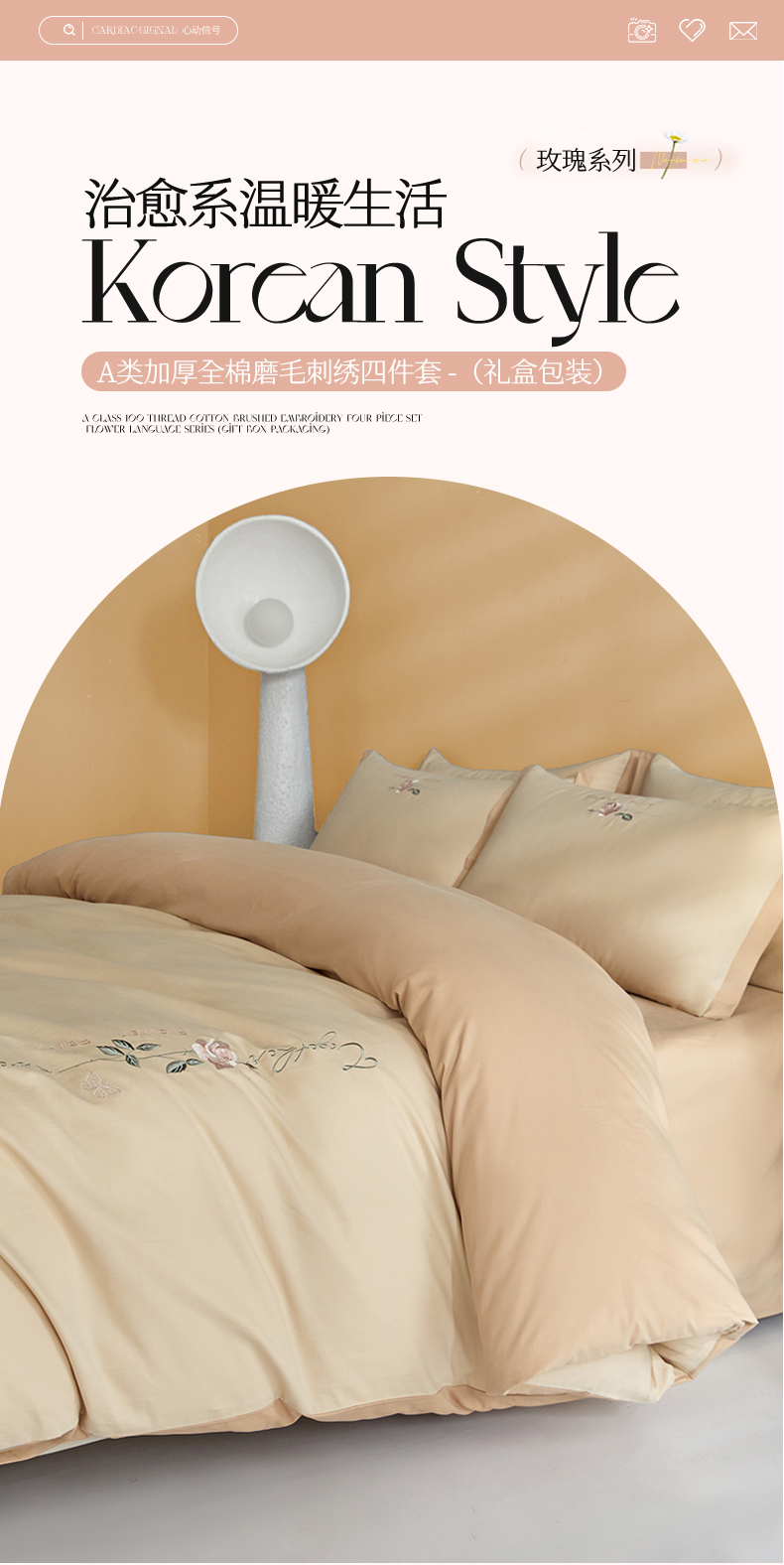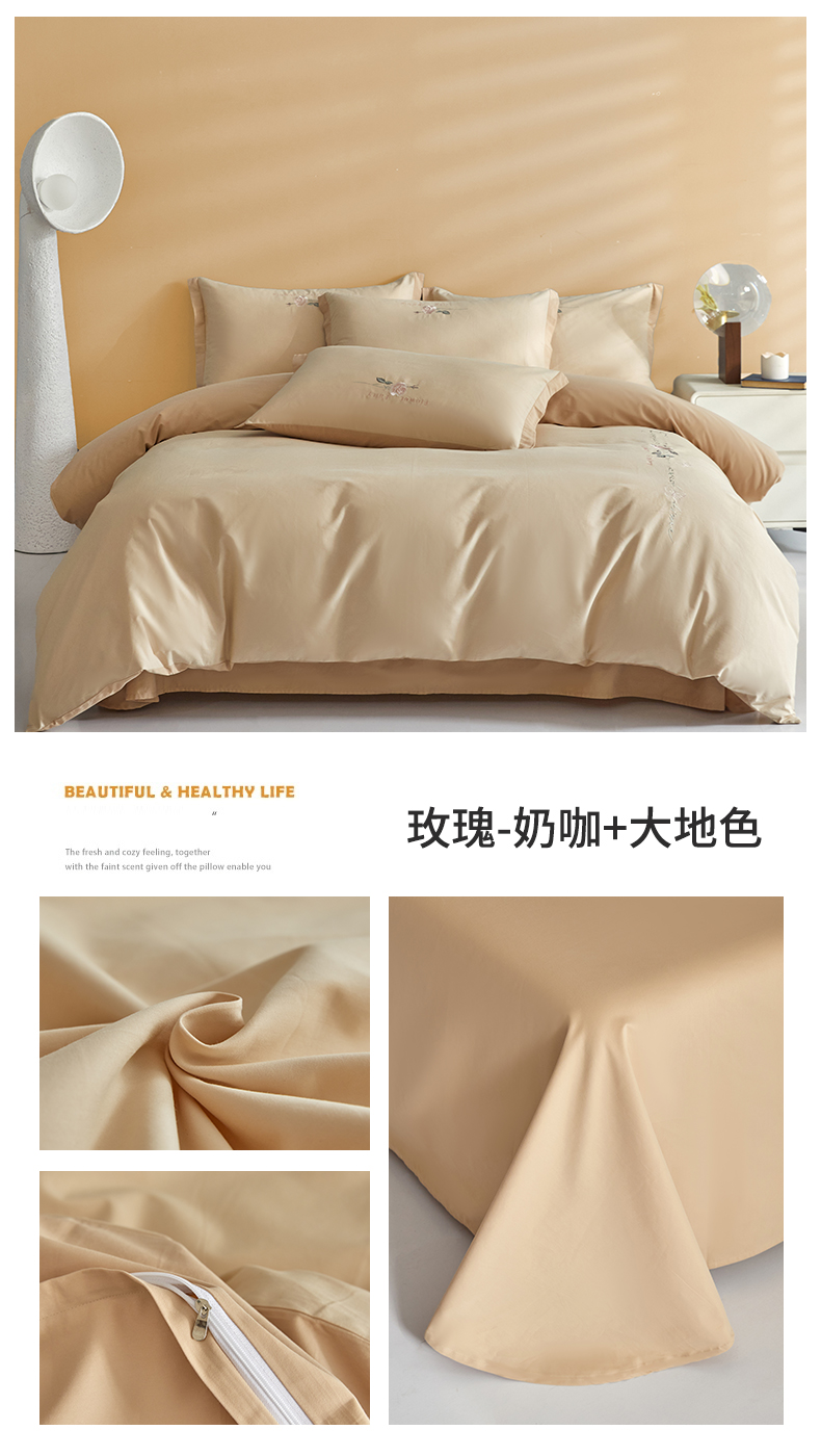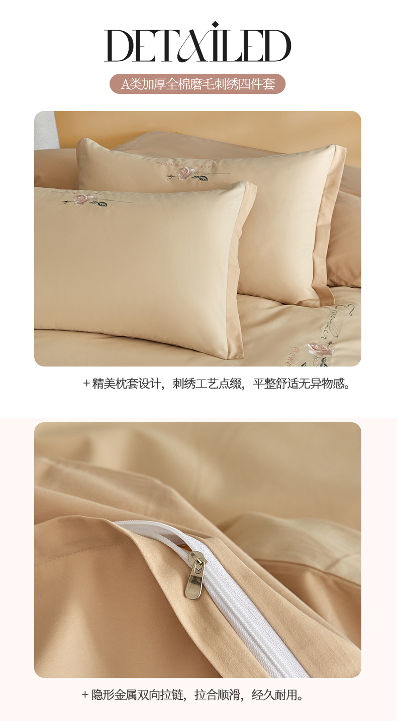 新保暖-秋冬A类加厚全棉磨毛刺绣四件套-玫瑰花香系列(礼盒包装) 玫瑰-奶咖+大地色