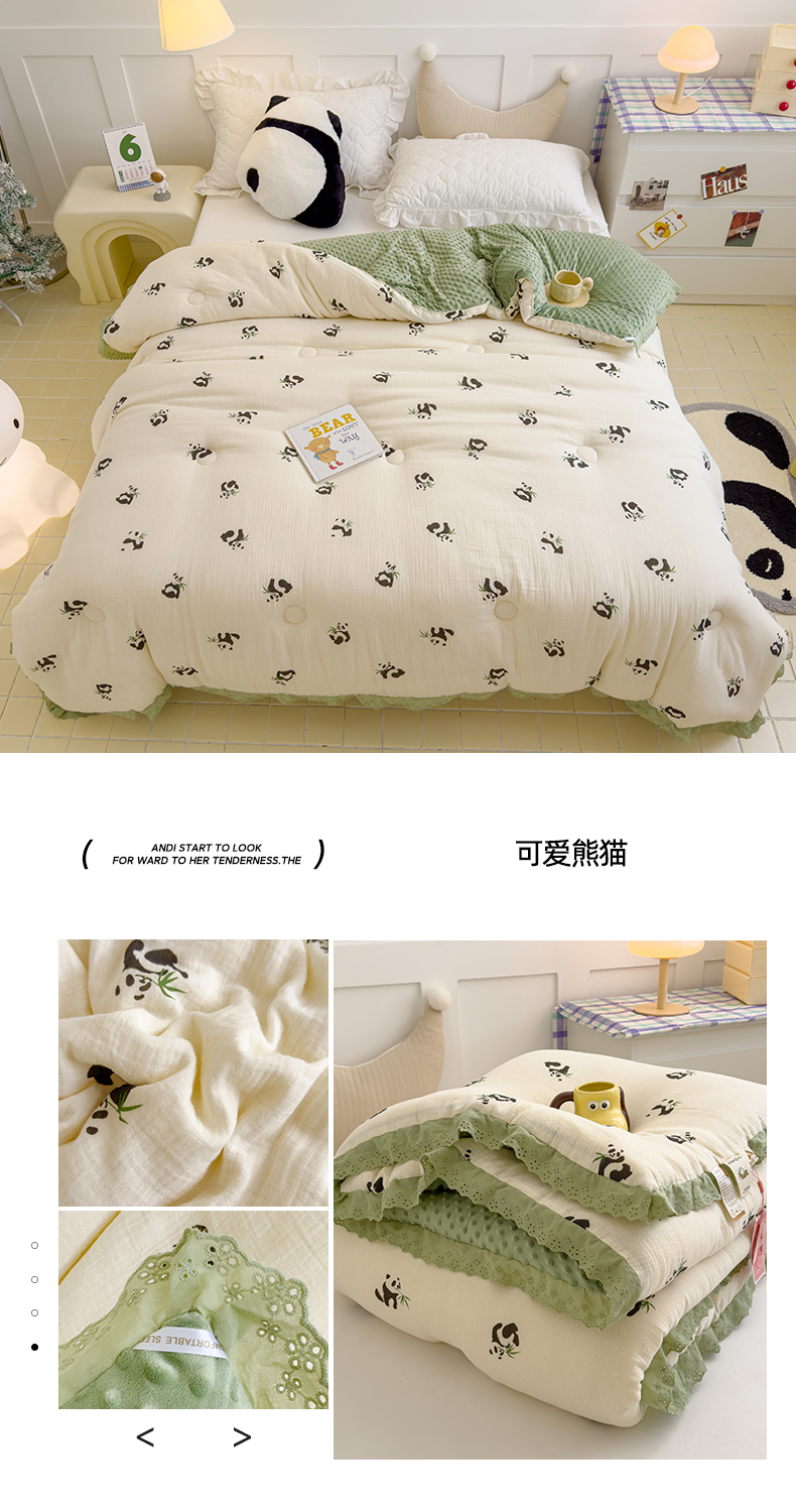 • 91家纺网 家纺一手货源 找家纺 芯恋家居 2025新款全棉皱皱纱双层纱豆豆被大豆被 可爱熊猫