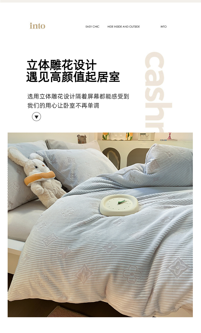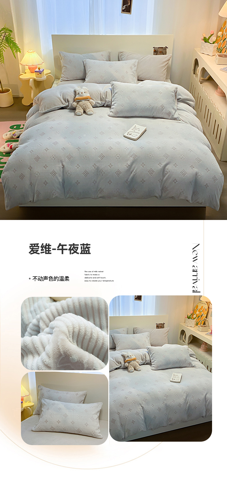 呗旺鹿 2024新款高克重着色烂花雕花牛奶绒轻奢四件套 爱维午夜蓝