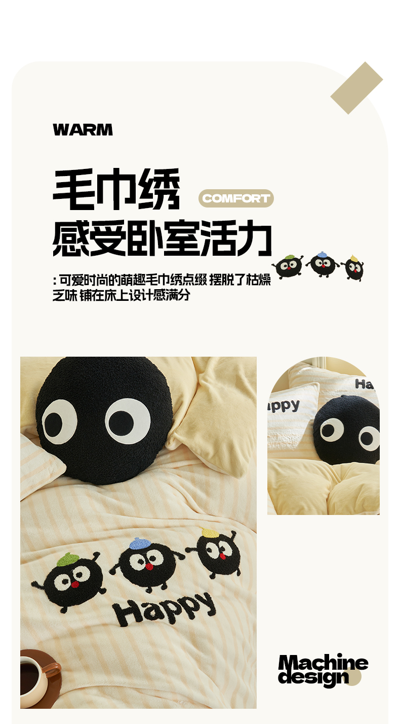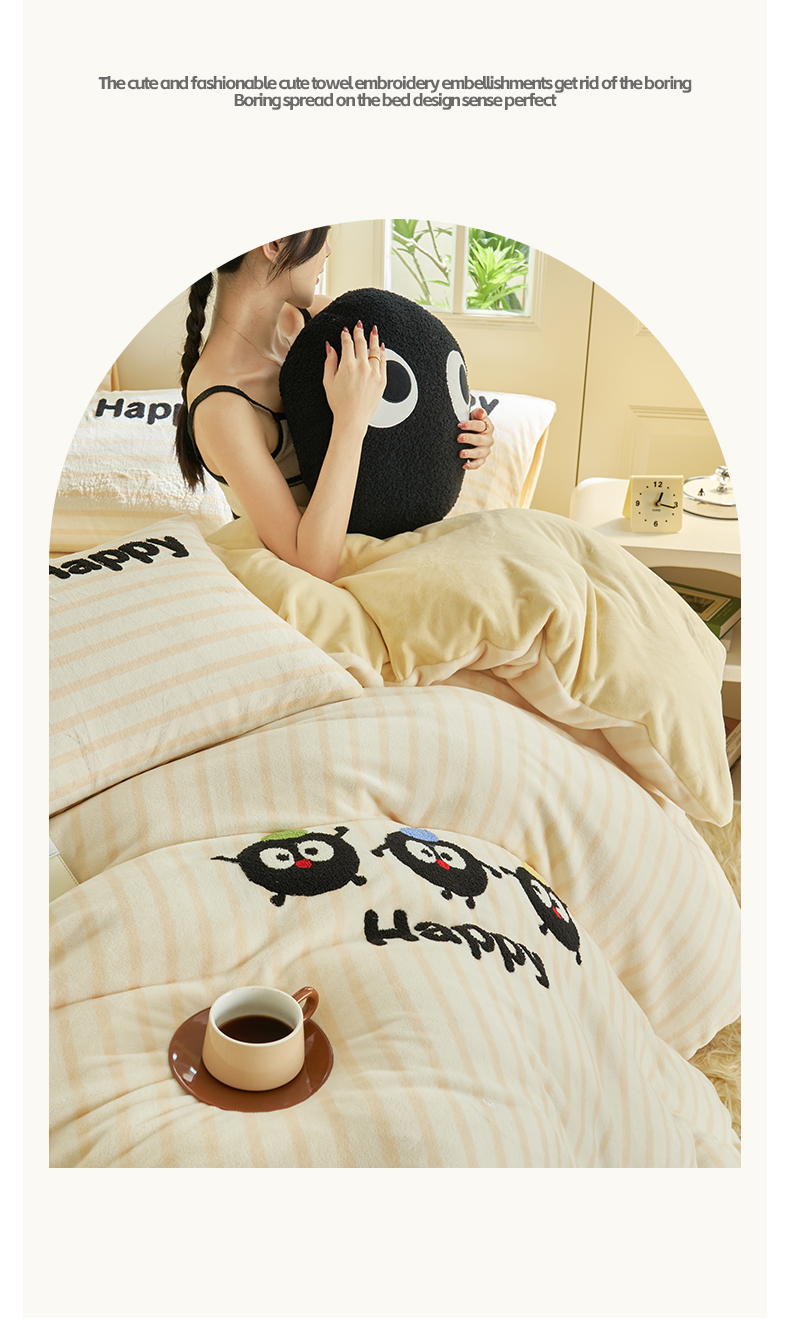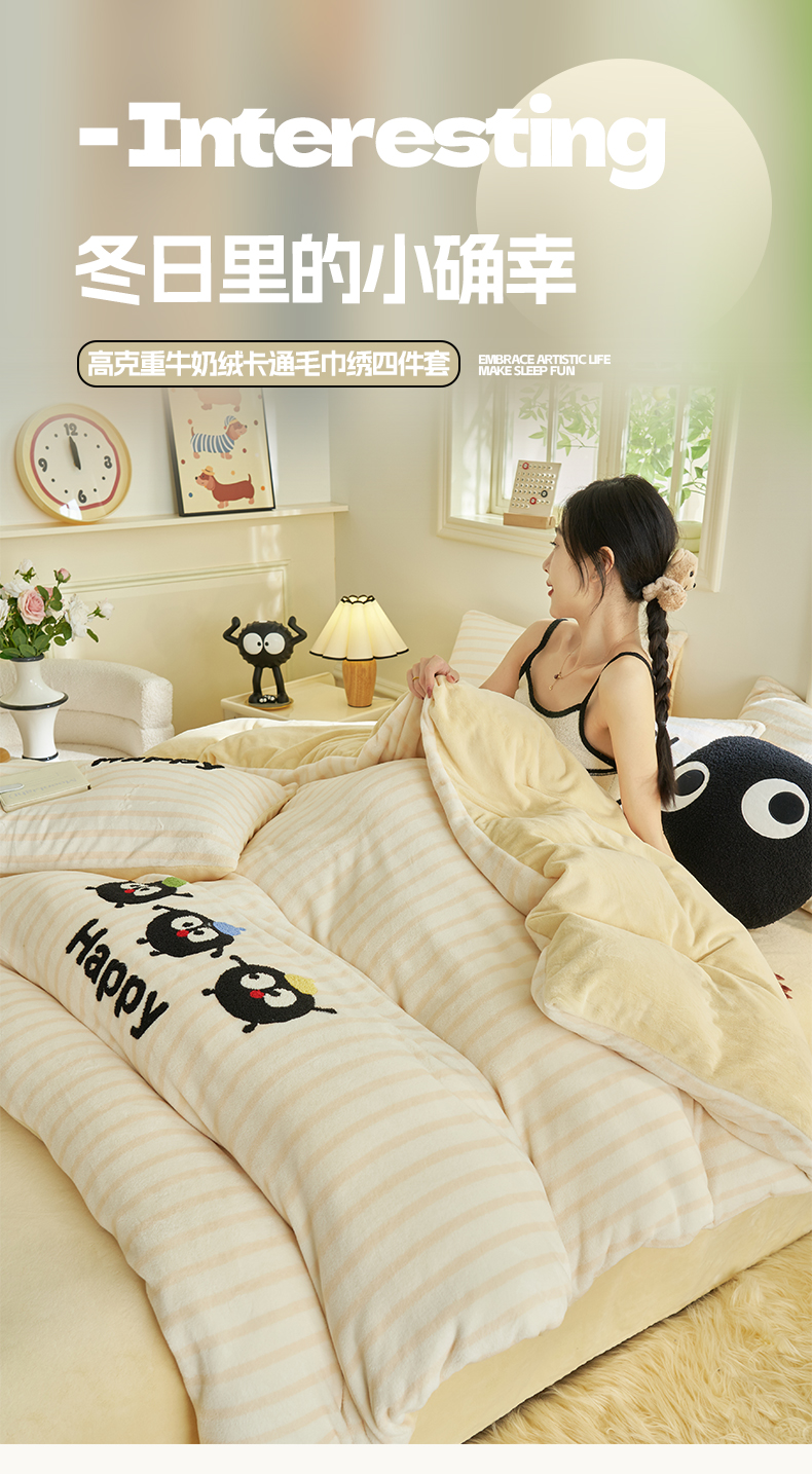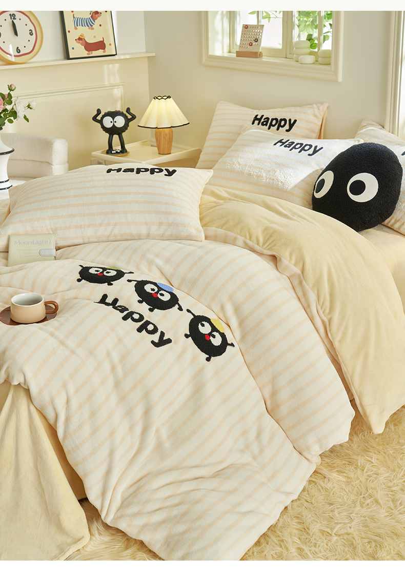 当前位置: 91家纺网 > 商品网购 > 床品套件 > 四件套 > 牛奶绒四件套 > 晨曦家纺 2024新款卡通毛巾绣牛奶绒卡通四件套 小黑球家族-奶黄
