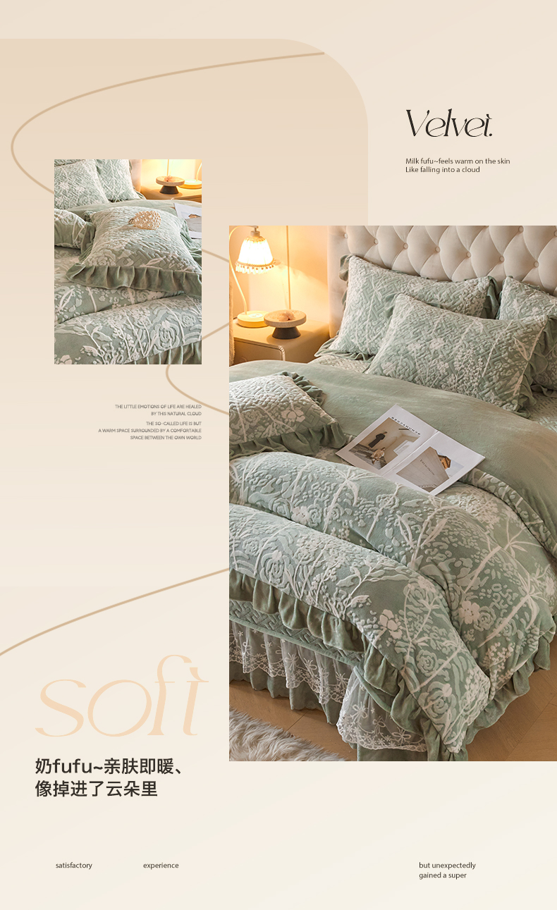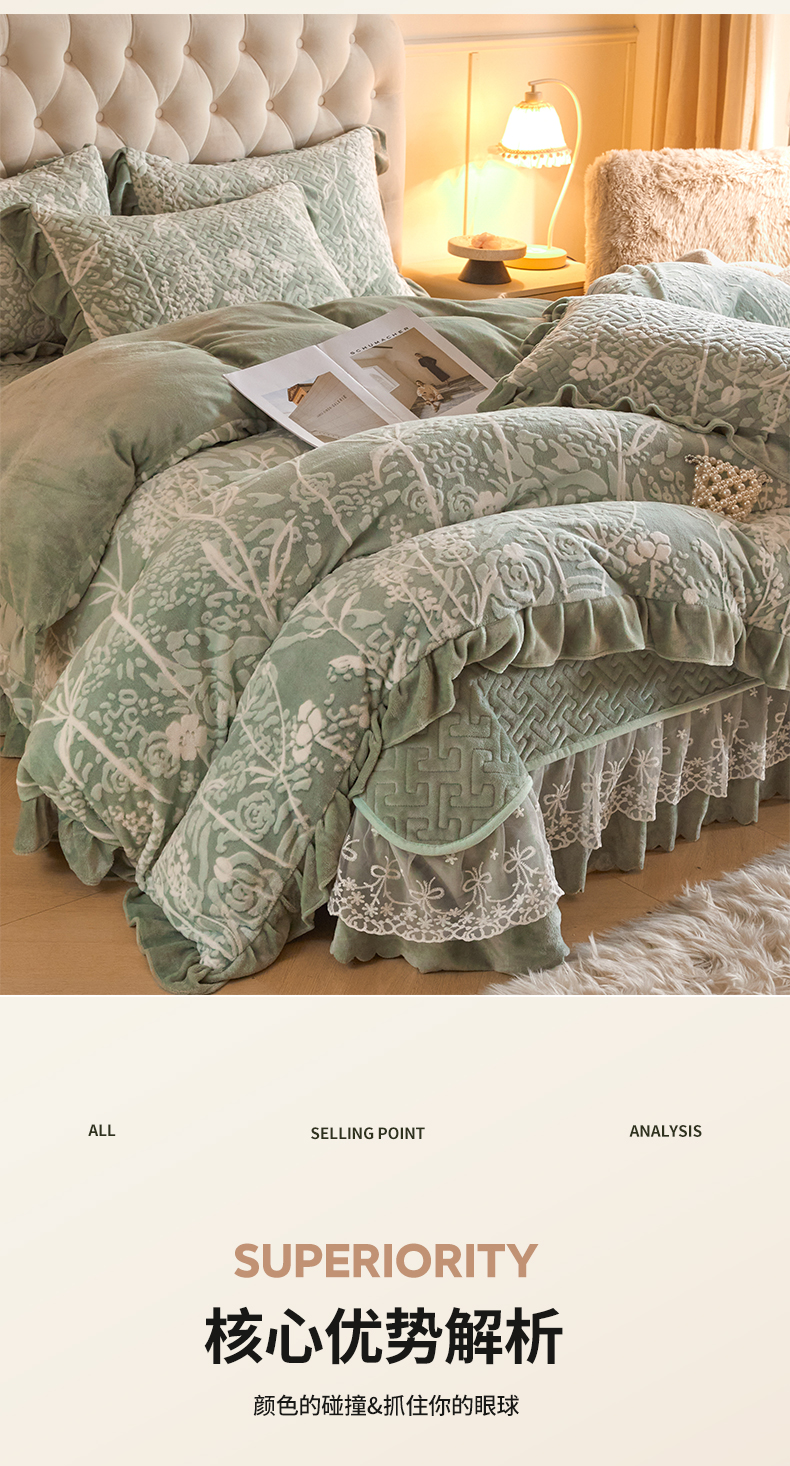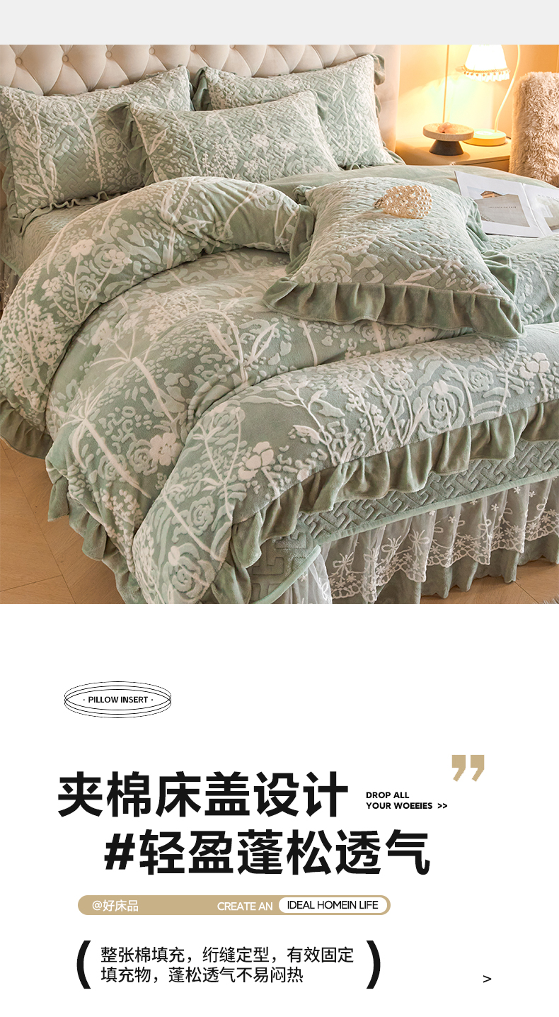 商品名称:畅畅家纺 2024新款11斤高克重新款韩版烂花牛奶绒床盖四件套系列 雾里看花-海藻青