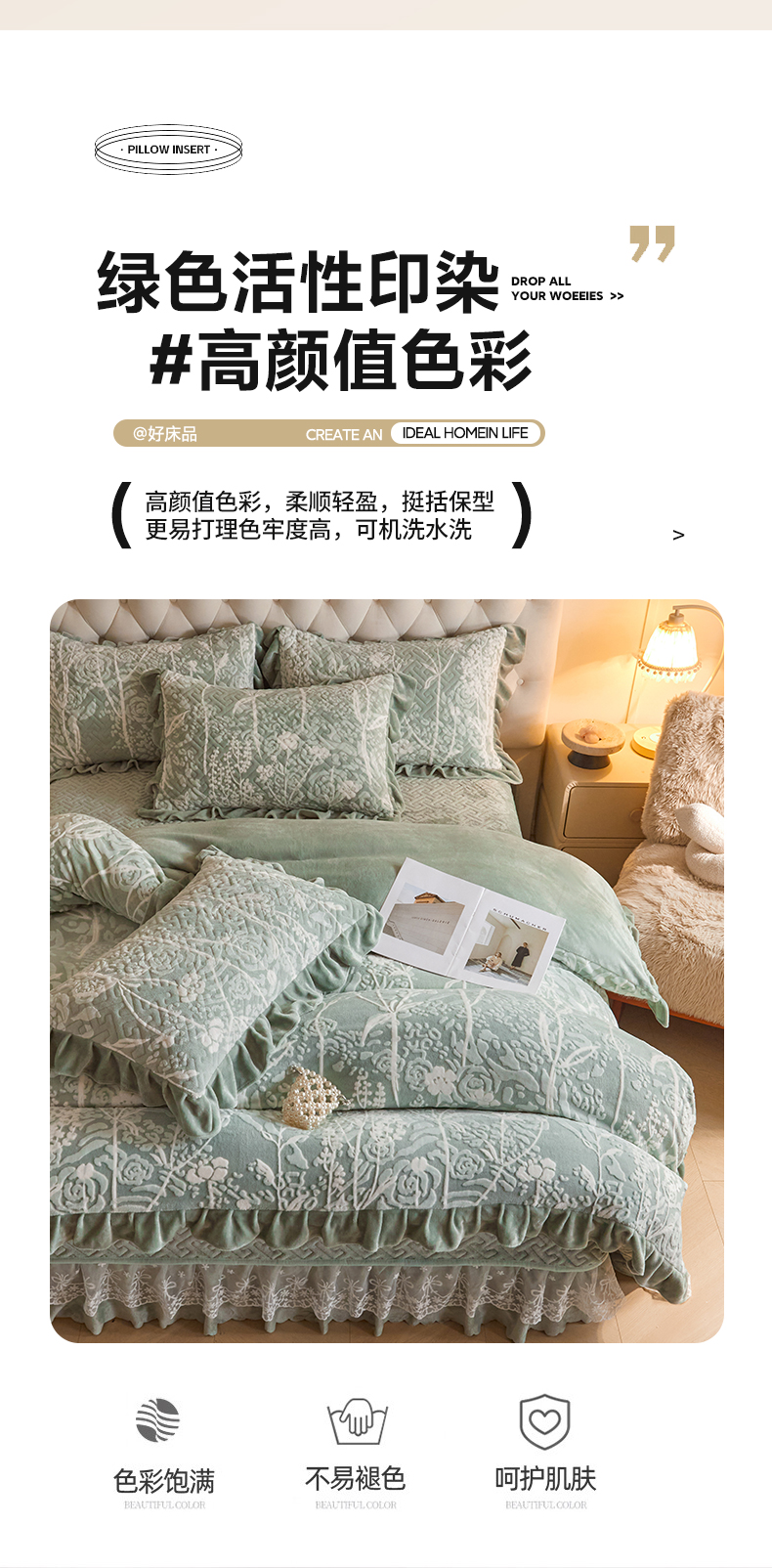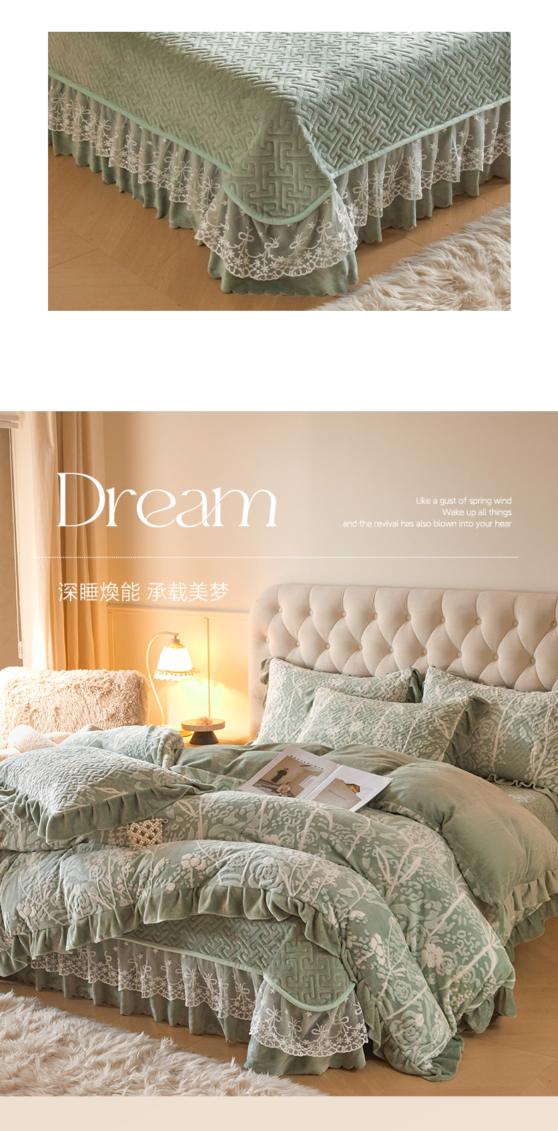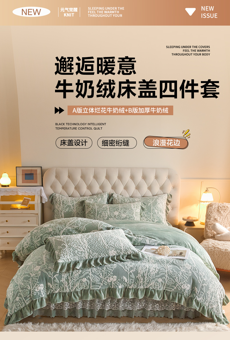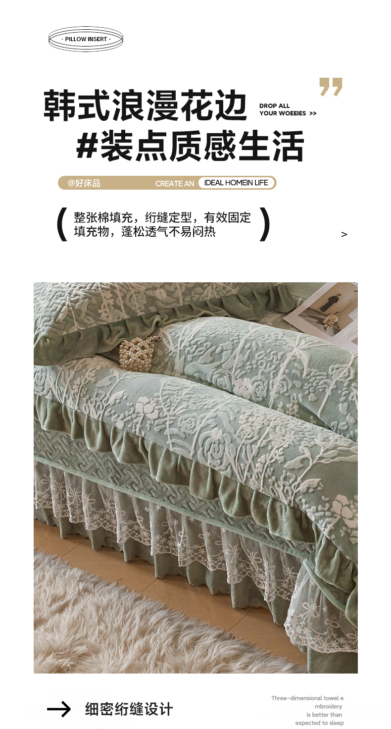 商品名称:畅畅家纺 2024新款11斤高克重新款韩版烂花牛奶绒床盖四件套系列 雾里看花-海藻青
