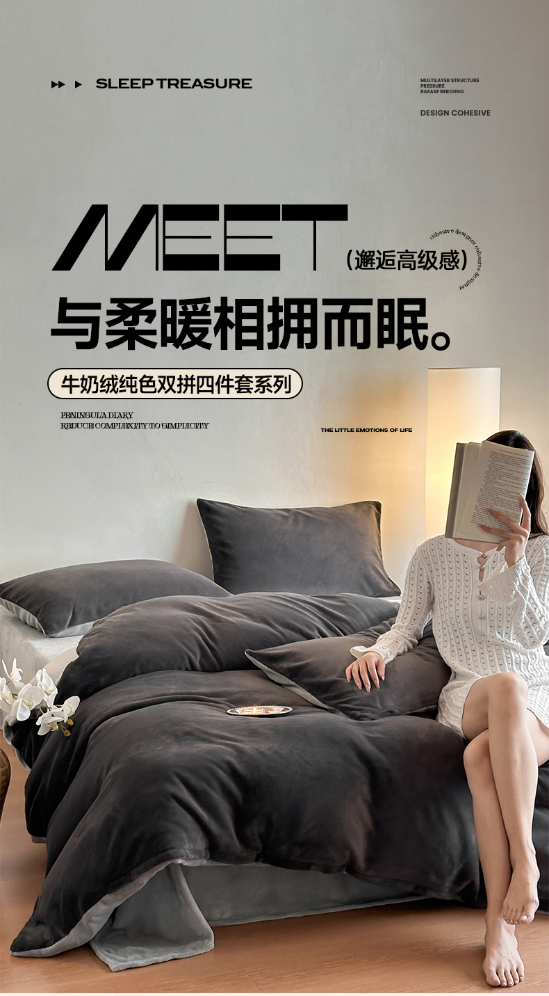 寐眠 2024新款牛奶绒纯色双拼四件套 暗夜魅影