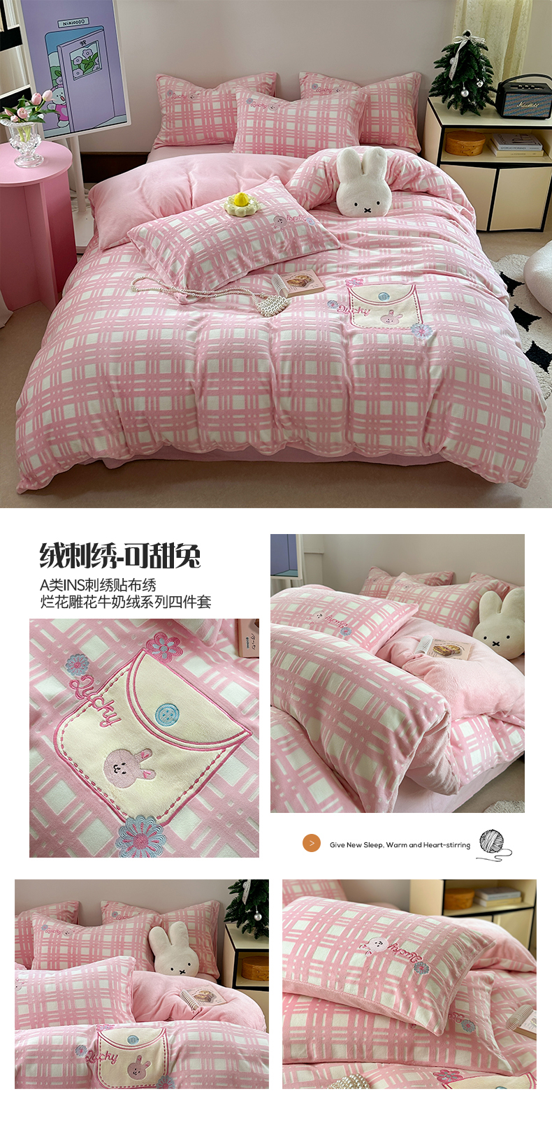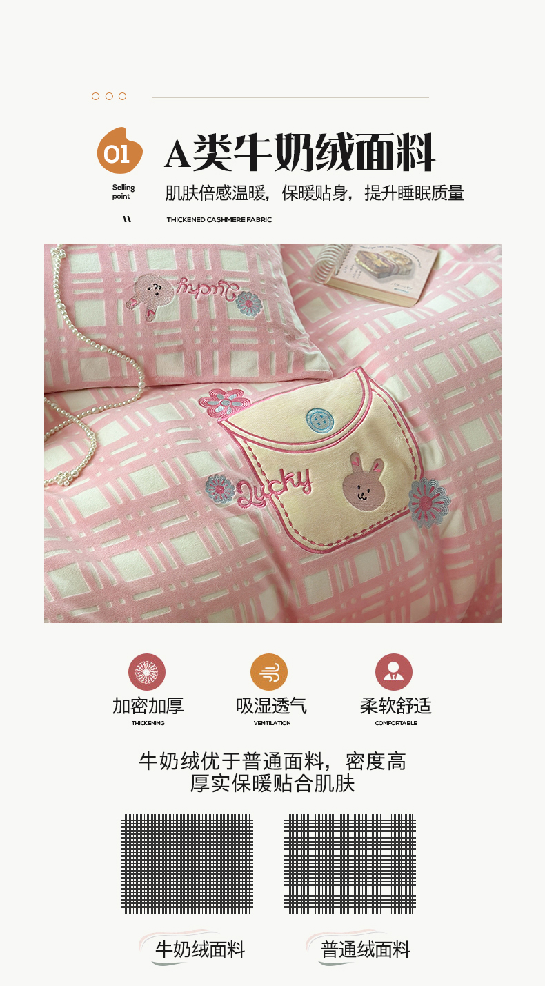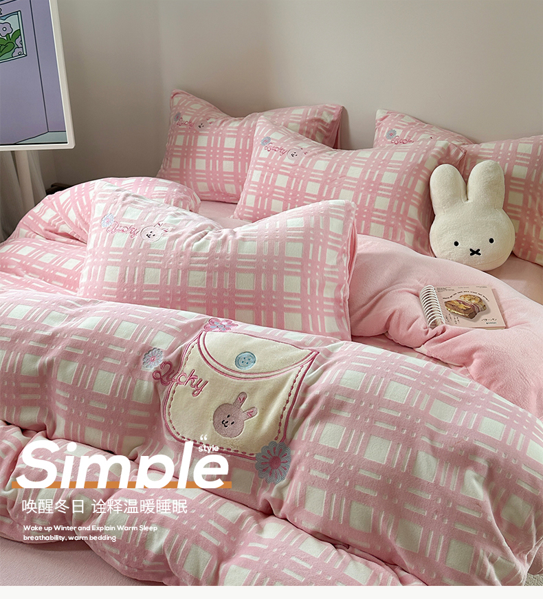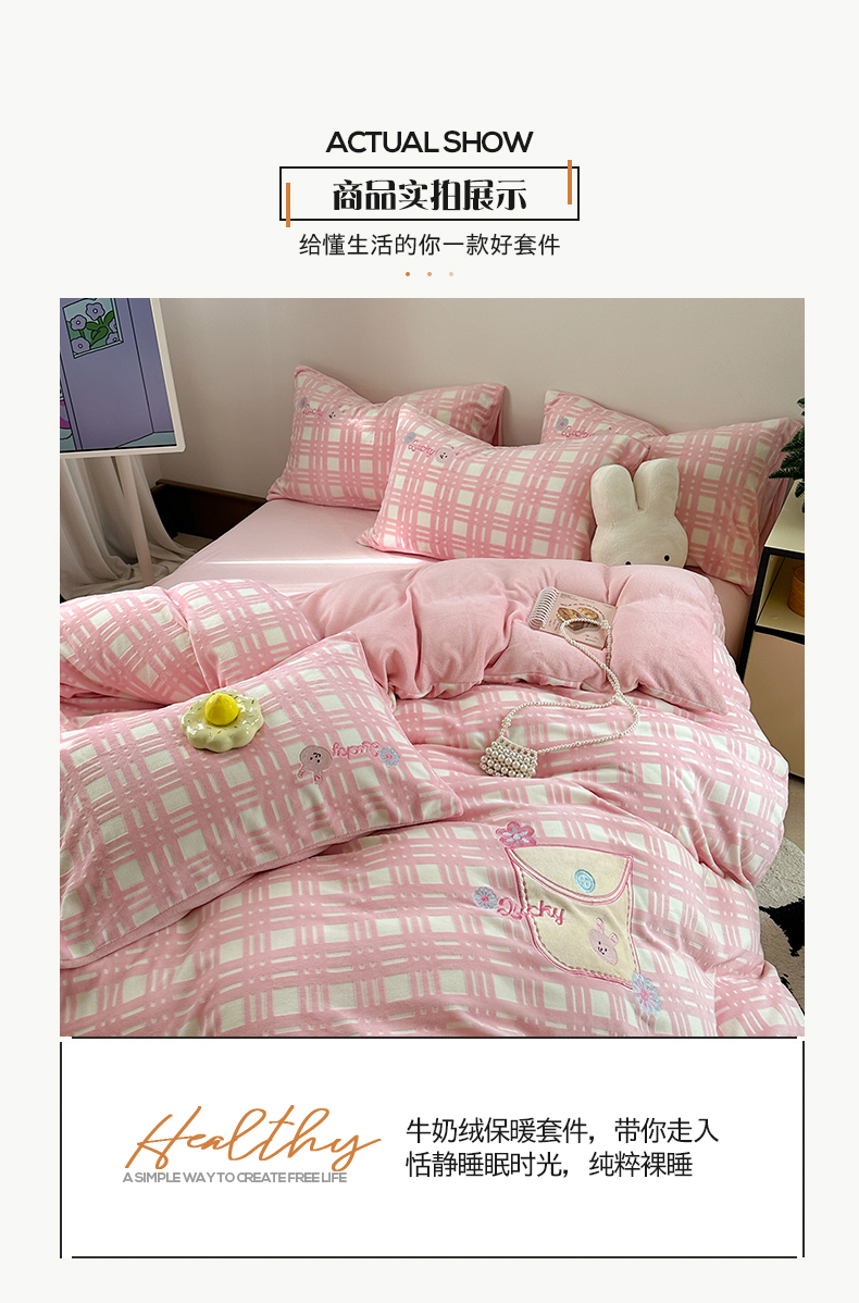 桃子家居 2024新款A类ins博主小红书刺绣贴布绣立体高级工艺烂花雕花牛奶绒系列四件套 绒刺绣-可甜兔