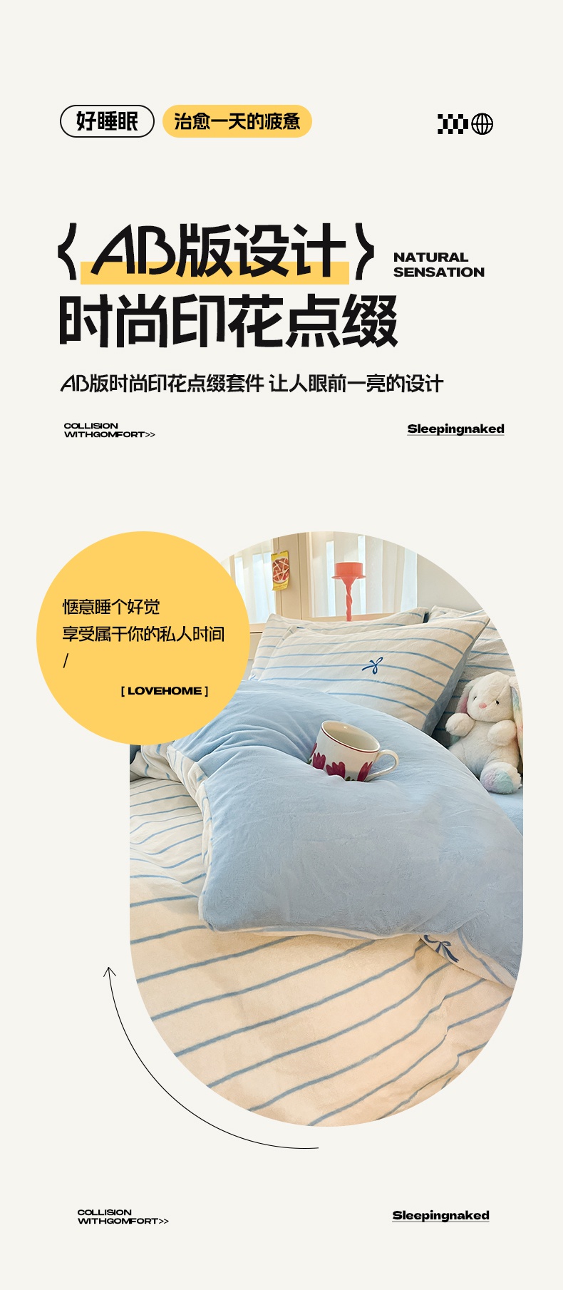 寐眠 2024新款高克重印花牛奶绒四件套条纹风格一 奶黄条纹