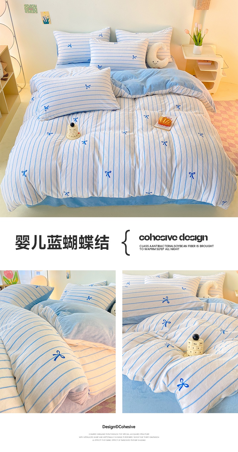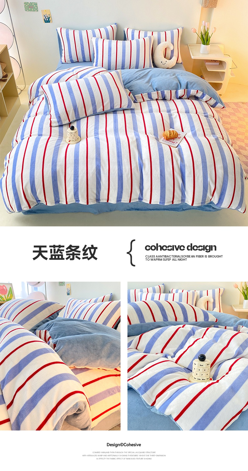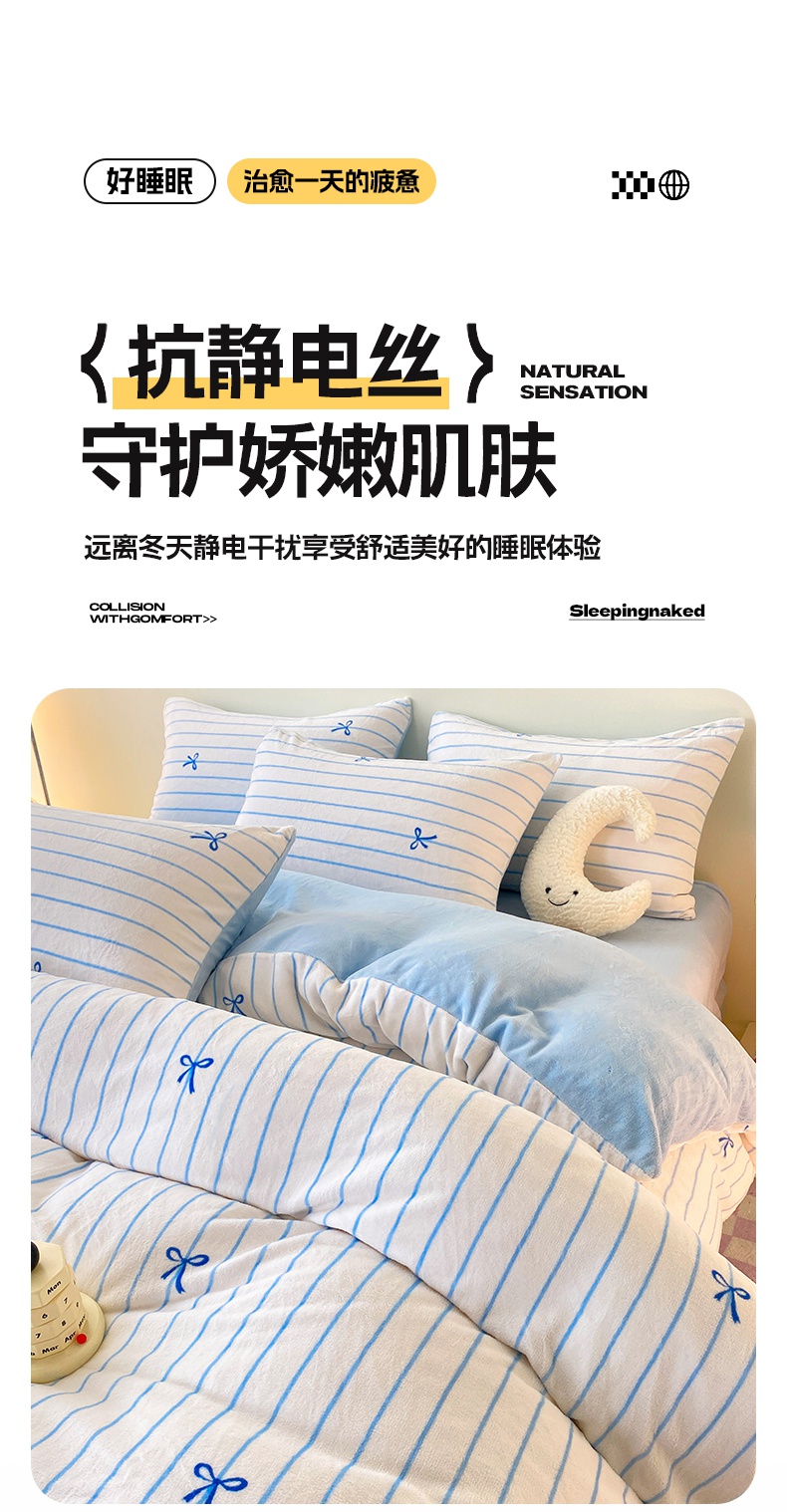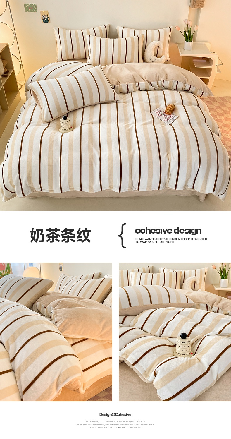 2024新款高克重印花牛奶绒四件套条纹风格二 奶黄条纹