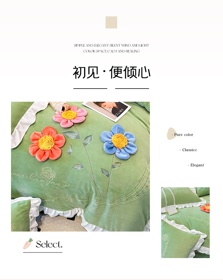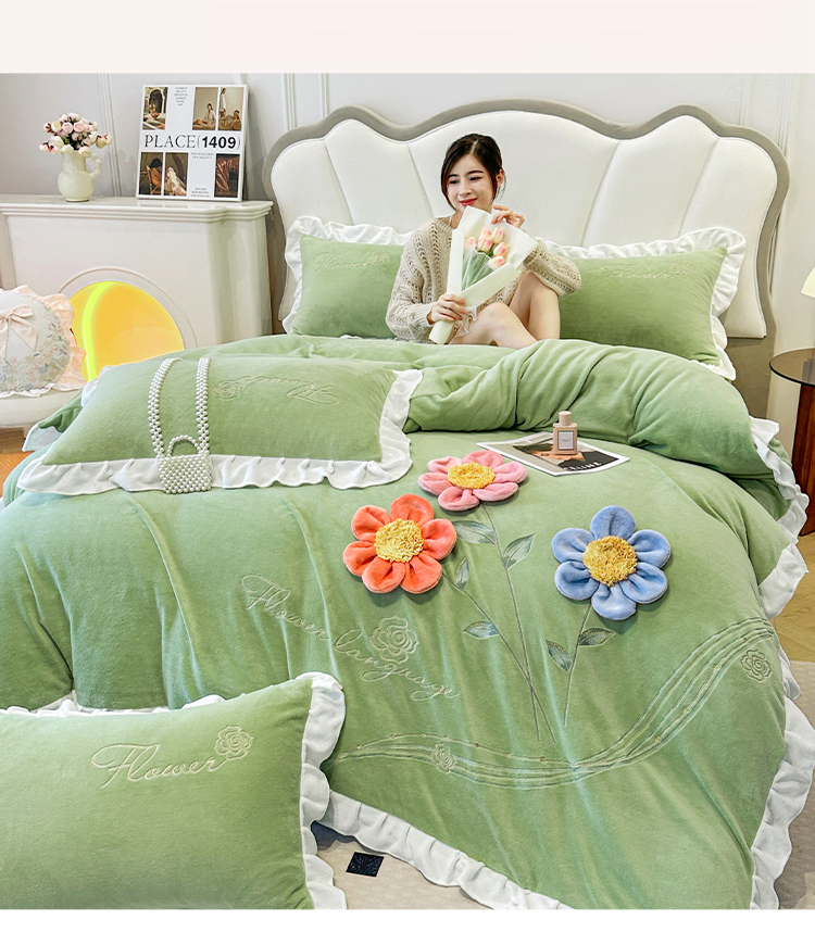 9斤高端韩版少女心法式公主风贴布绣花牛奶绒四件套小清新绒兔毛绒法莱绒床盖被套丝绒兔毛绒法莱绒床盖被套 潘多拉-新芽绿