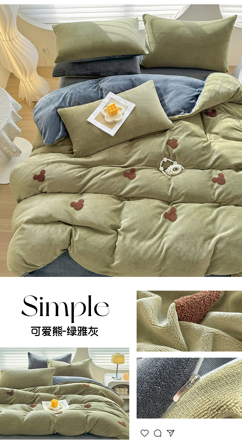 当前位置: 91家纺网 > 商品网购 > 床品套件 > 四件套 > 牛奶绒四件套 > 满羽家纺 2024爆款冬季加厚毛巾绣牛奶绒四件套可爱熊-绿雅灰