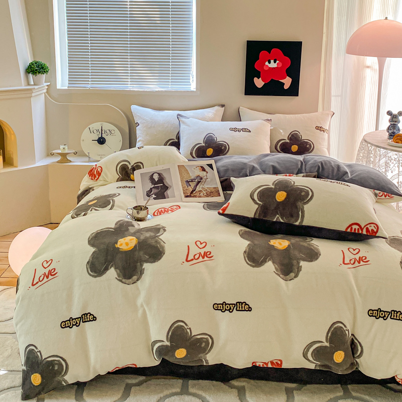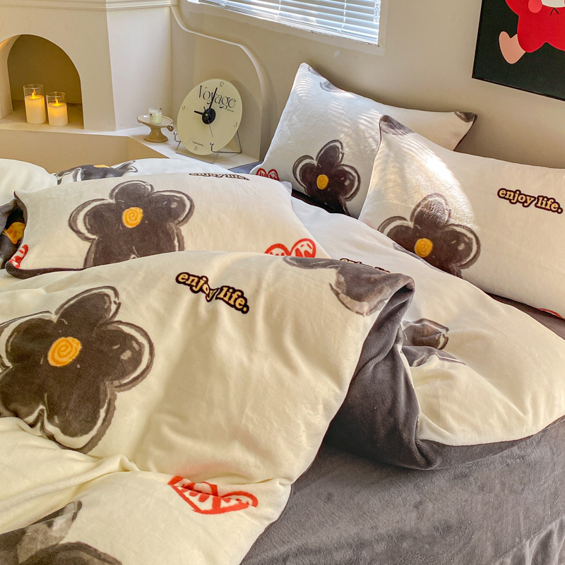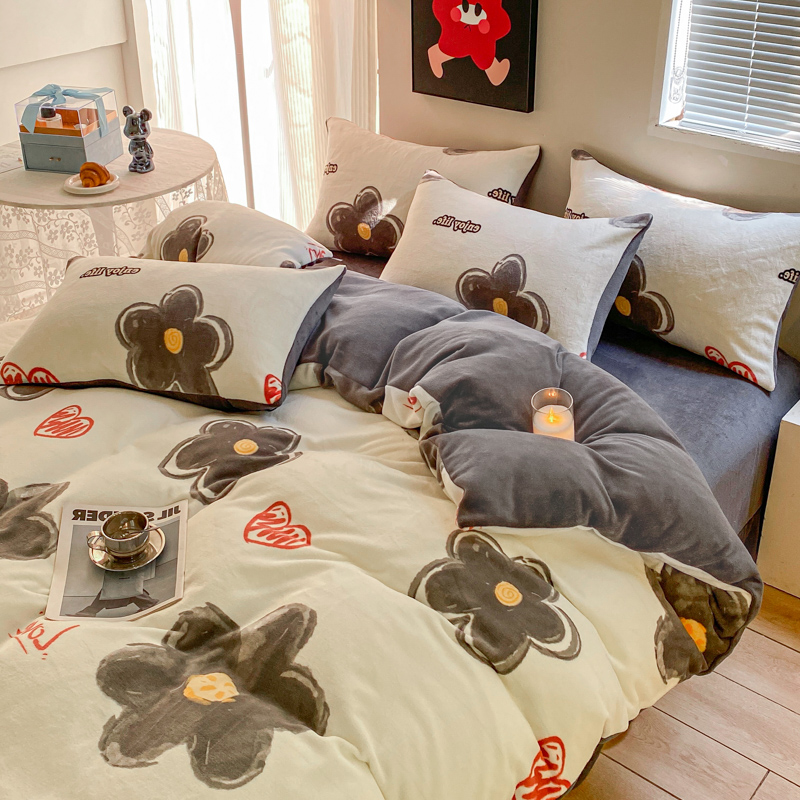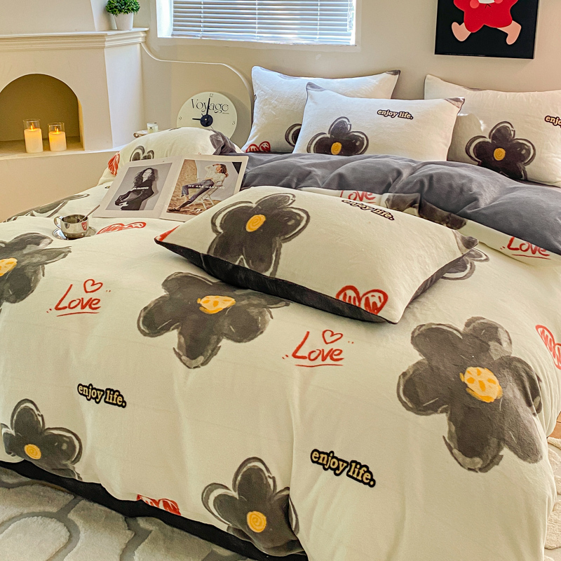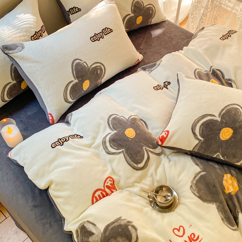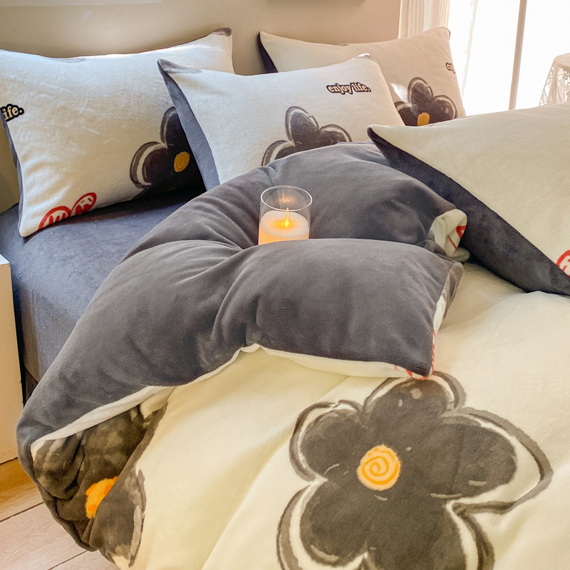 商品名称:斯卡诺家纺2025新款小清新双面牛奶绒印花四件套 花朵灰