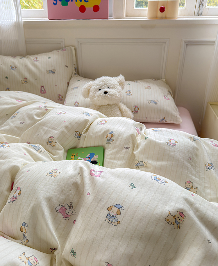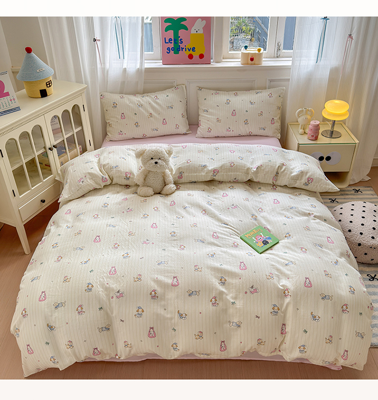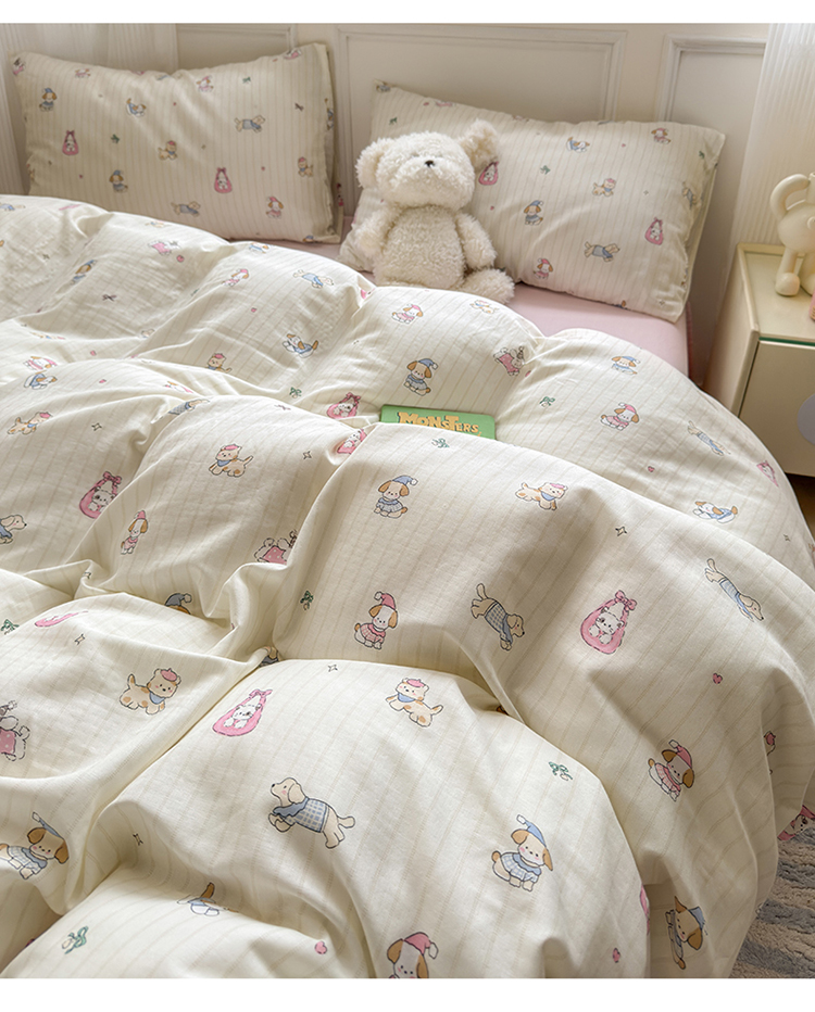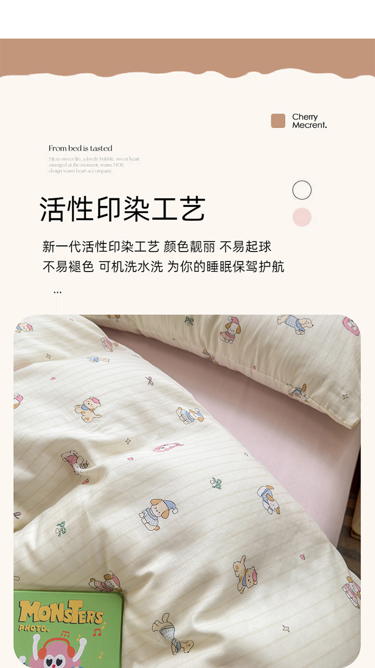 (总)曼之夏 2025新款全棉纯棉40支学生季卡通印花四件套,椰蓝小腊肠,茶茶狗,格子猫,嗨皮狗,开心屋,可爱多,可可汪,玛奇朵,奶昔小熊,泡芙小象,曲奇小狗,趣味熊,甜甜圈,甜心猫咪,童画,小狗日记,樱桃熊仔