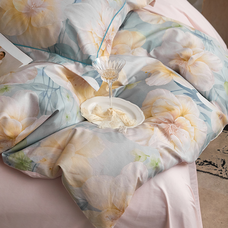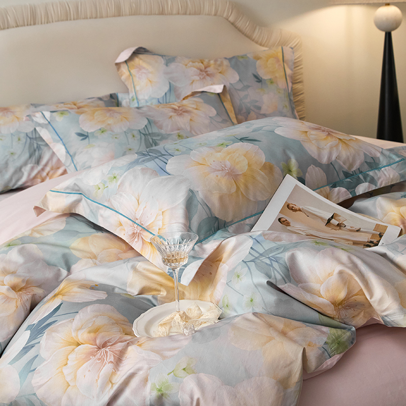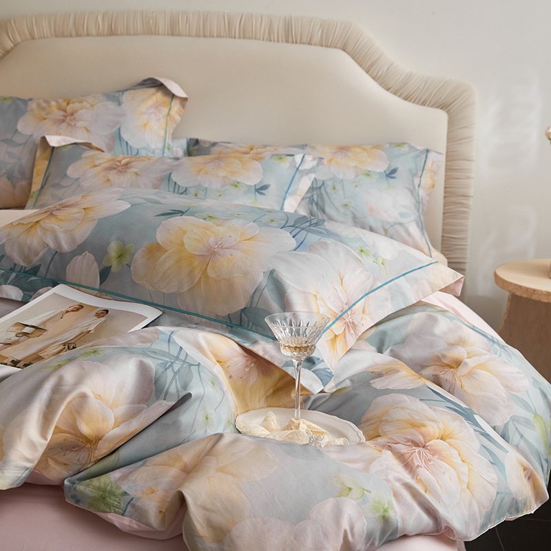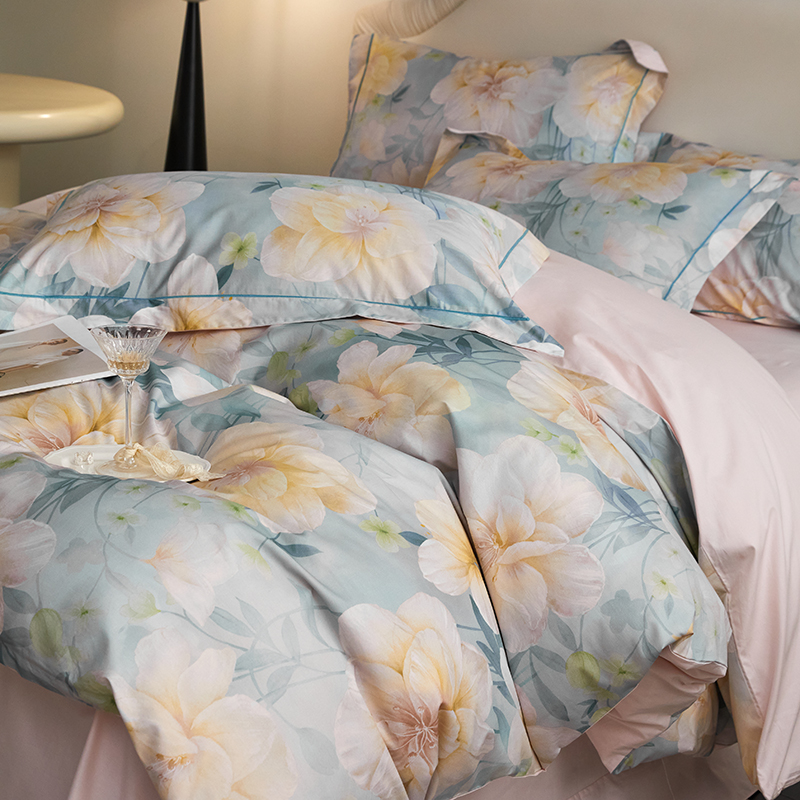 (总)薏思家纺 2025新款全棉100支数码印花生态磨毛轻奢款四件套-花边系列,橘子海,向云端,寻野-绿