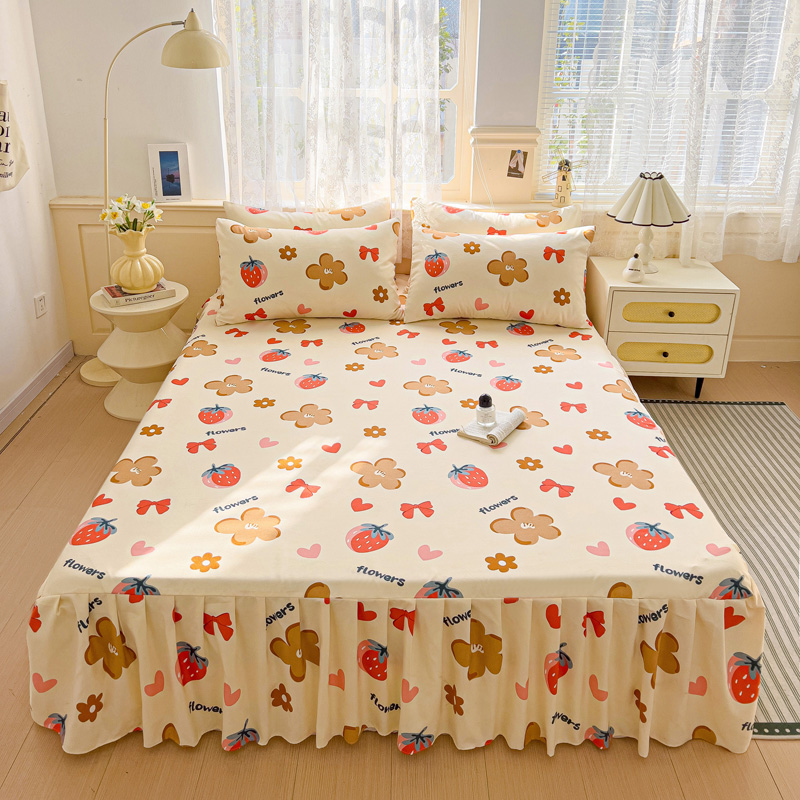 商品名称:极梦家纺(支持定制) 2026新款春秋130克加厚植物羊绒磨毛印花单床裙三件套 草莓恋曲