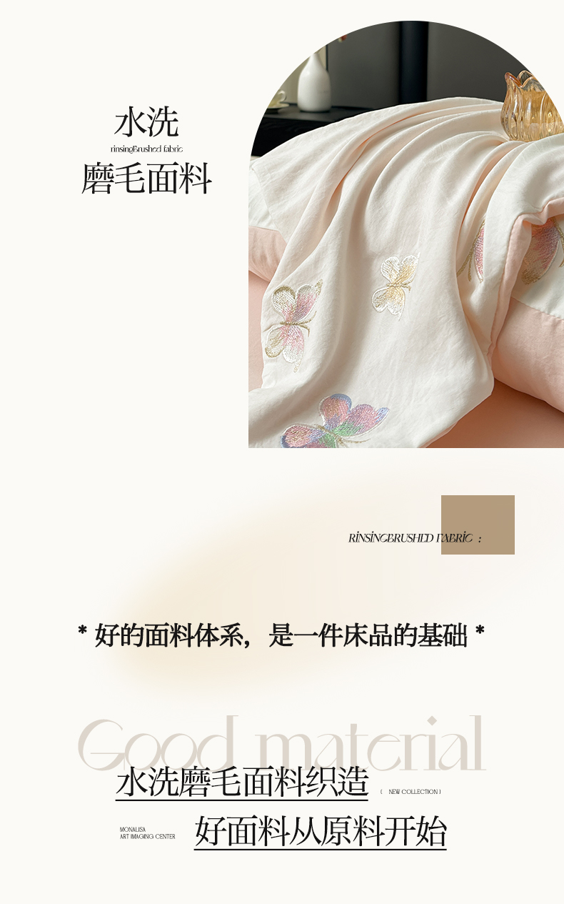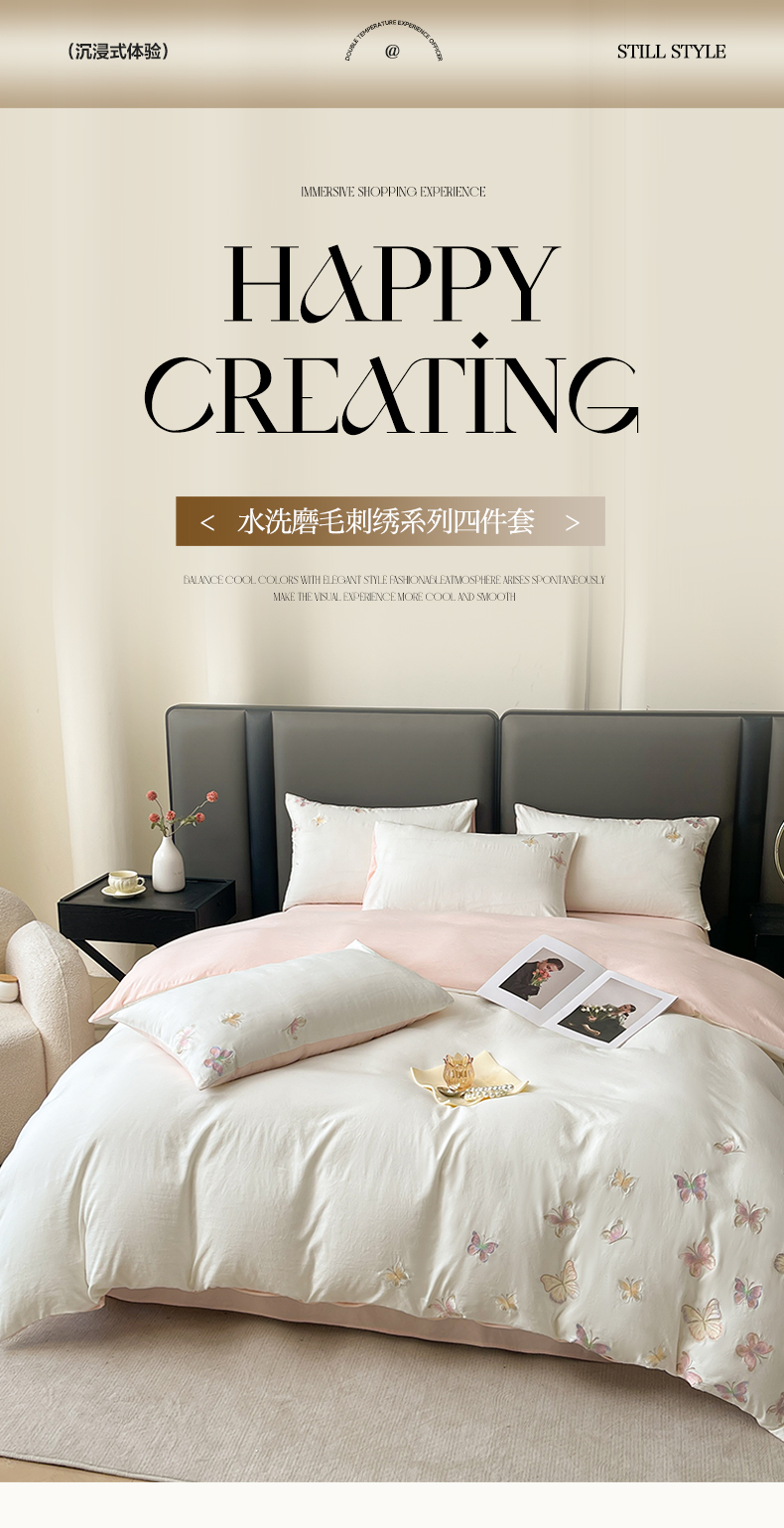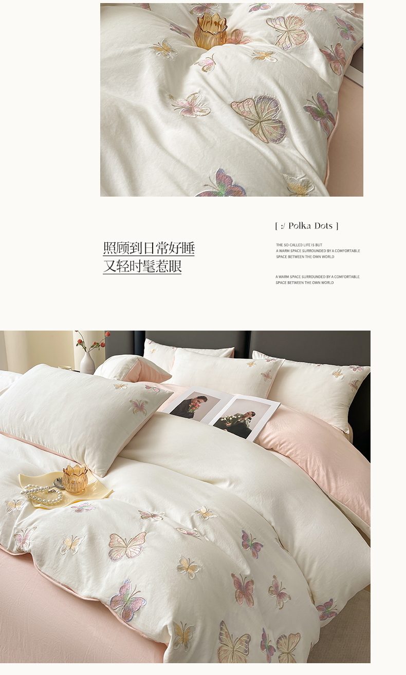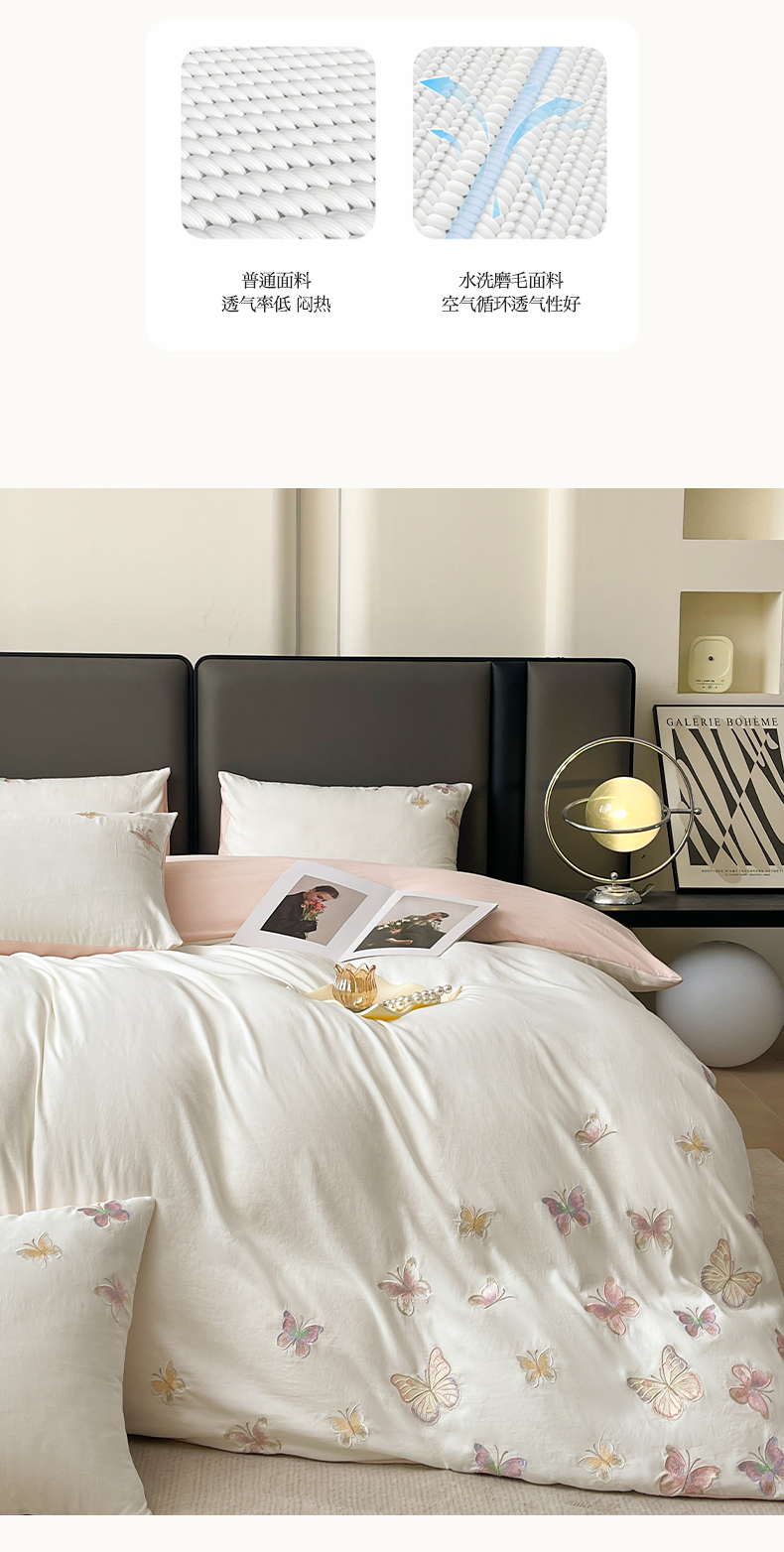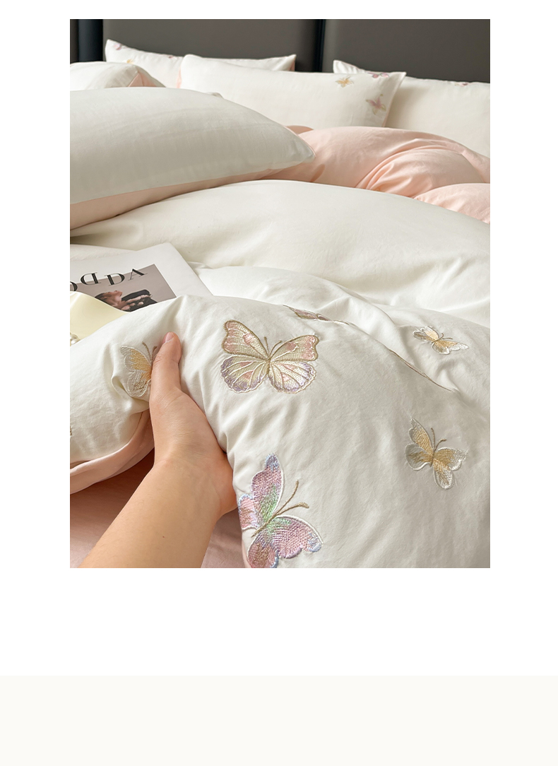 商品名称:逸尚阁 2025新款水洗磨毛刺绣四件套--七彩蝴蝶系列(提供买家秀) 七彩蝴蝶-浅玉