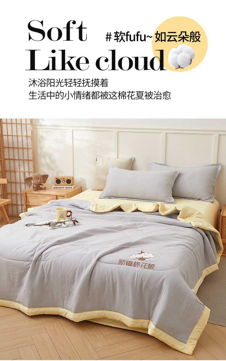 商品名称:新疆纯棉花被宽边绣花款全棉水洗棉夏凉被空调被薄款春秋被 云暖-云雾灰