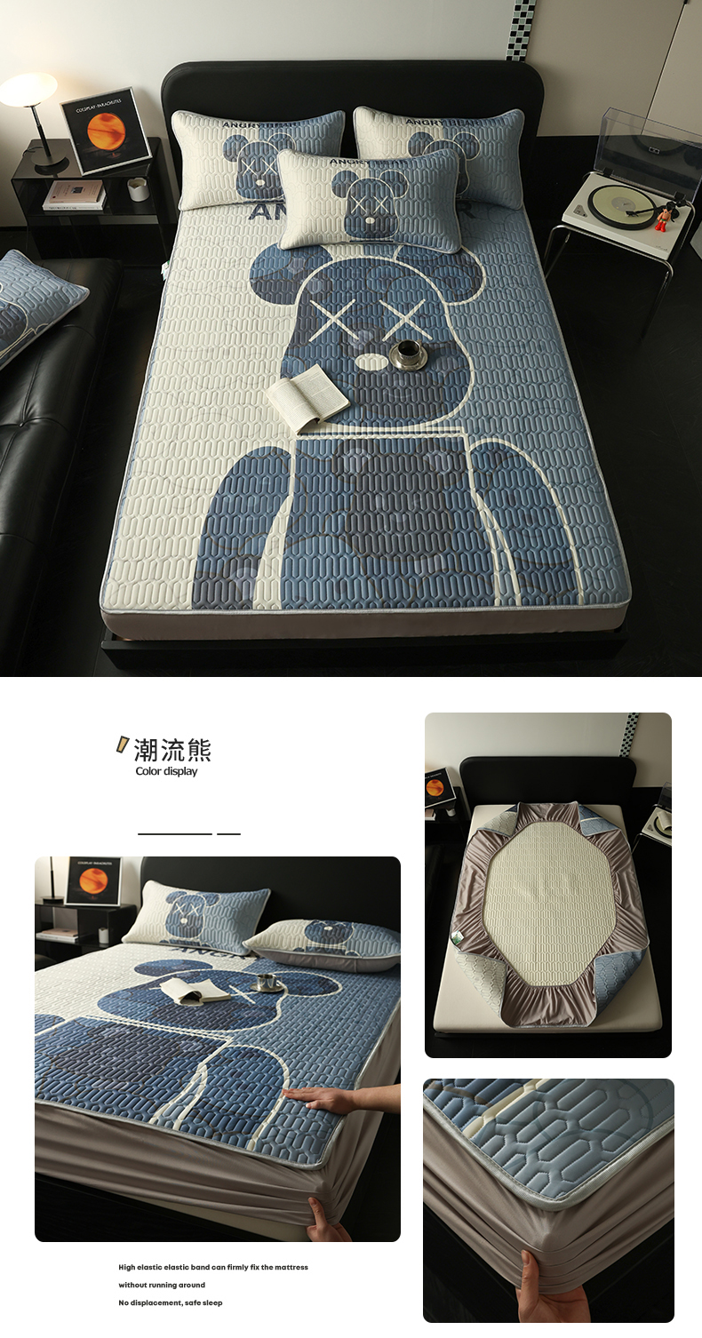 商品名称:圣比熊 2025新款大版印花纯色0.5乳胶凉席床笠款床裙款凉席三件套 床笠款-墨镜熊