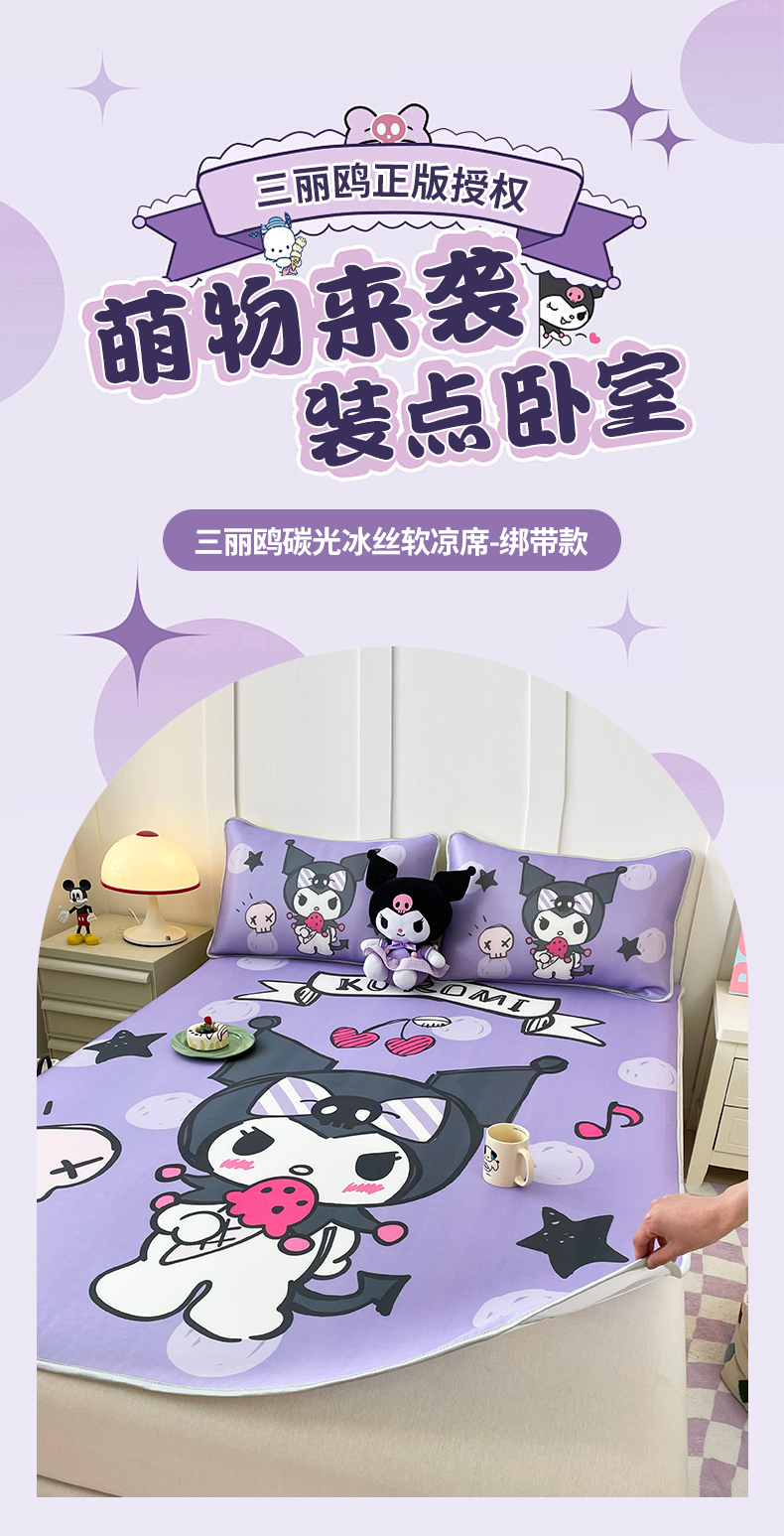 商品名称:米帛家纺 2025新款大版三丽鸥碳光冰丝软凉席绑带款 粉色酷洛米