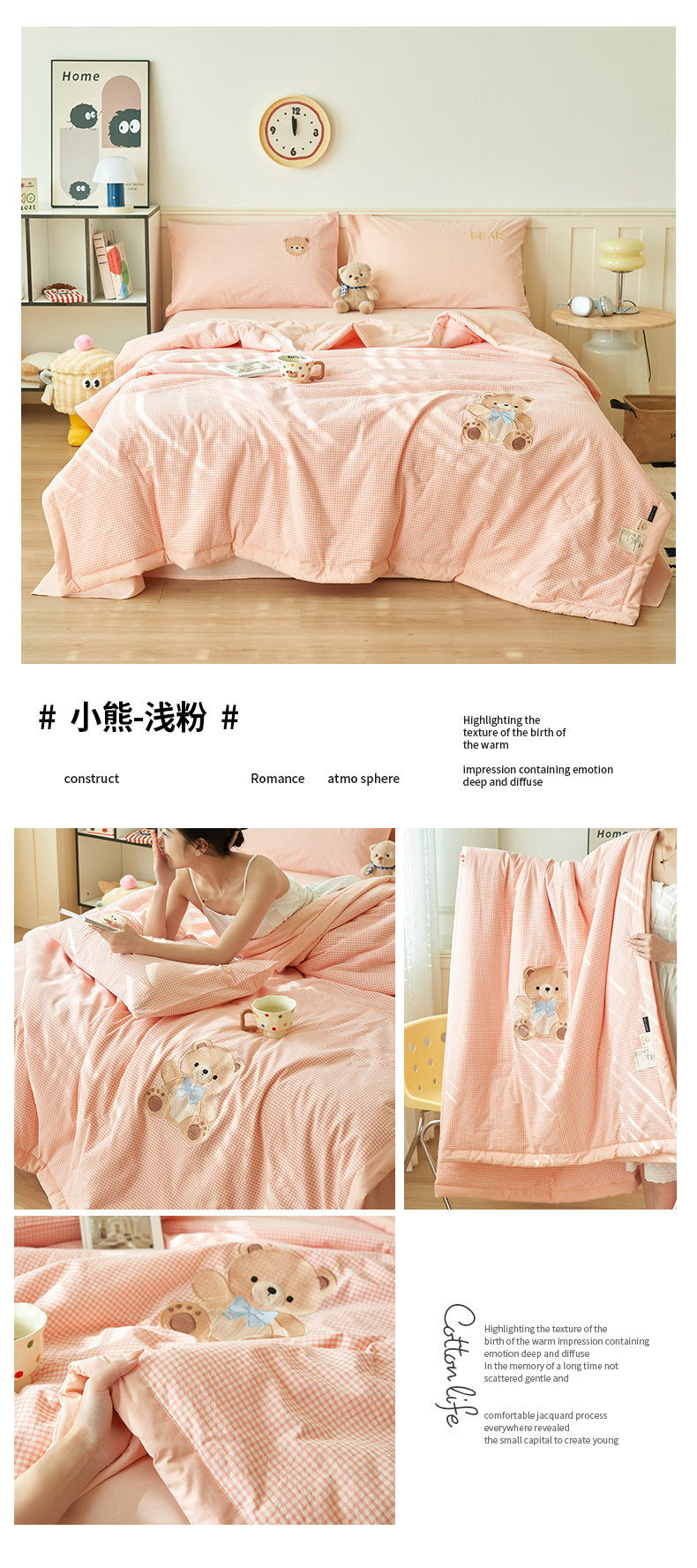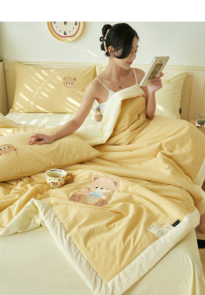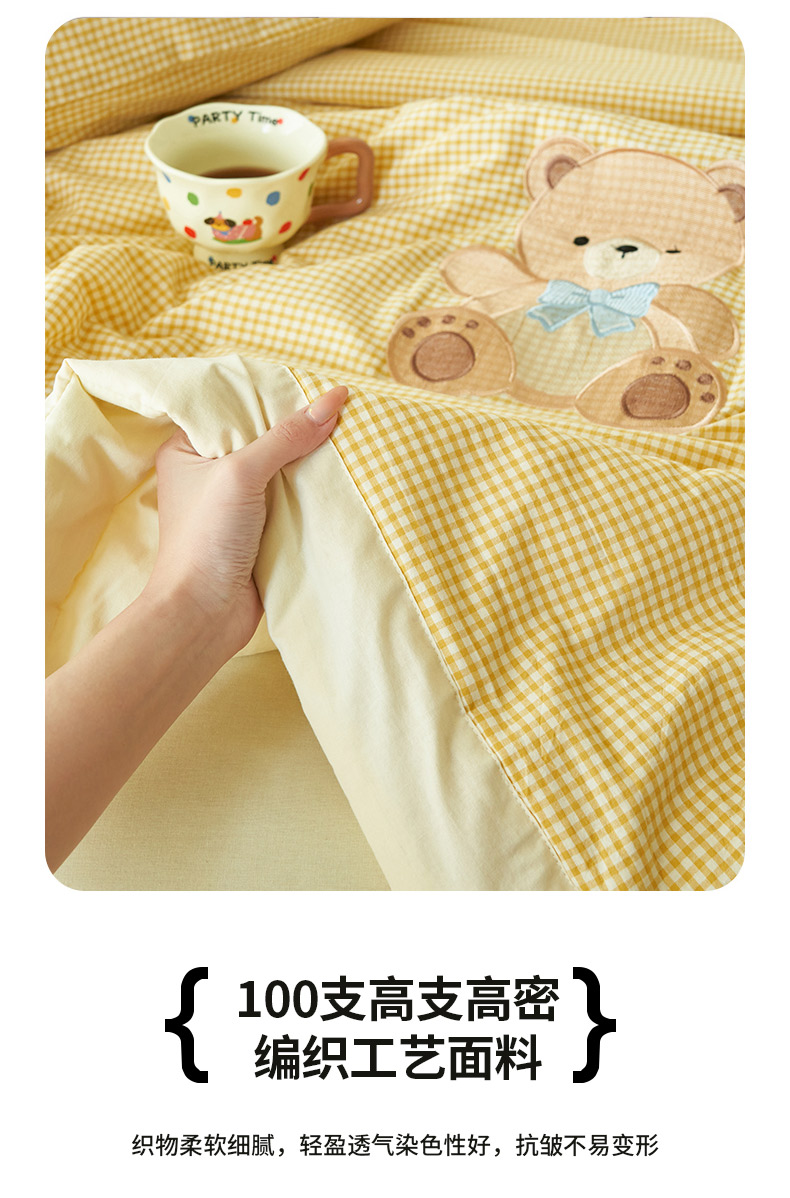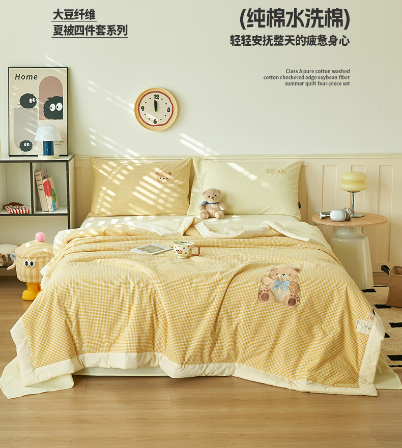 • 91家纺网 家纺一手货源 找家纺 寐绸家纺 2025新款纯棉水洗棉微米格小熊款大豆纤维夏被四件套 小熊-米黄