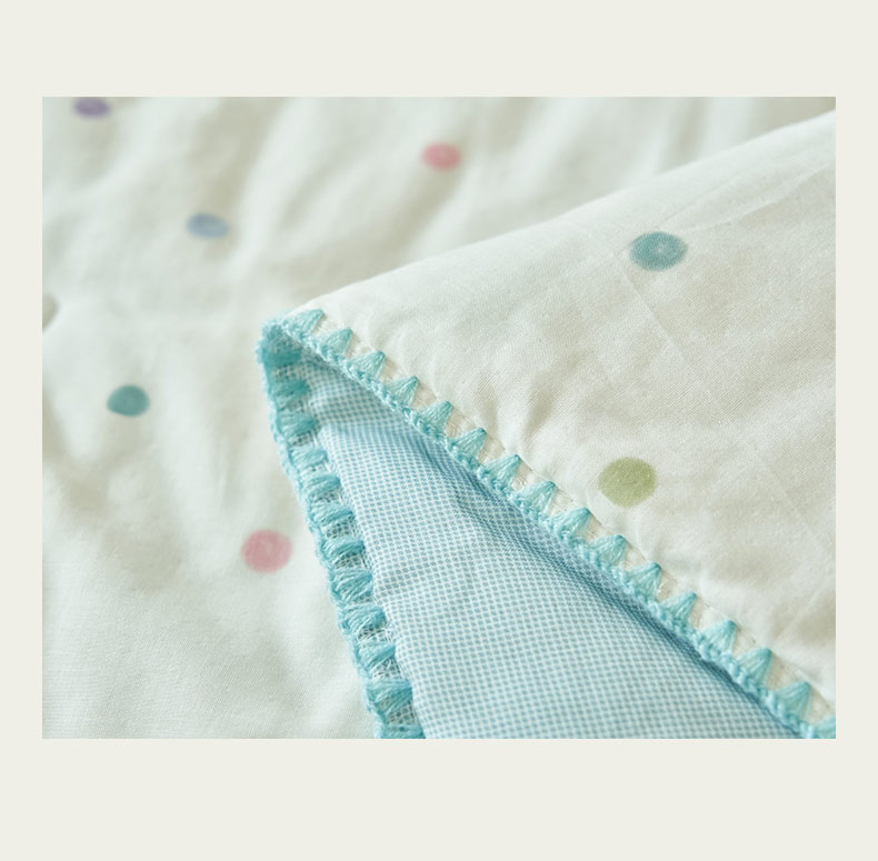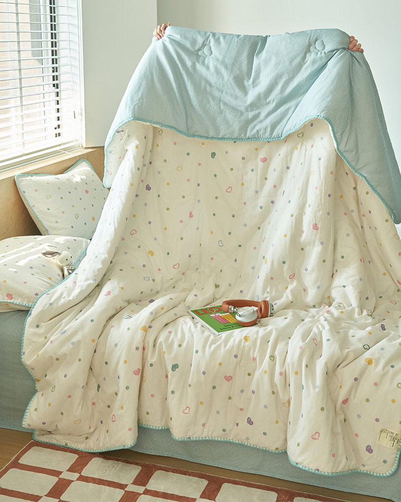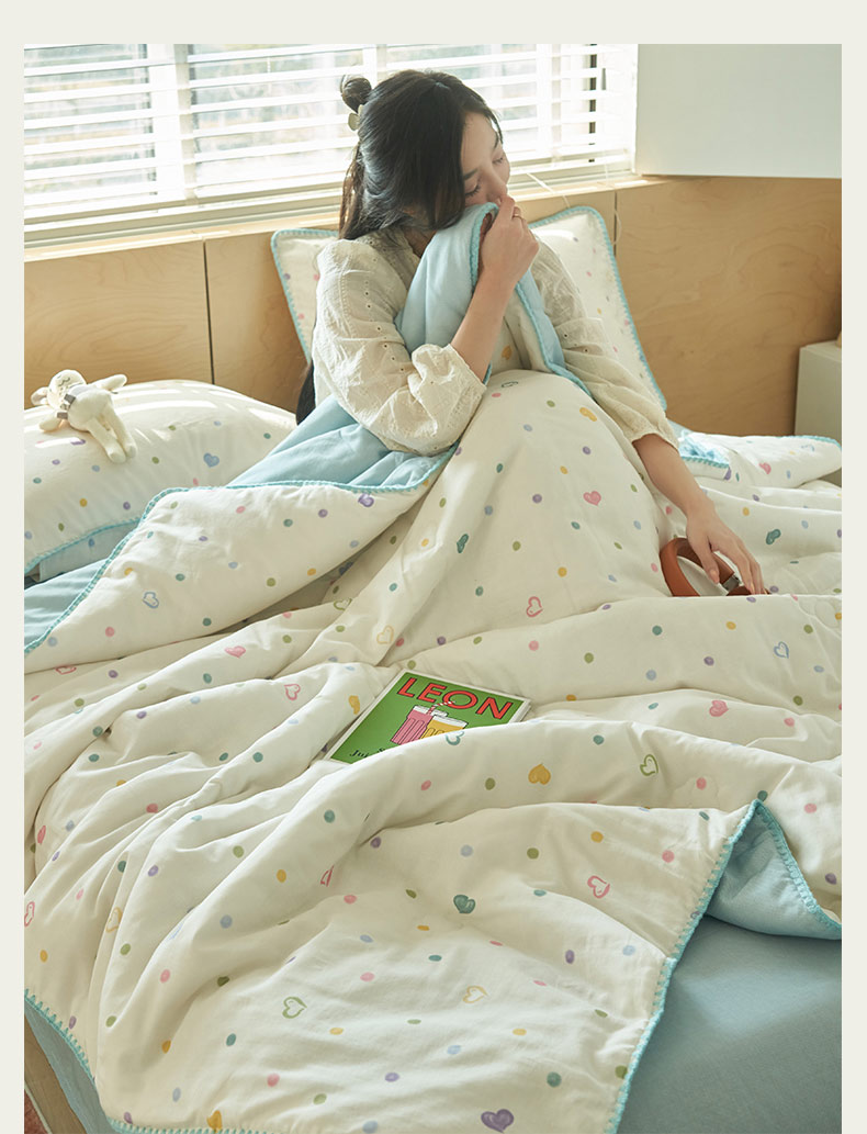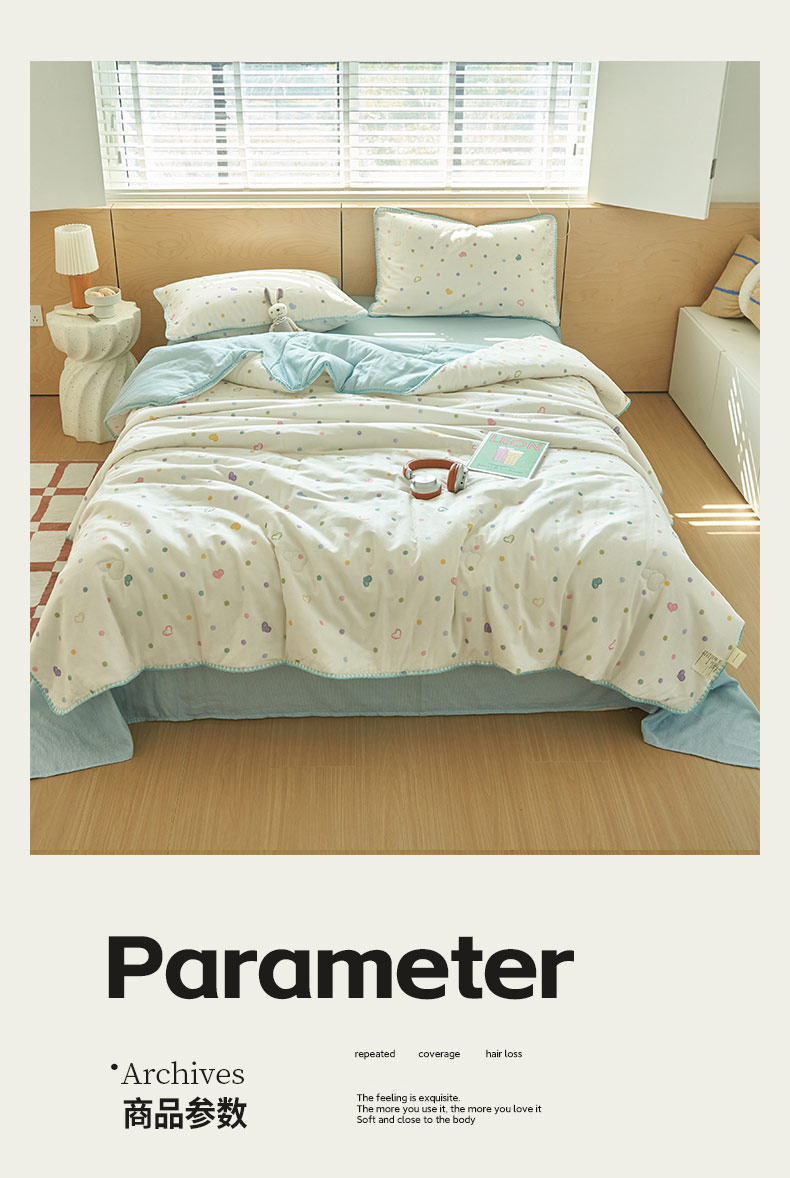 • 91家纺网 家纺一手货源 找家纺 寐绸家纺 2025新款纯棉双层纱印花大豆纤维夏被四件套 双层纱-爱心