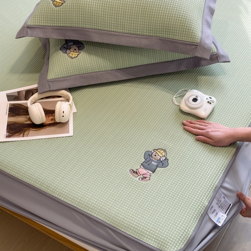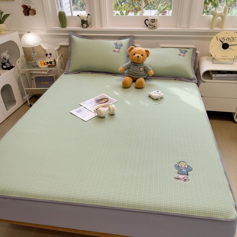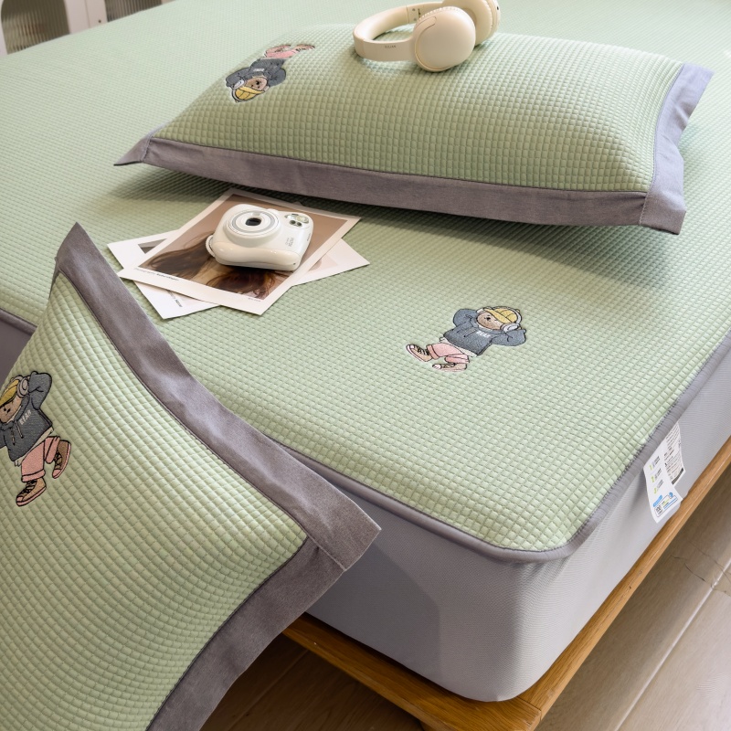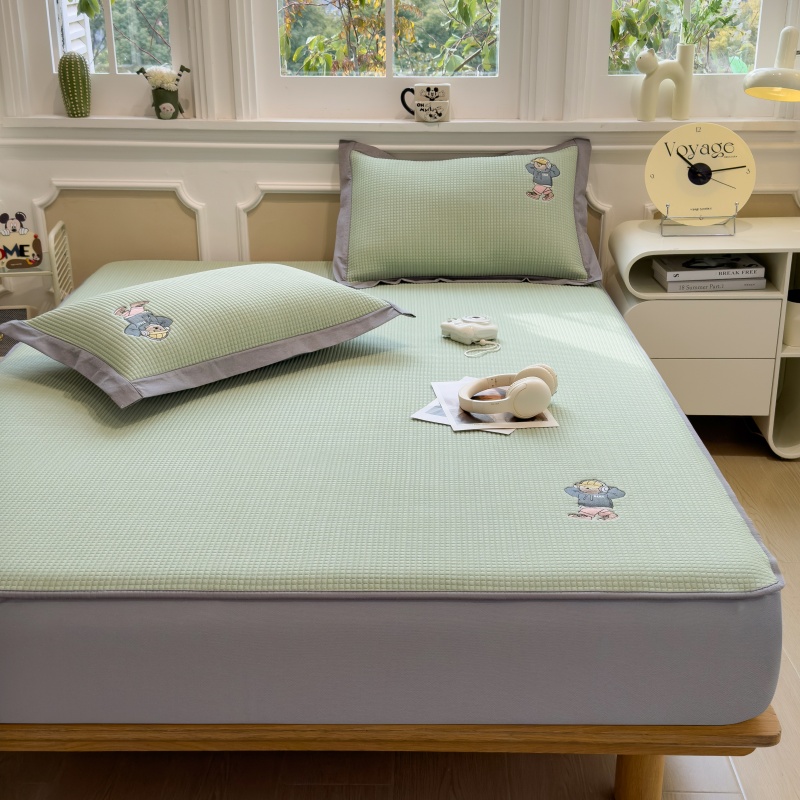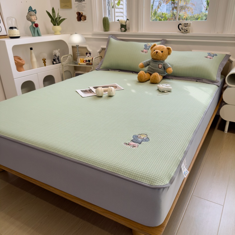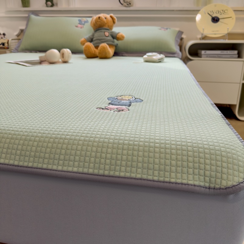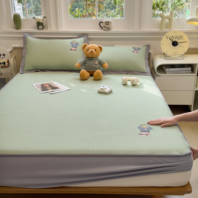 • 91家纺网 家纺一手货源 找家纺 孩子王家纺 2025新款冰豆豆华夫格绣花床单床笠-练练熊系列 果绿床笠