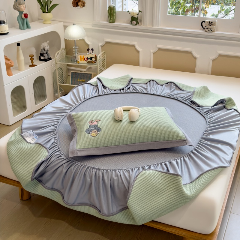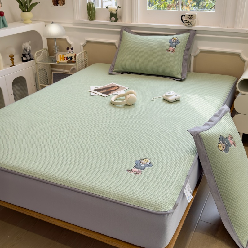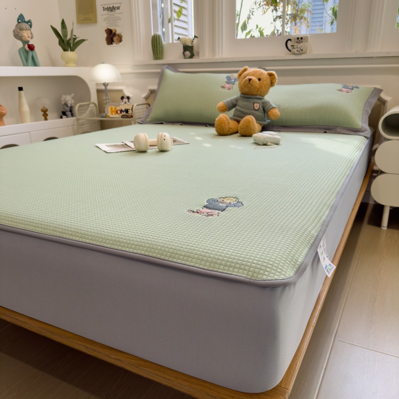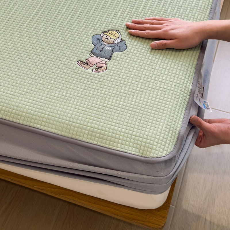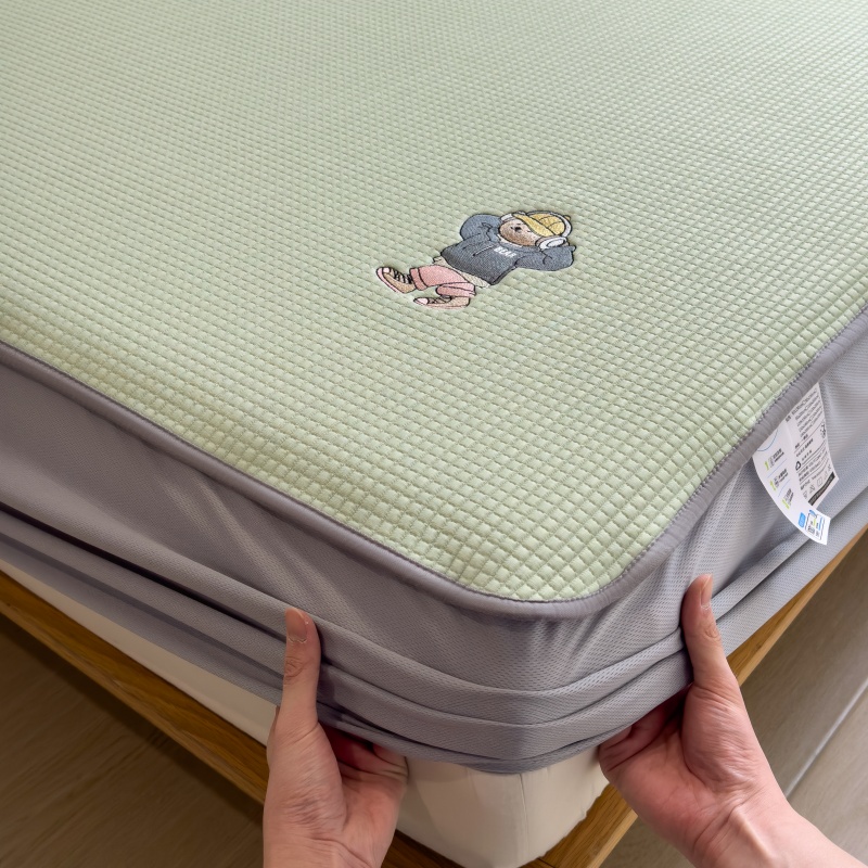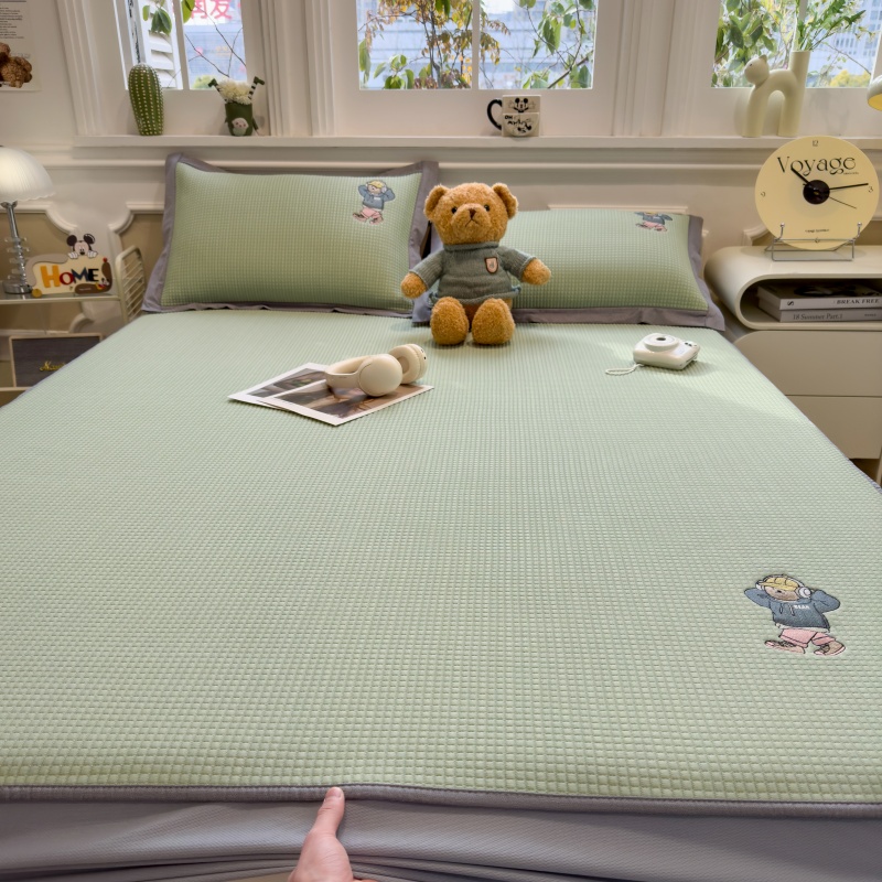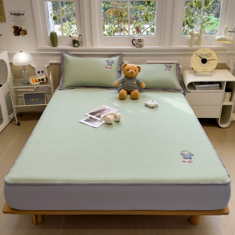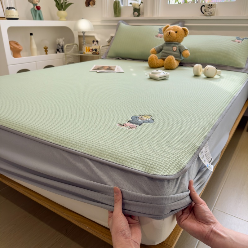 • 91家纺网 家纺一手货源 找家纺 孩子王家纺 2025新款冰豆豆华夫格绣花床单床笠-练练熊系列 果绿床笠
