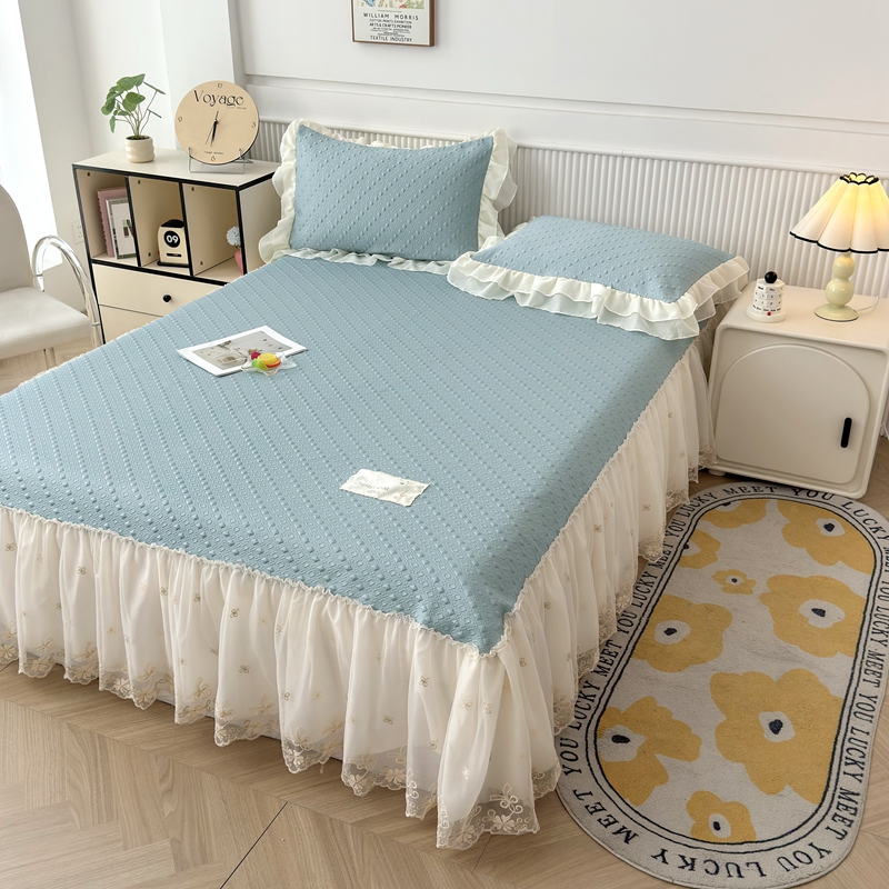 家维家纺 2025新款PE凉豆豆凉席多功能双层刺绣花边床盖三件套 天空蓝