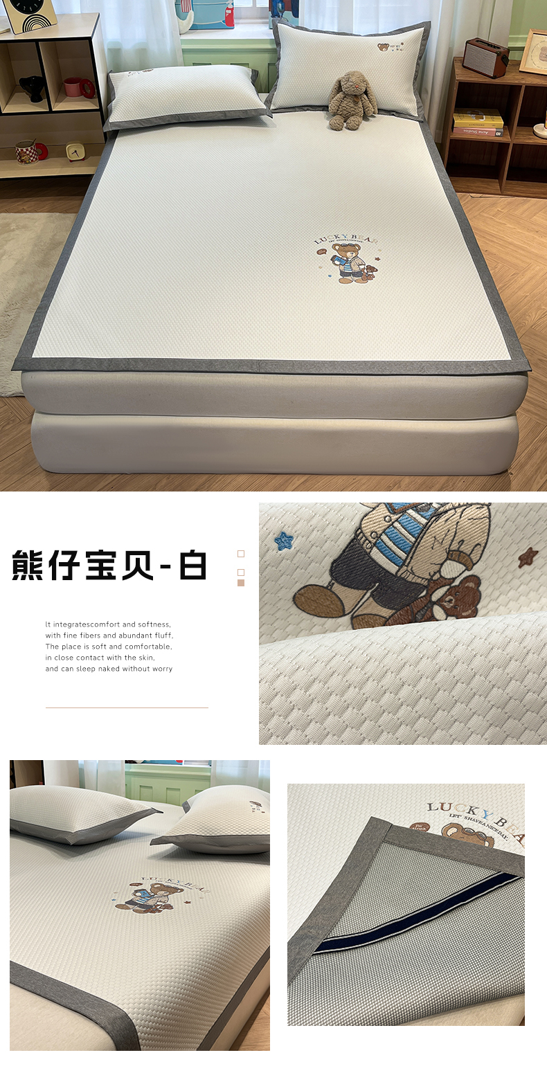 商品名称:启程家纺 2025春夏新款冰豆豆凉席刺绣款复合三明治三件套 熊仔宝贝-白