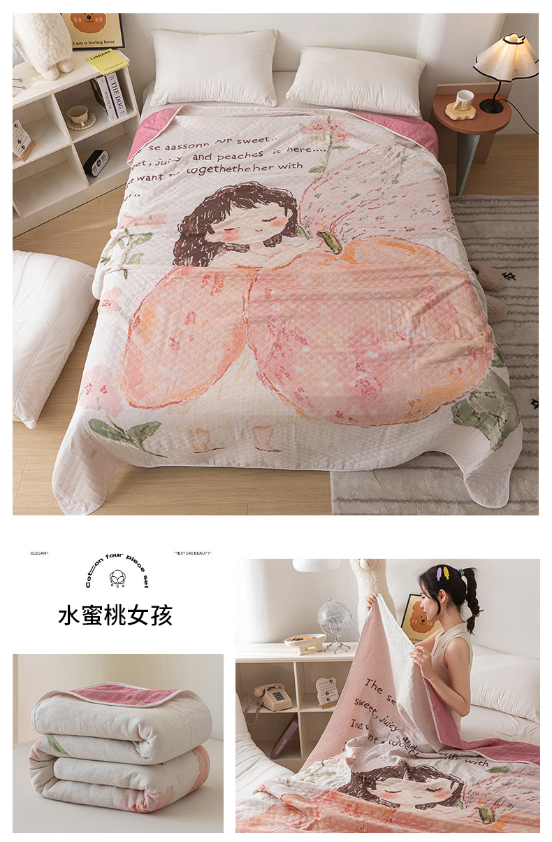 商品名称:乐家毛巾被 2025春夏新款全棉纯棉六层大版印花毛巾被 水蜜桃女孩