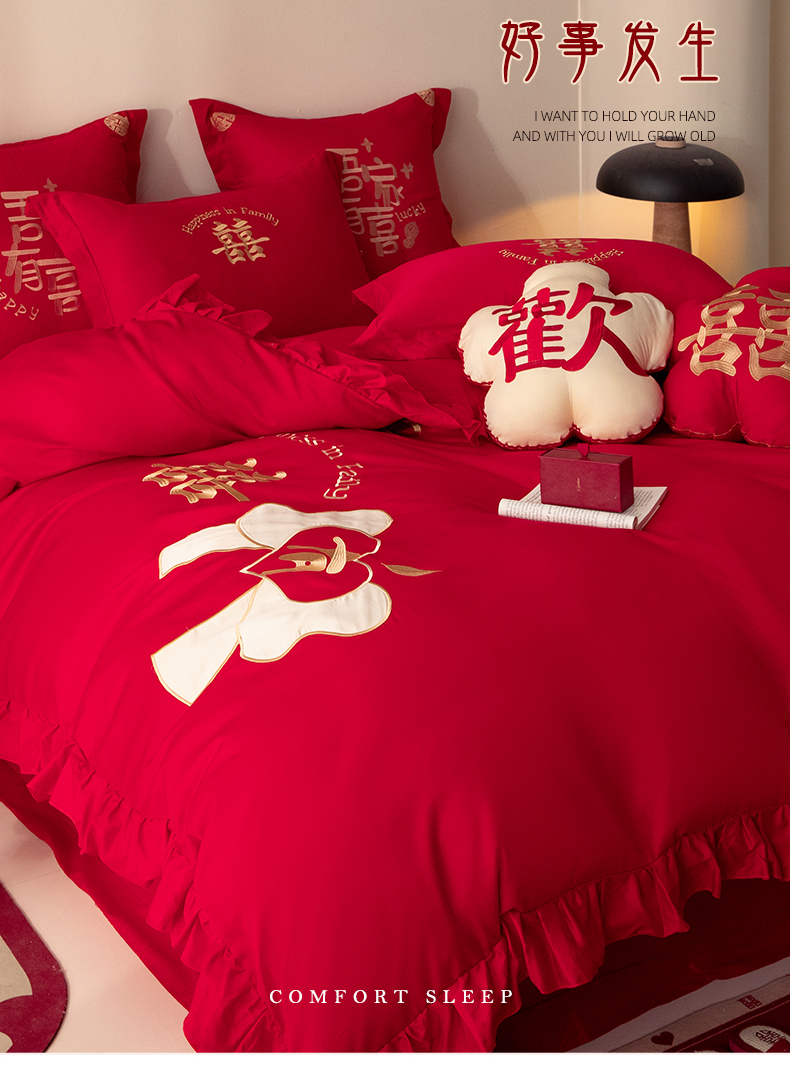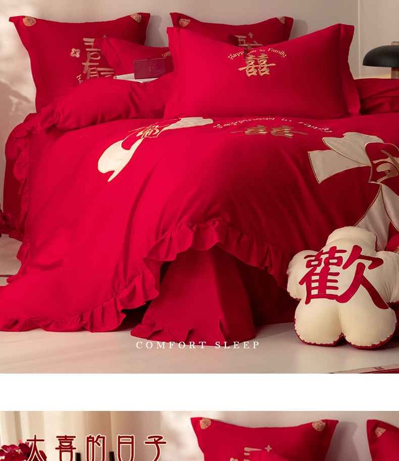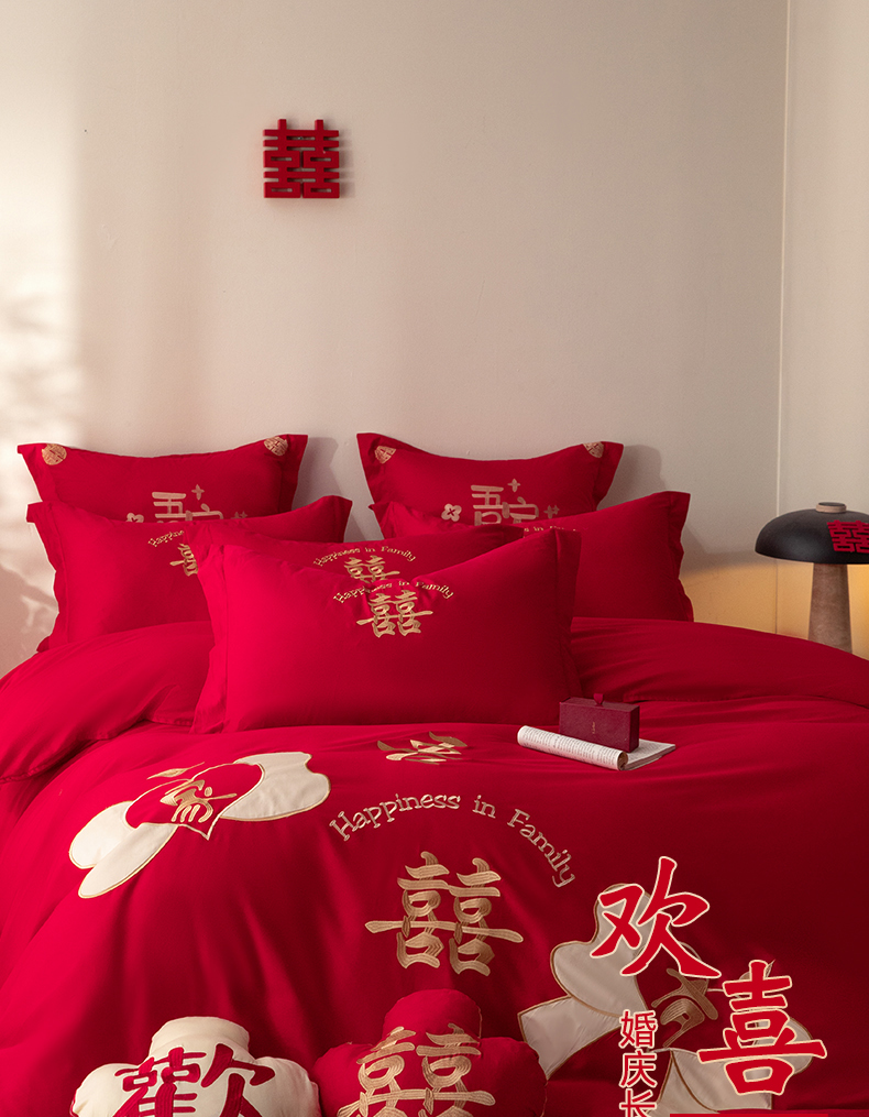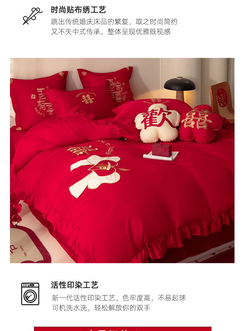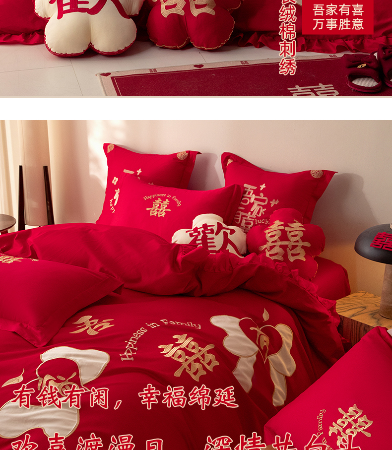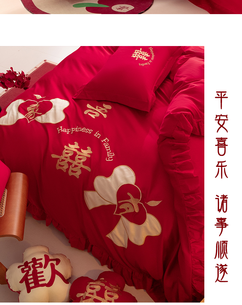 当前位置: 91家纺网 > 商品网购 > 床品套件 > 四件套 > 长绒棉四件套 > 玉雅家纺 2025新款长绒棉花边款刺绣时尚婚庆四件套 花边款-同心缘-红