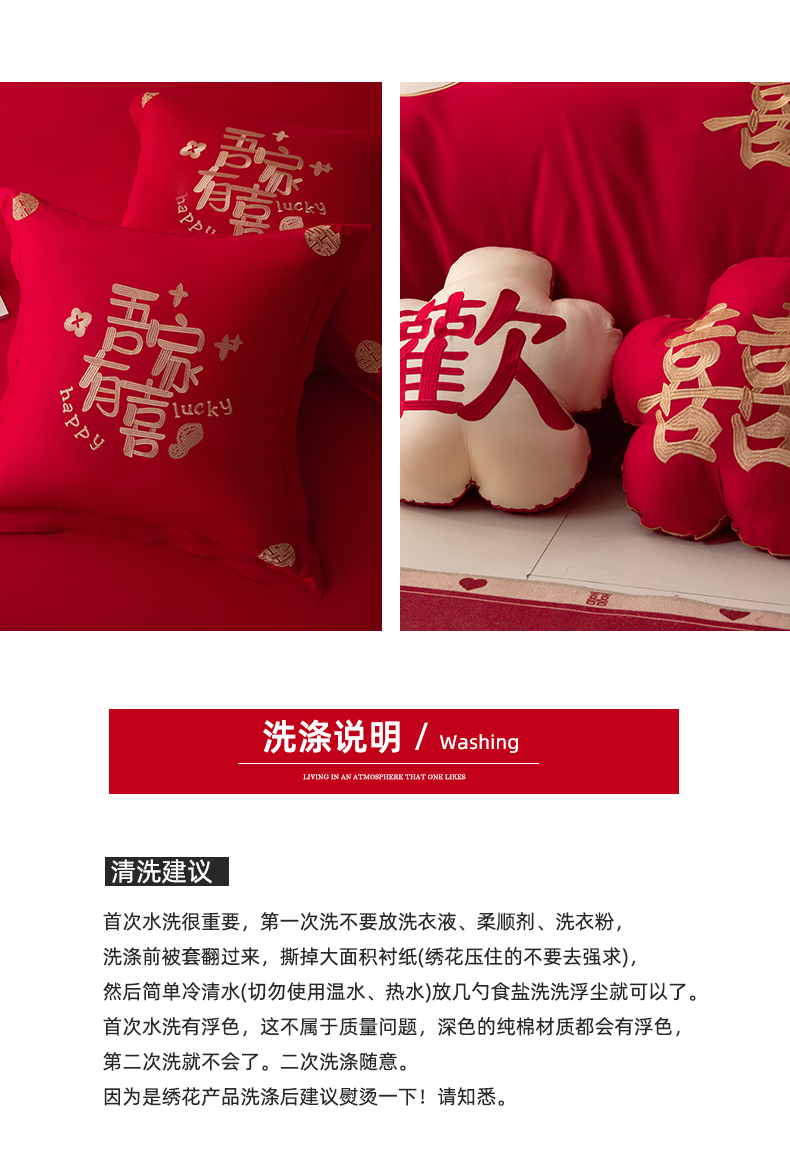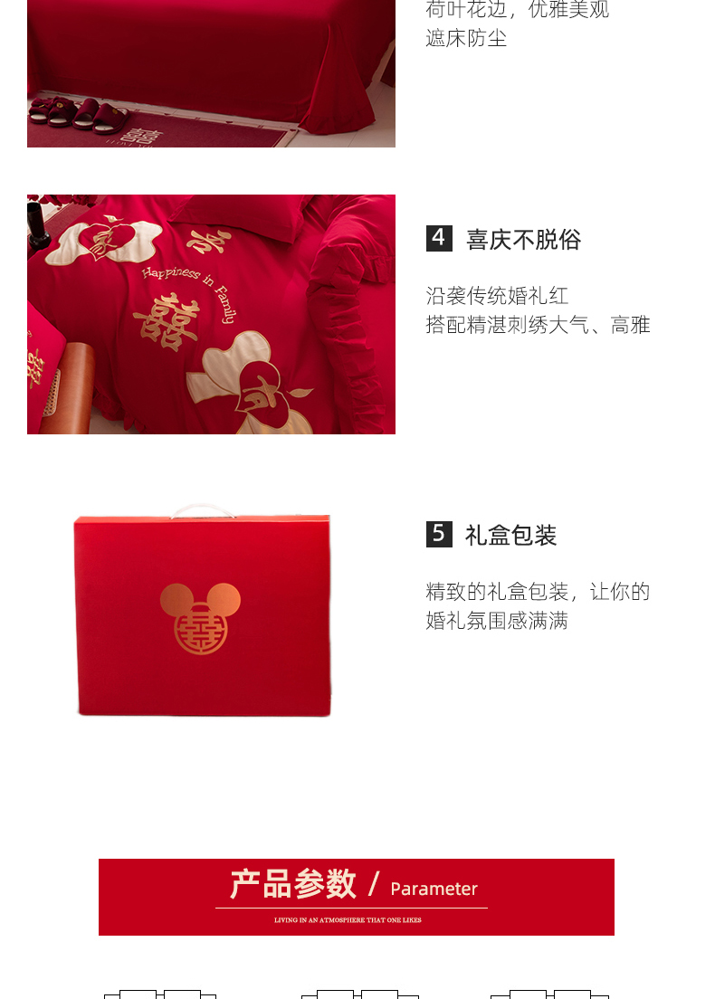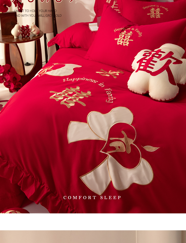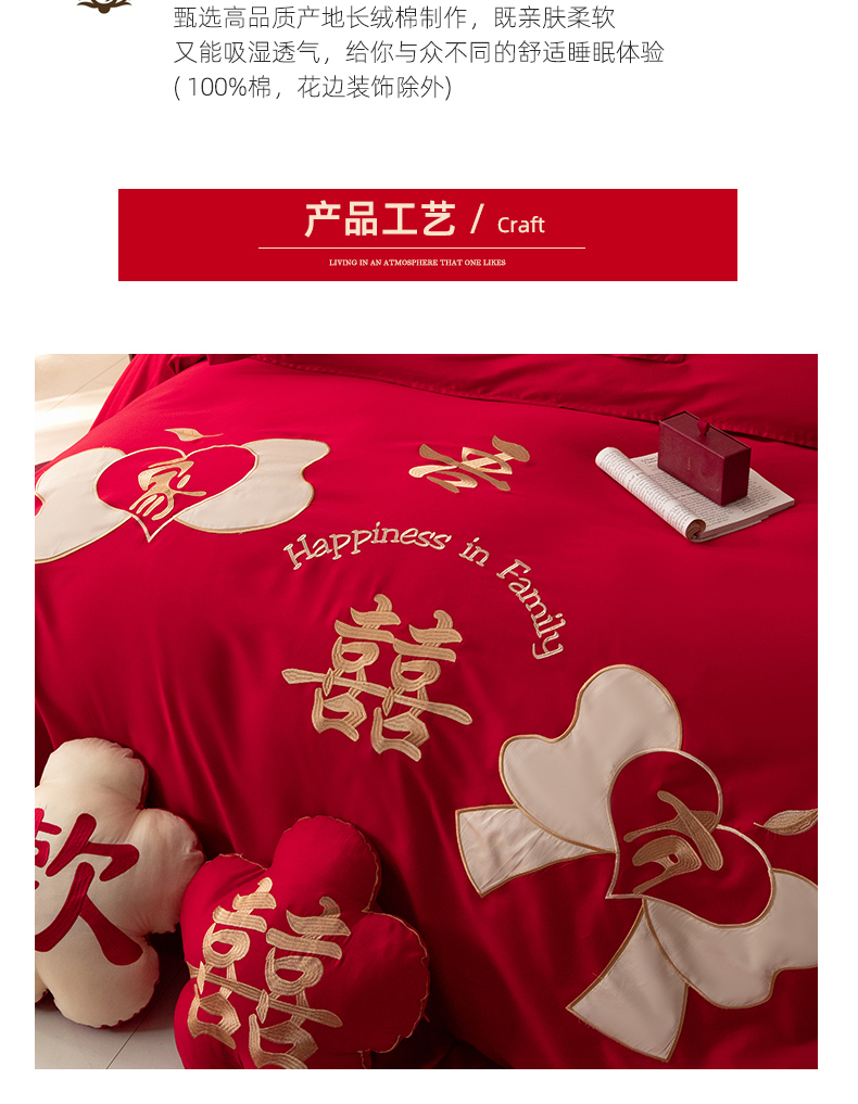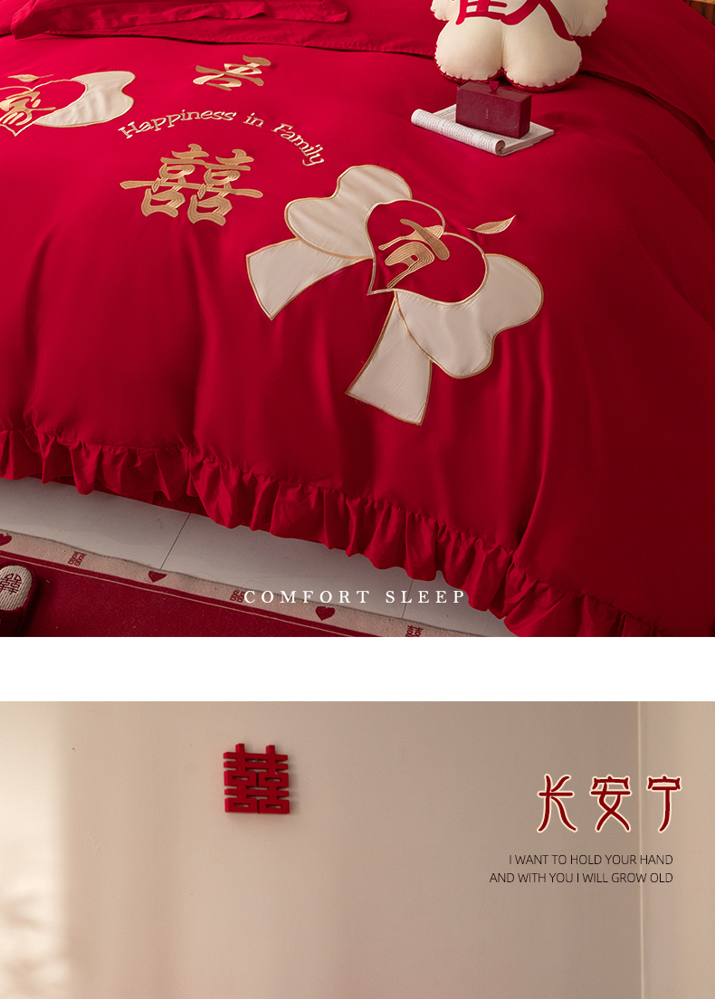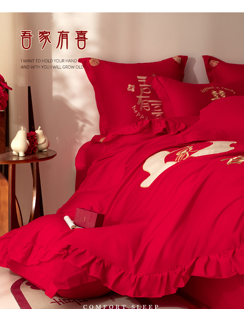 当前位置: 91家纺网 > 商品网购 > 床品套件 > 四件套 > 长绒棉四件套 > 玉雅家纺 2025新款长绒棉花边款刺绣时尚婚庆四件套 花边款-同心缘-红